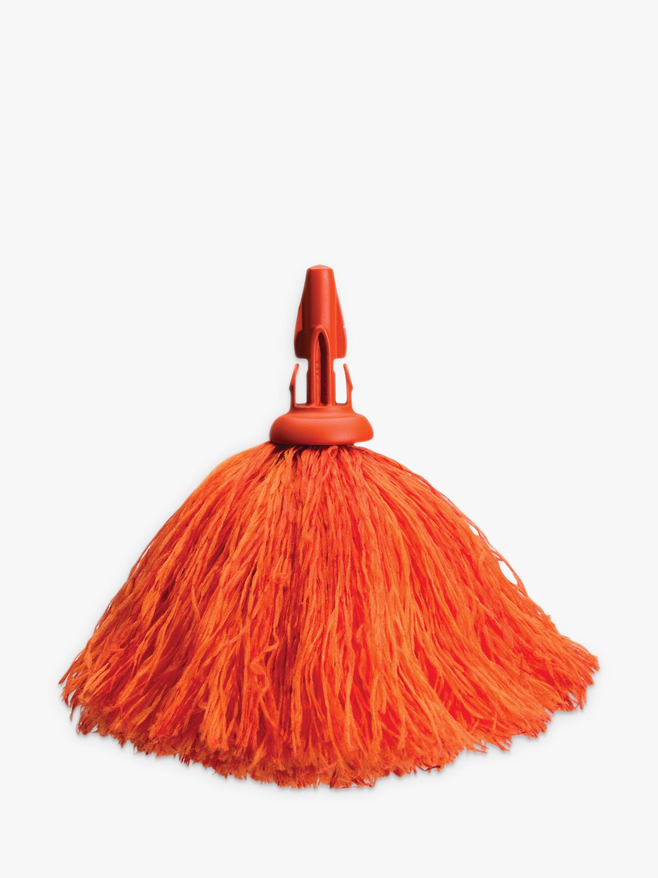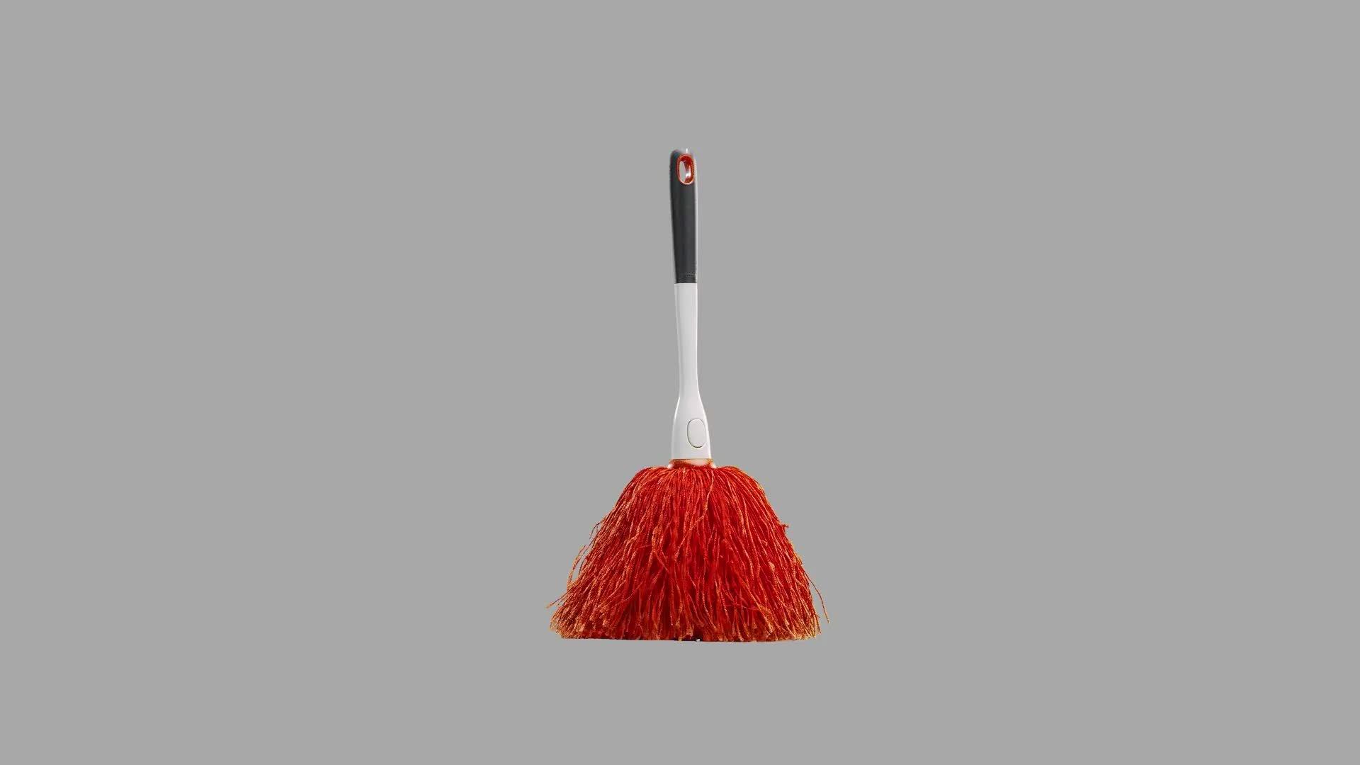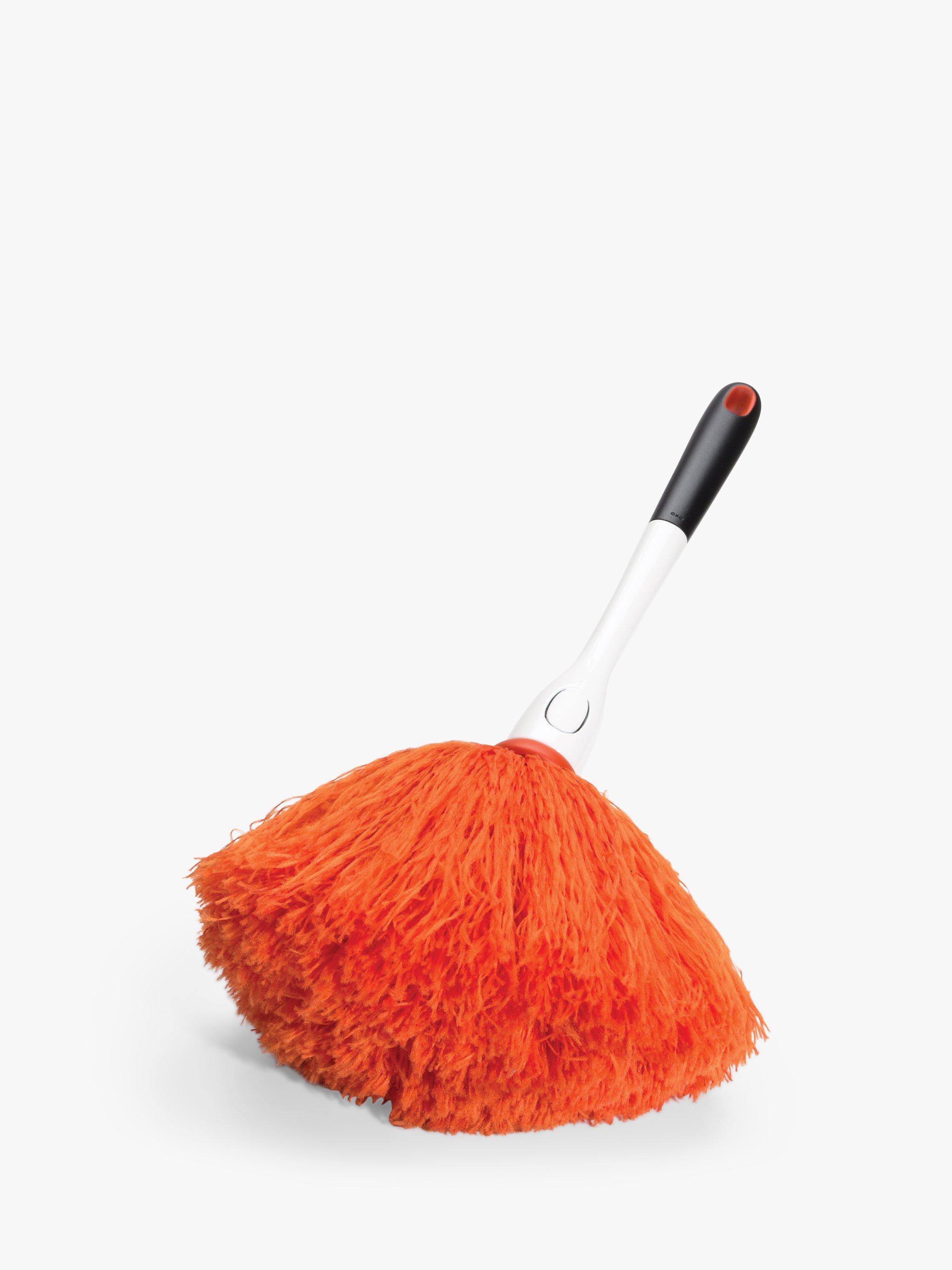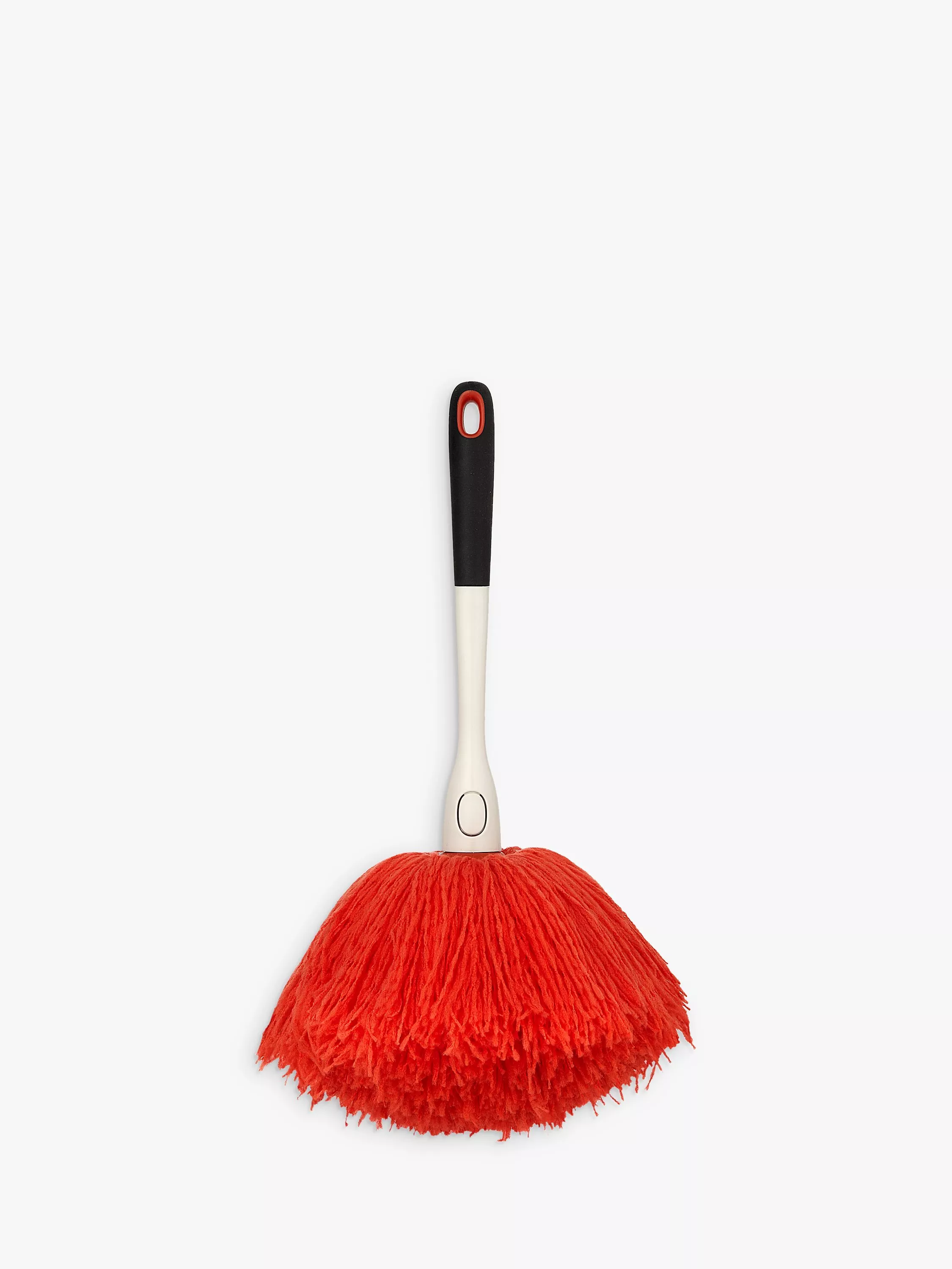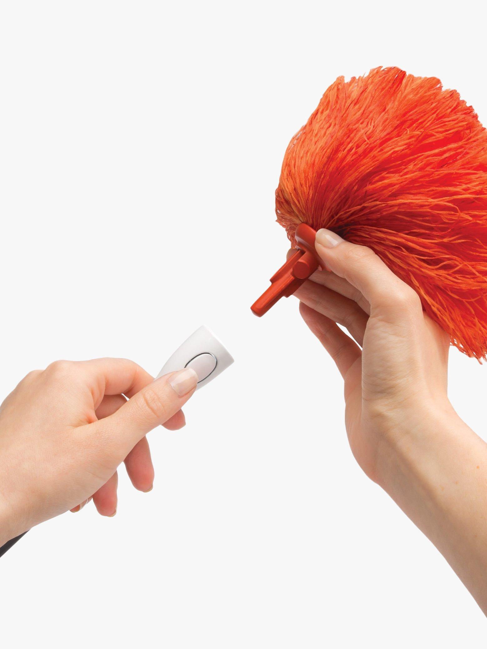 The Delicate Duster's microfibre strands trap and hold dust without the need for cleaning chemicals. The soft, comfortable handle and light, fluffy head make it easy to dust picture frames and other delicate items. After dusting, the machine-washable head pops off with a push of a button.