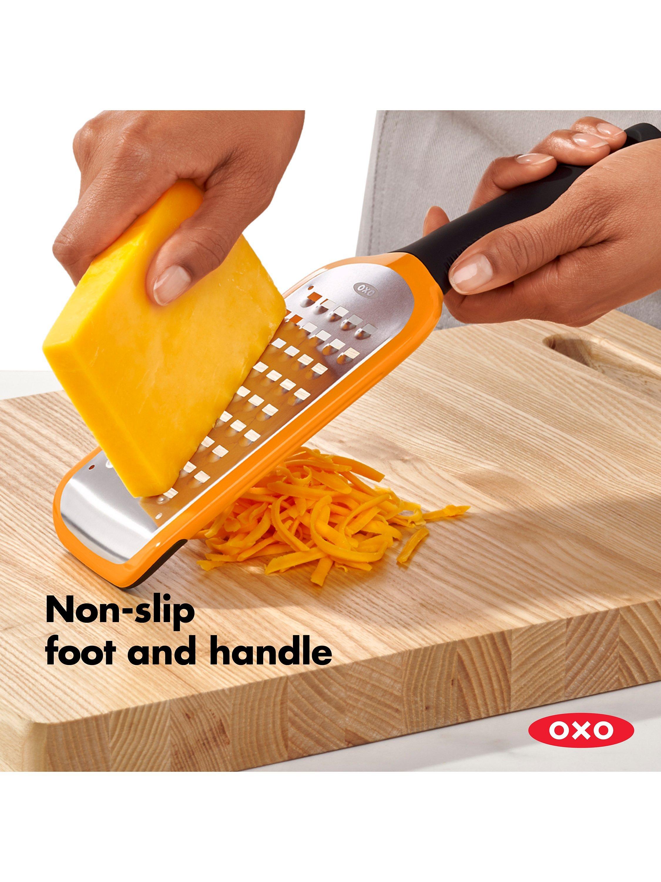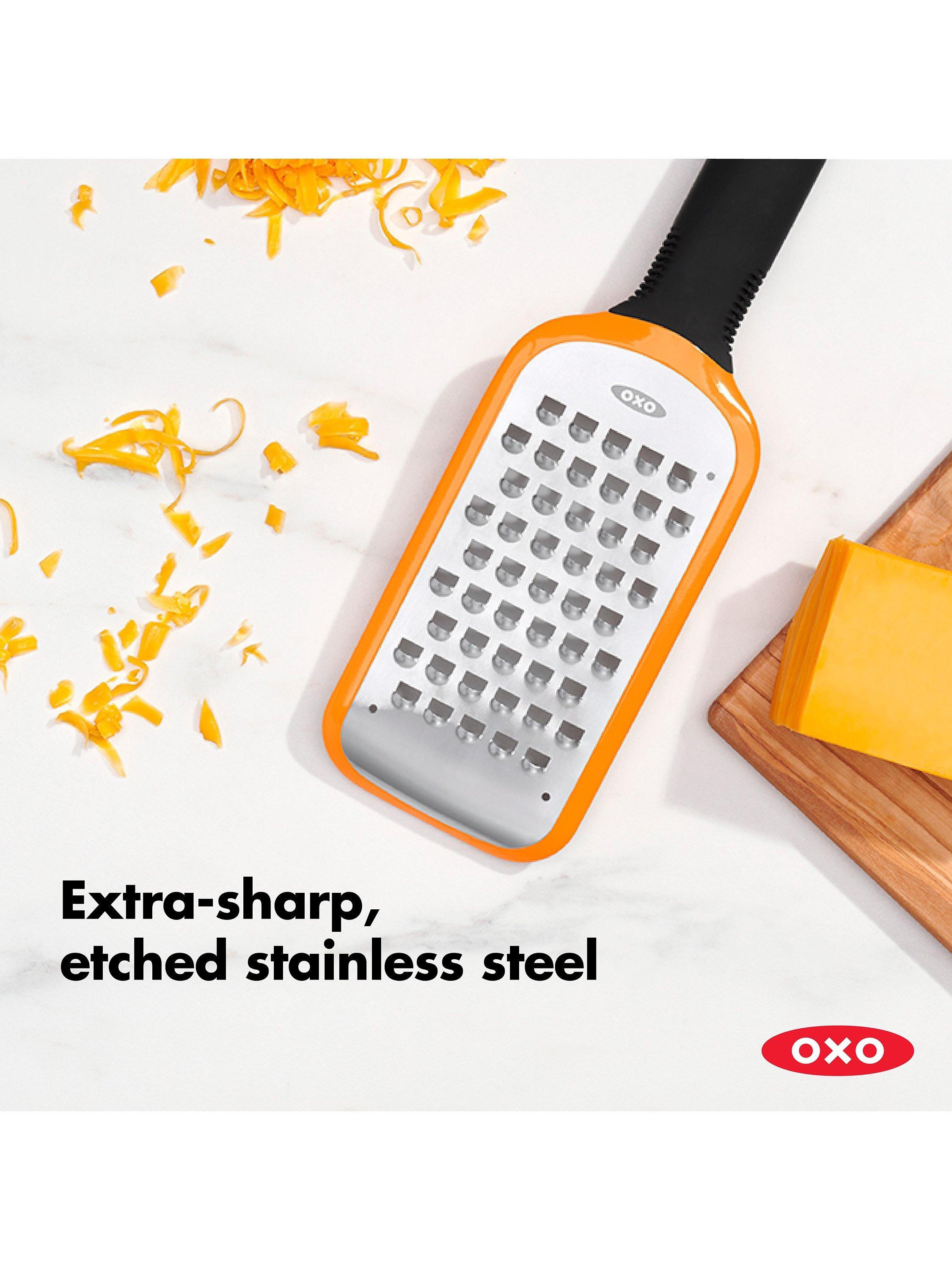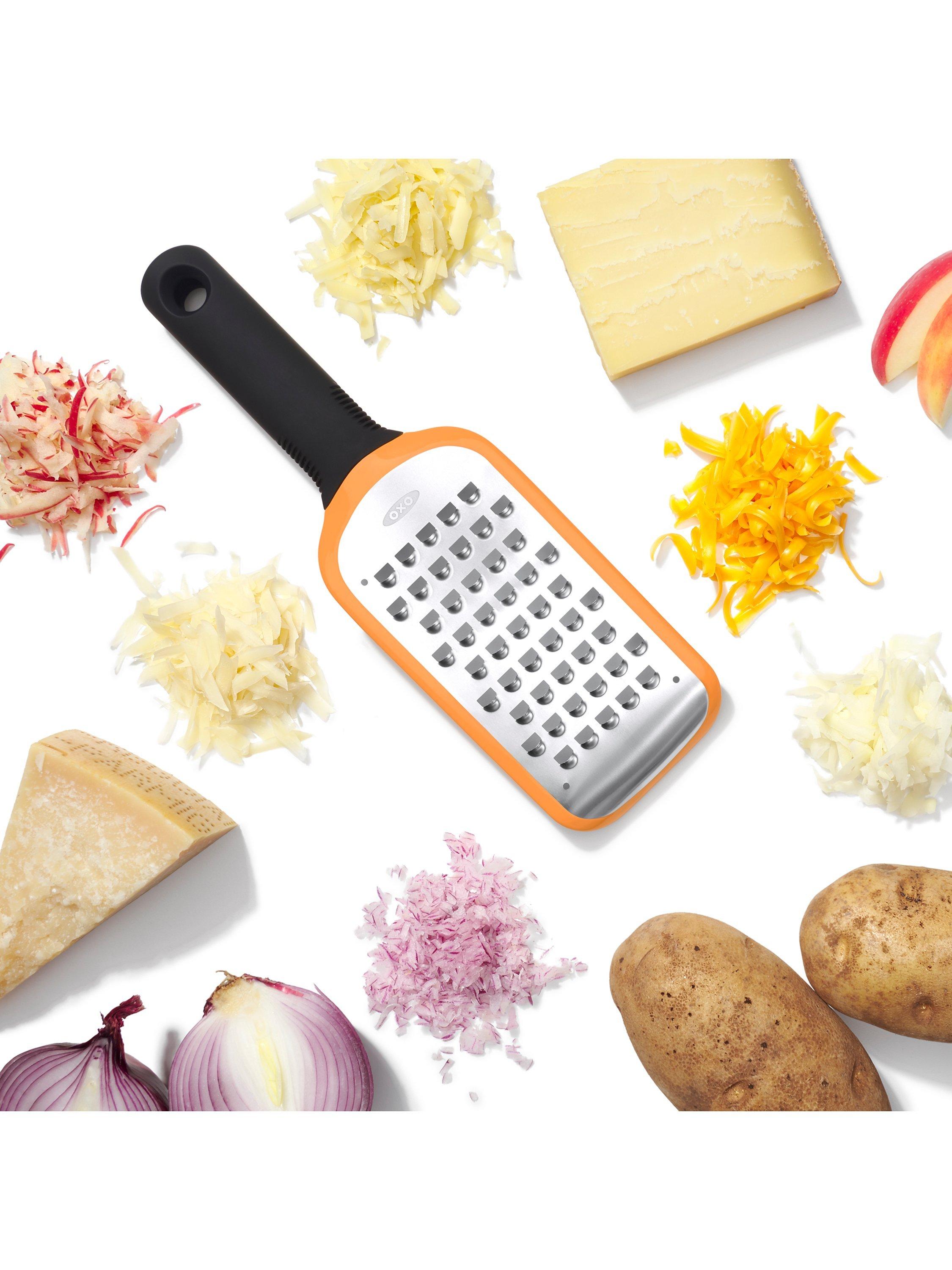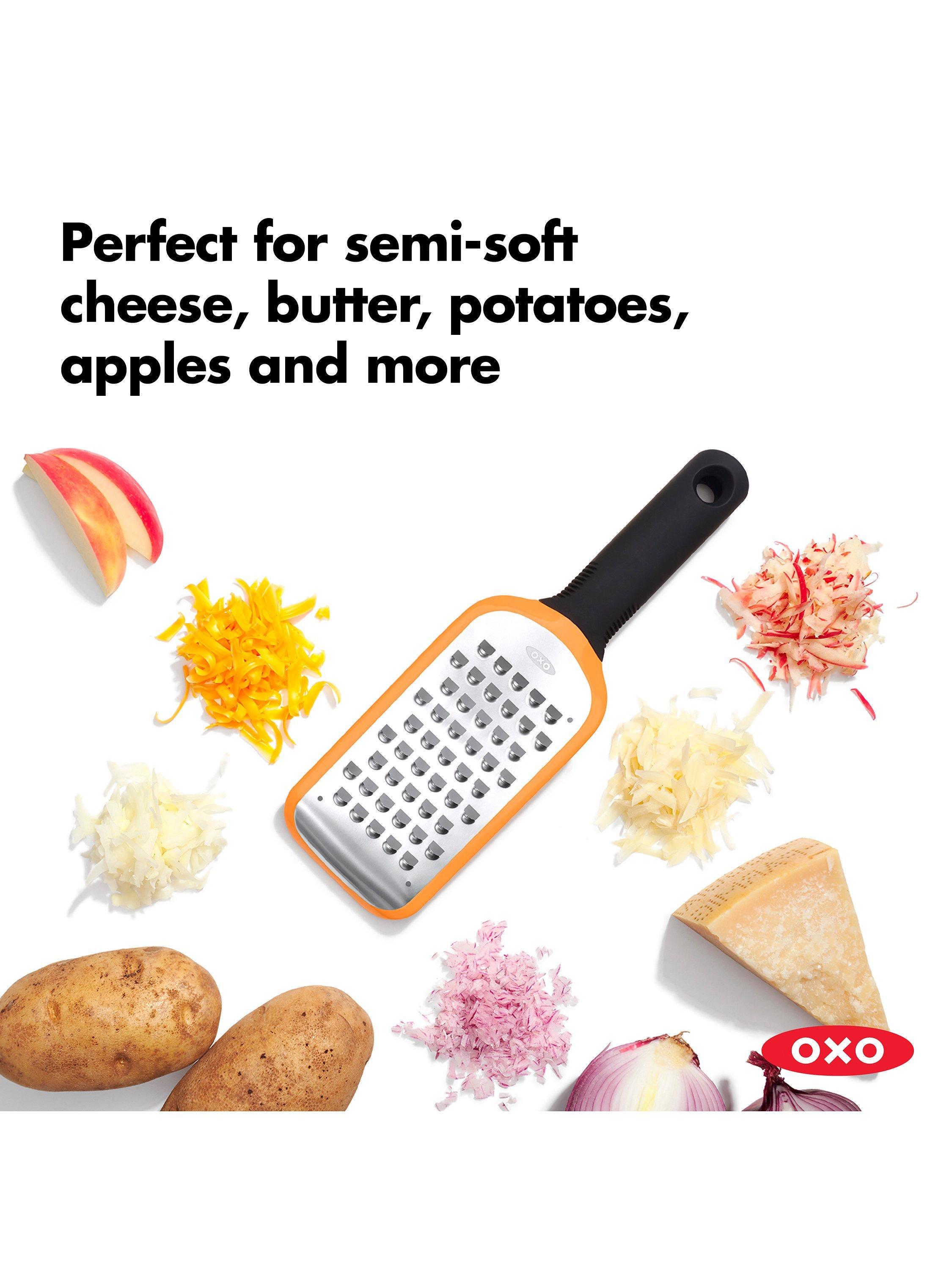 This OXO Good Grips Coarse Etched Grater makes easy work of grating potatoes, semi-soft cheeses, zucchini, onions, butter, and apples. Comfortable soft handle offers a secure, slip-free grip while a non-slip foot provides added control during use.