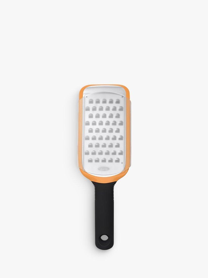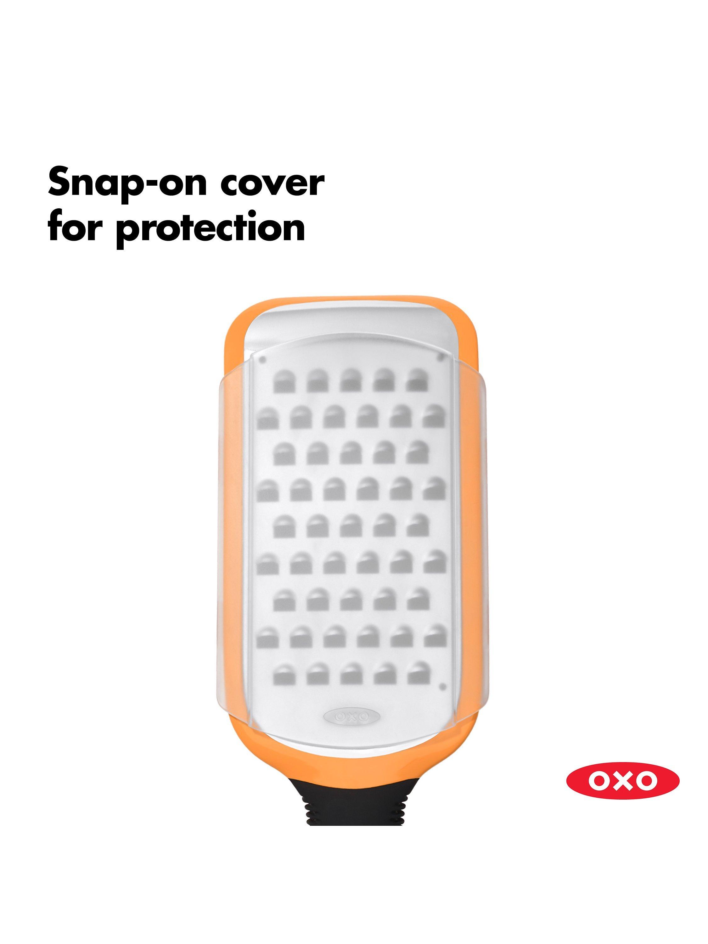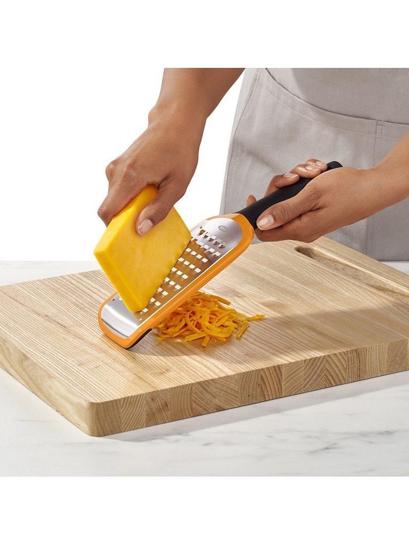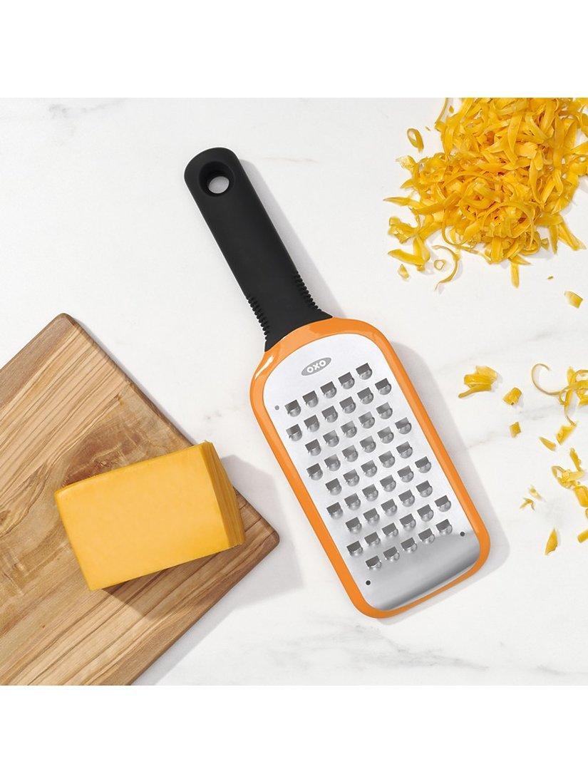 This OXO Good Grips Coarse Etched Grater makes easy work of grating potatoes, semi-soft cheeses, zucchini, onions, butter, and apples. Comfortable soft handle offers a secure, slip-free grip while a non-slip foot provides added control during use.