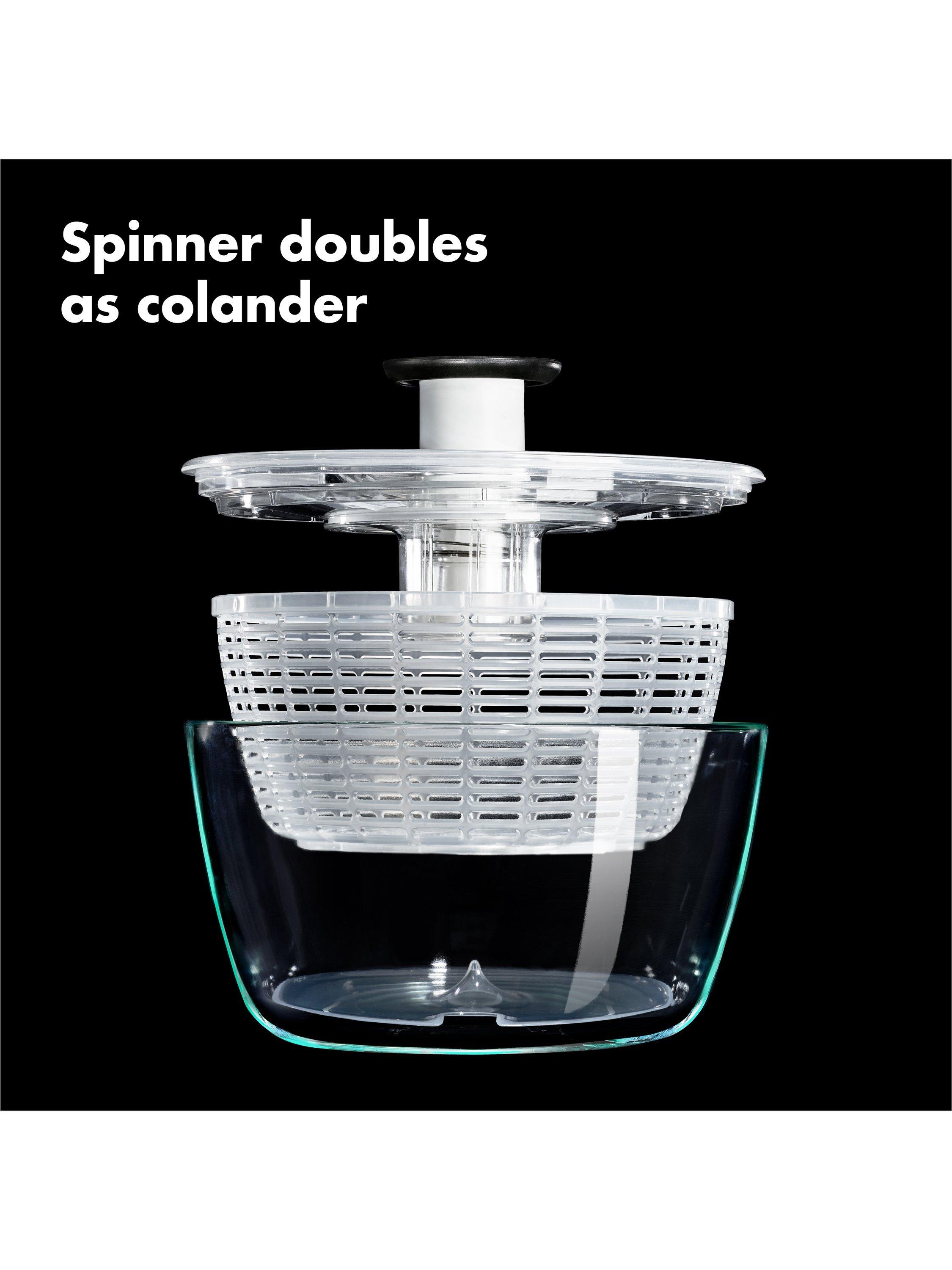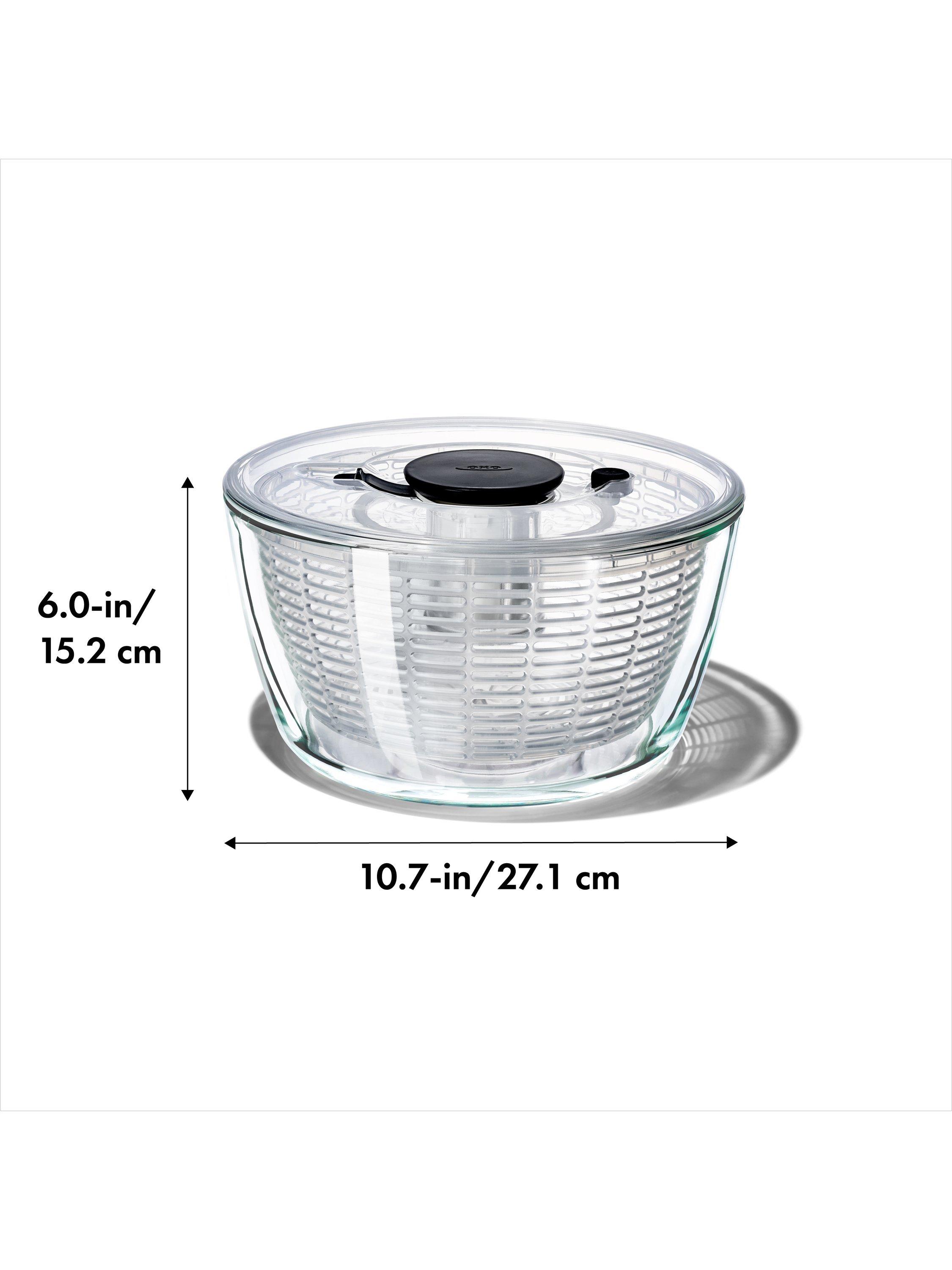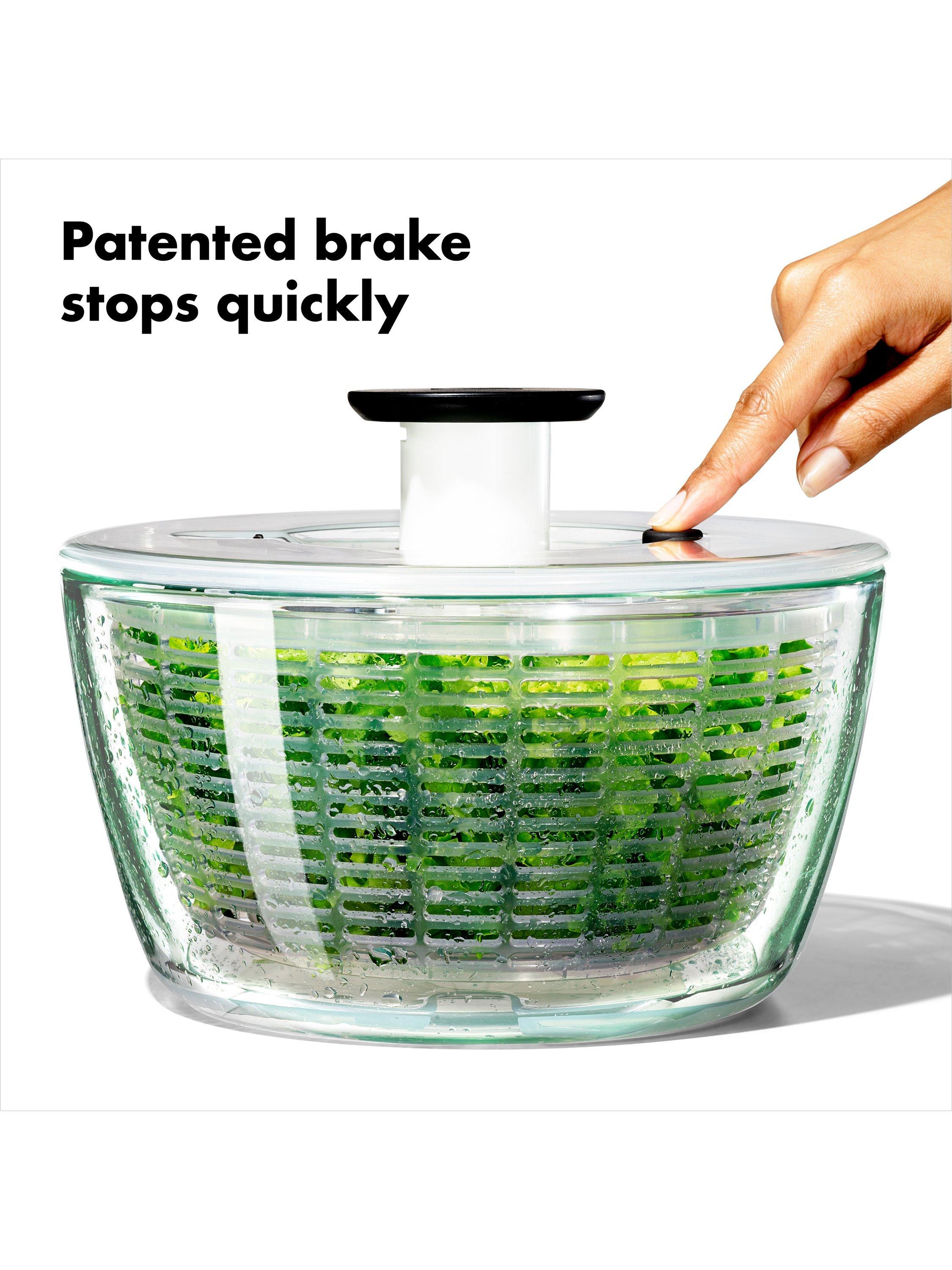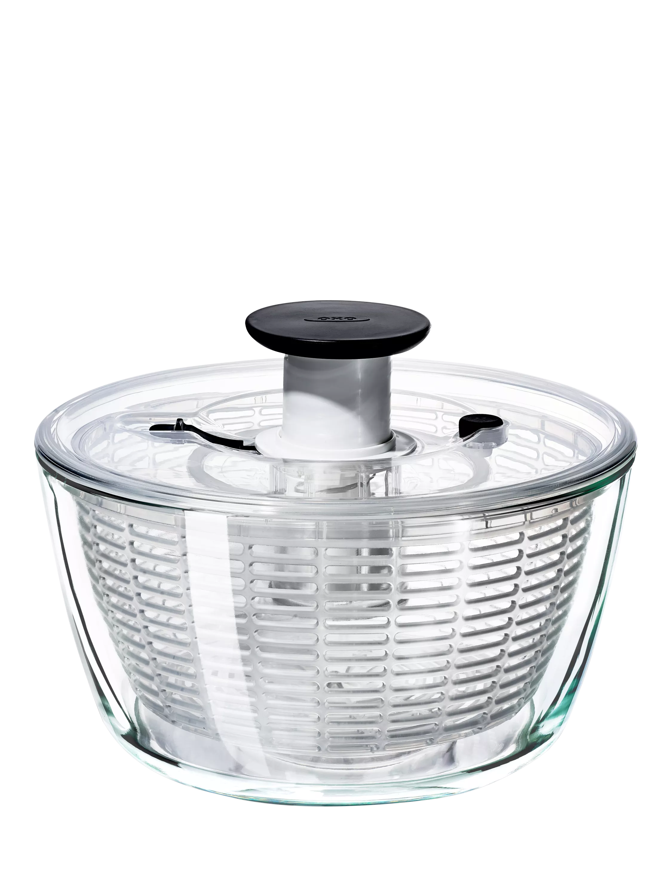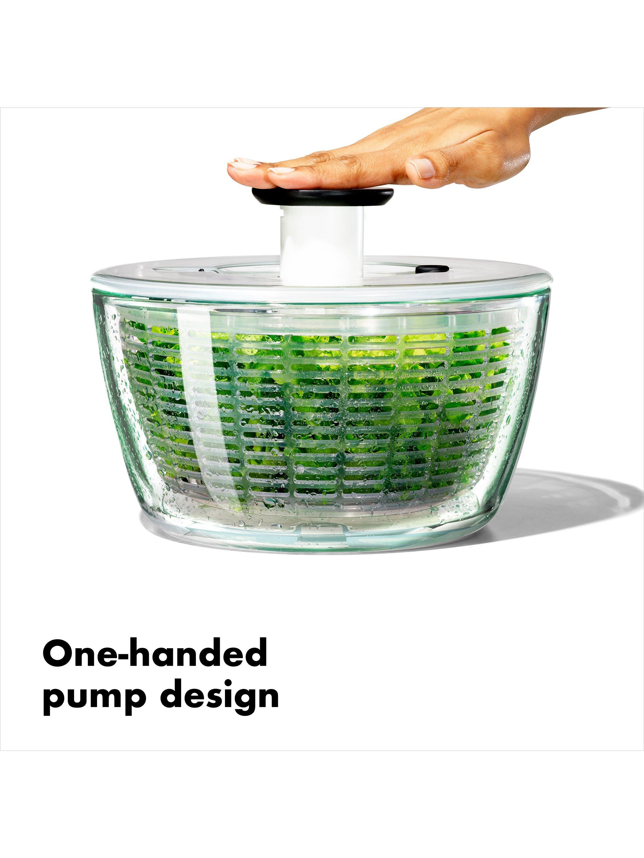 The OXO Good Grips Glass Salad Spinner is the quick and easy way to dry greens or herbs. Just press the soft, non-slip knob. The spinning basket doubles as a colander, so you can rinse lettuce and more with ease. The built-in brake button stops the spinner immediately ready for unloading. The one-handed pump maximises drying with minimum effort.