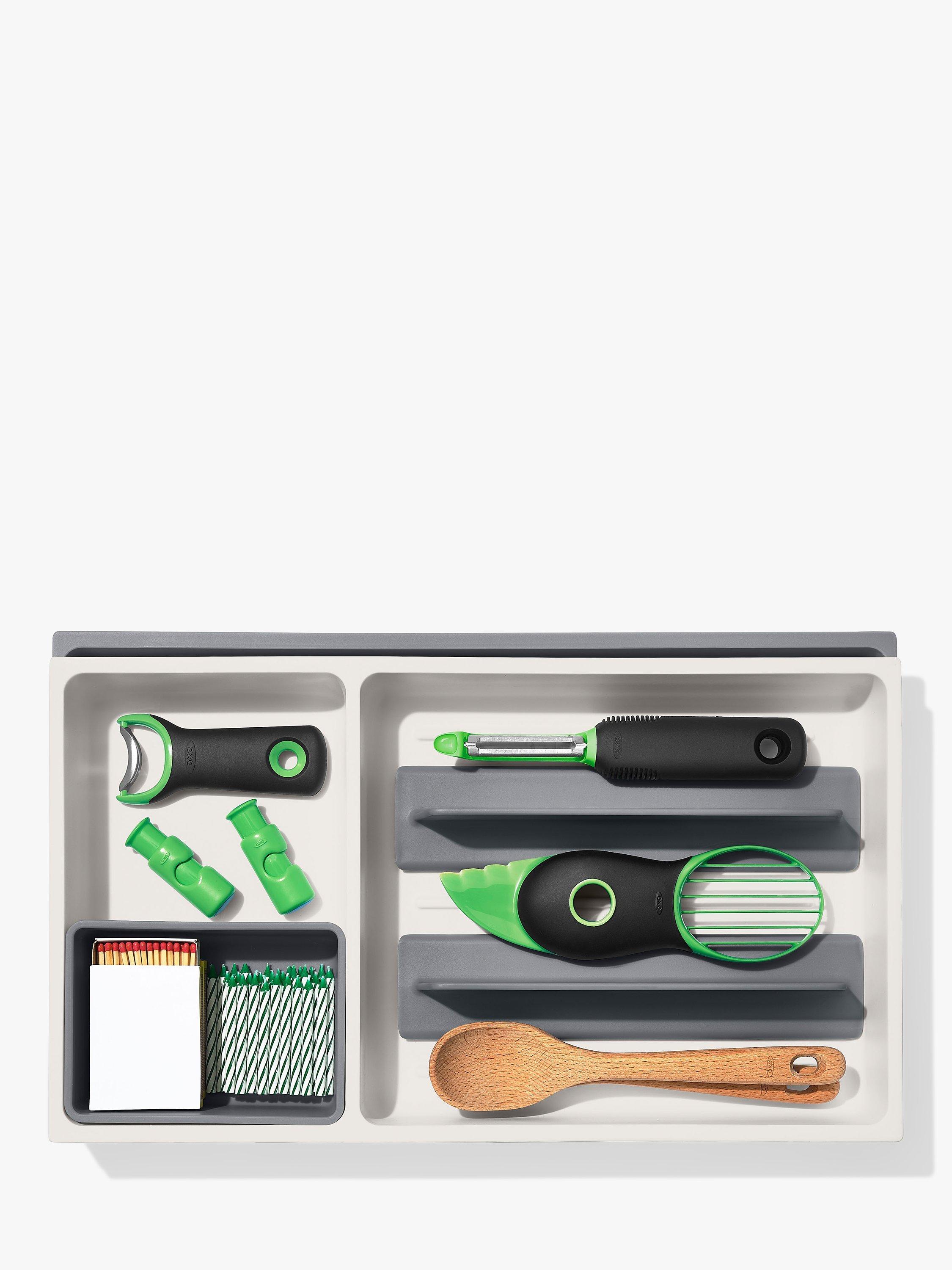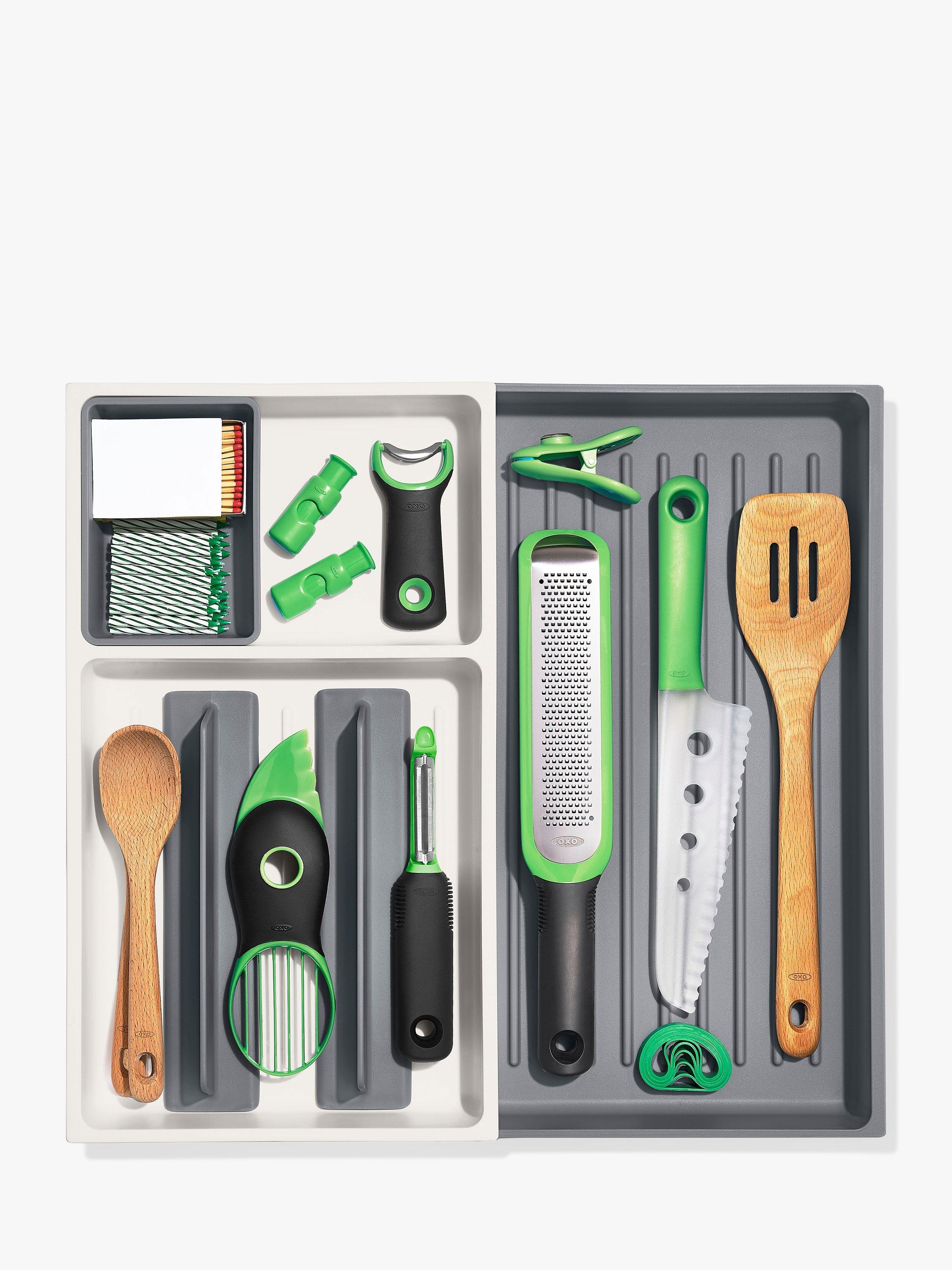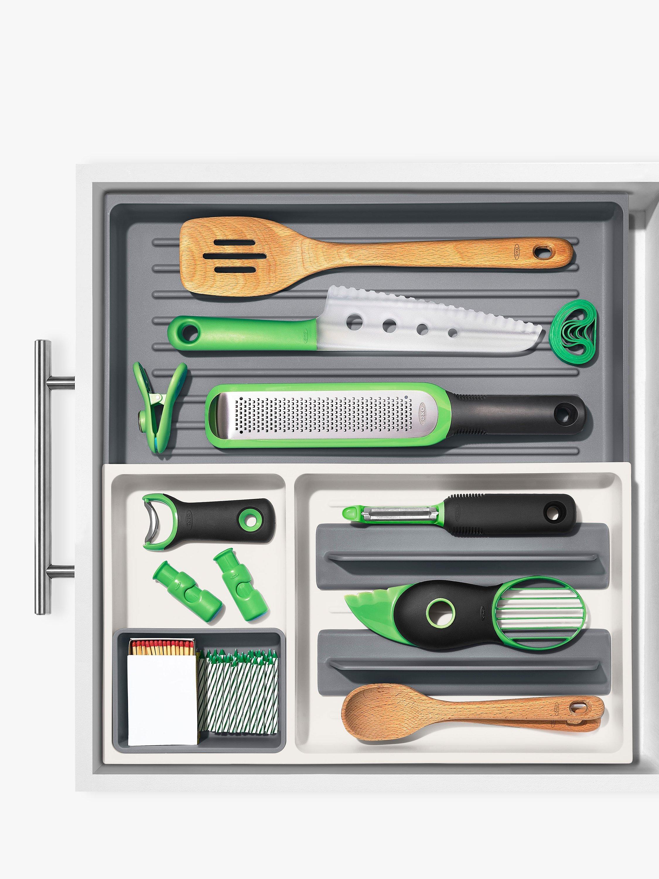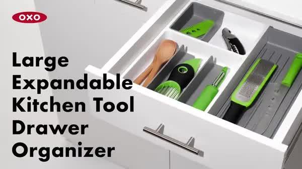 The OXO Good Grips Large Expandable Kitchen Tool Drawer Organizer helps you store tools with control. The extendable open area is perfect for irregular-shaped or long-handled utensils, and the adjustable dividers allow you to customize the organizer for your kitchen’s needs.