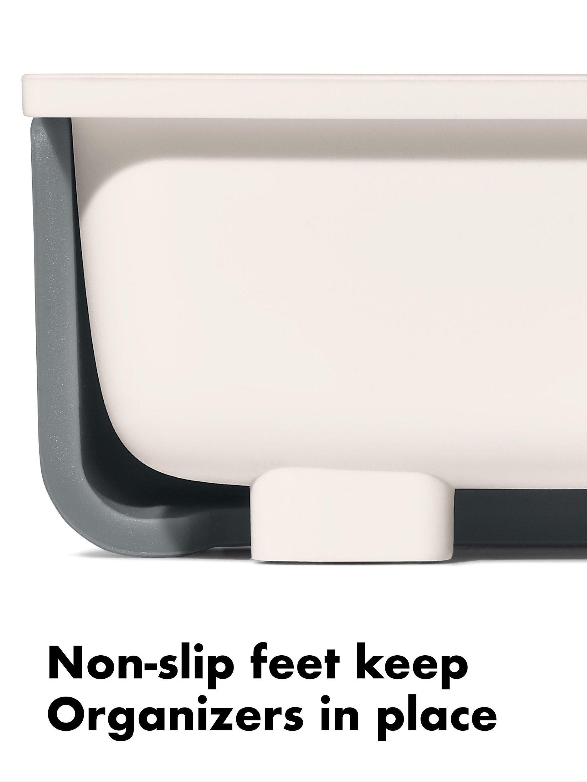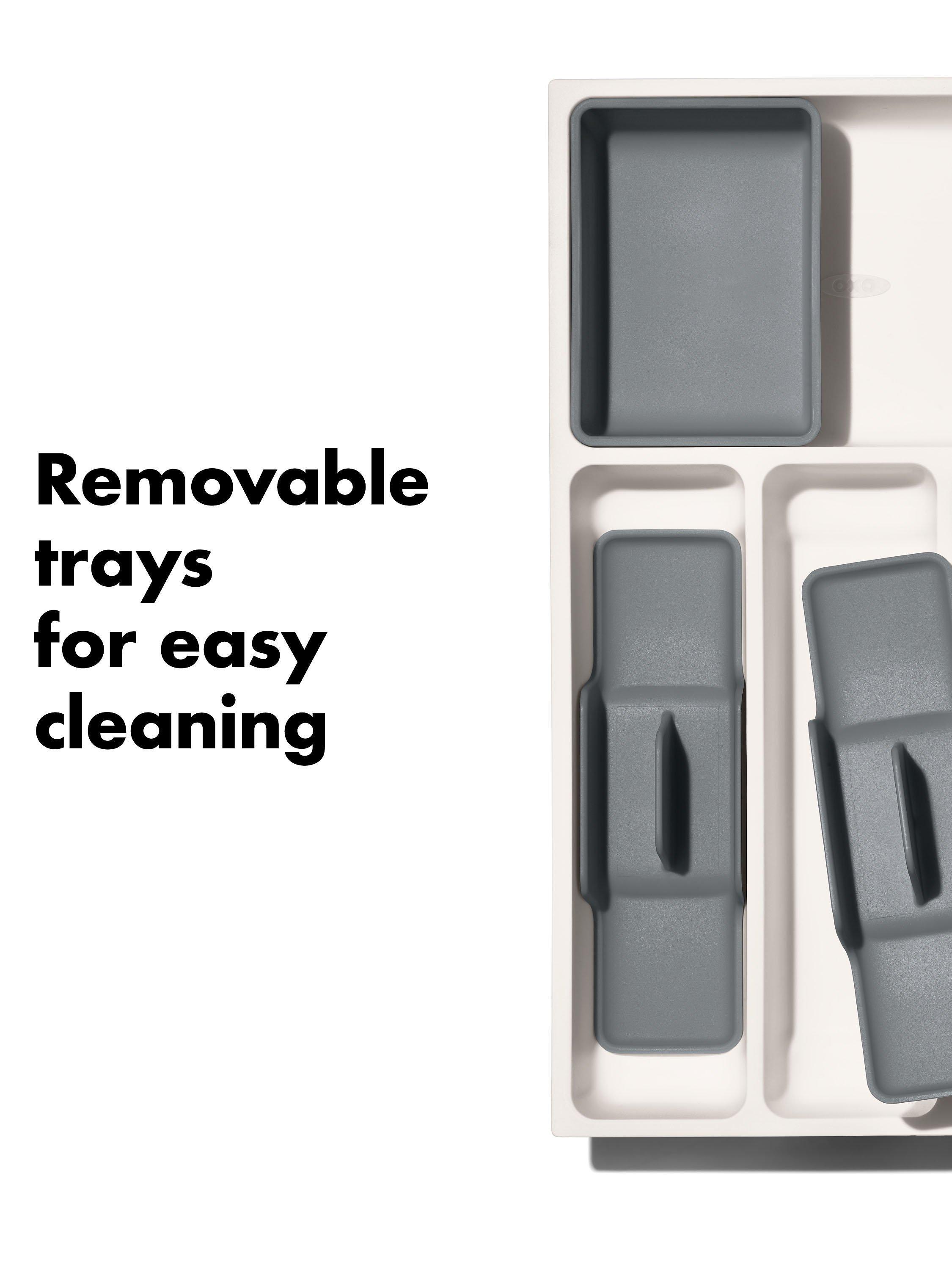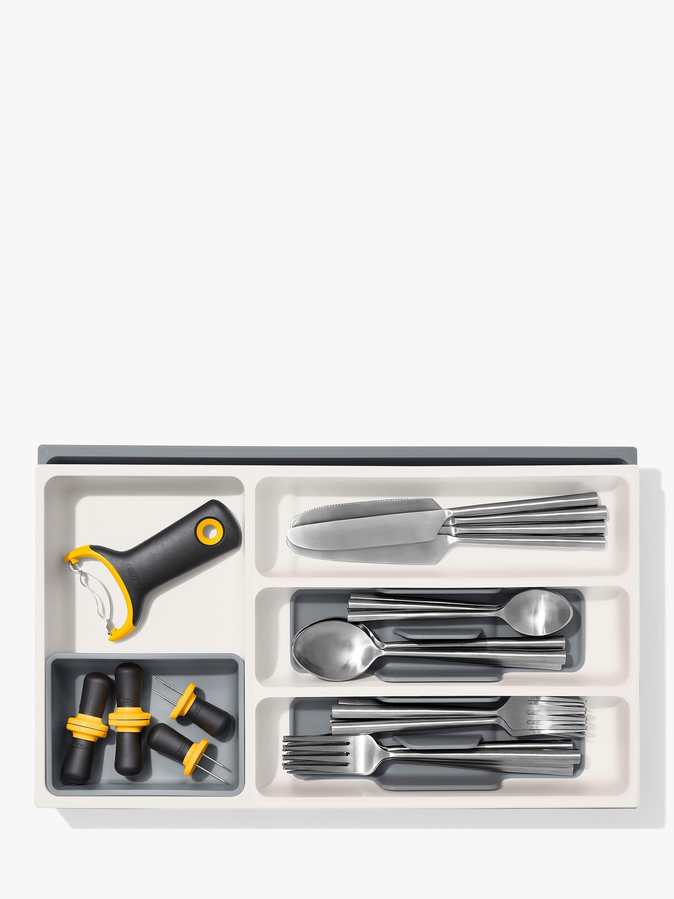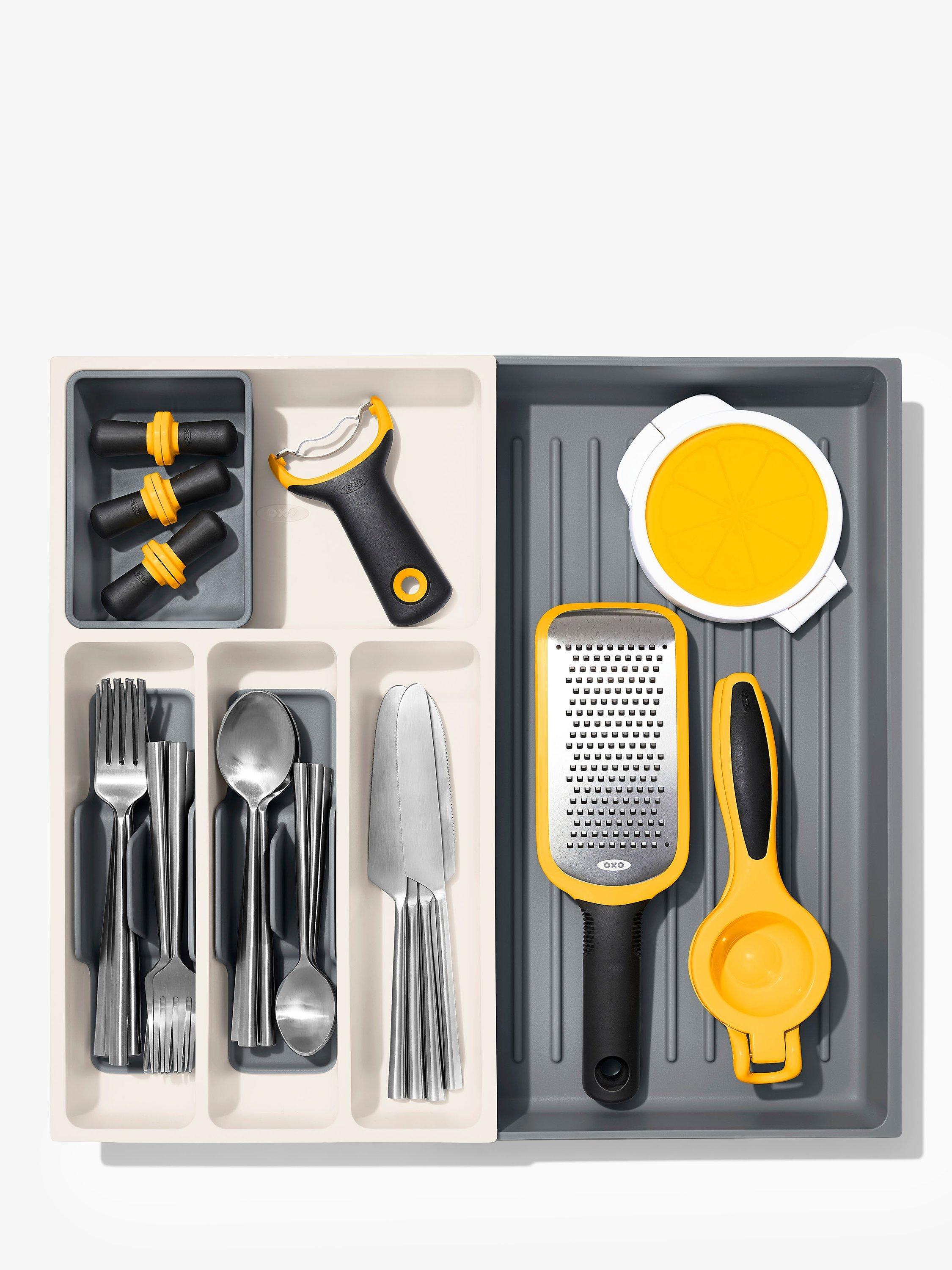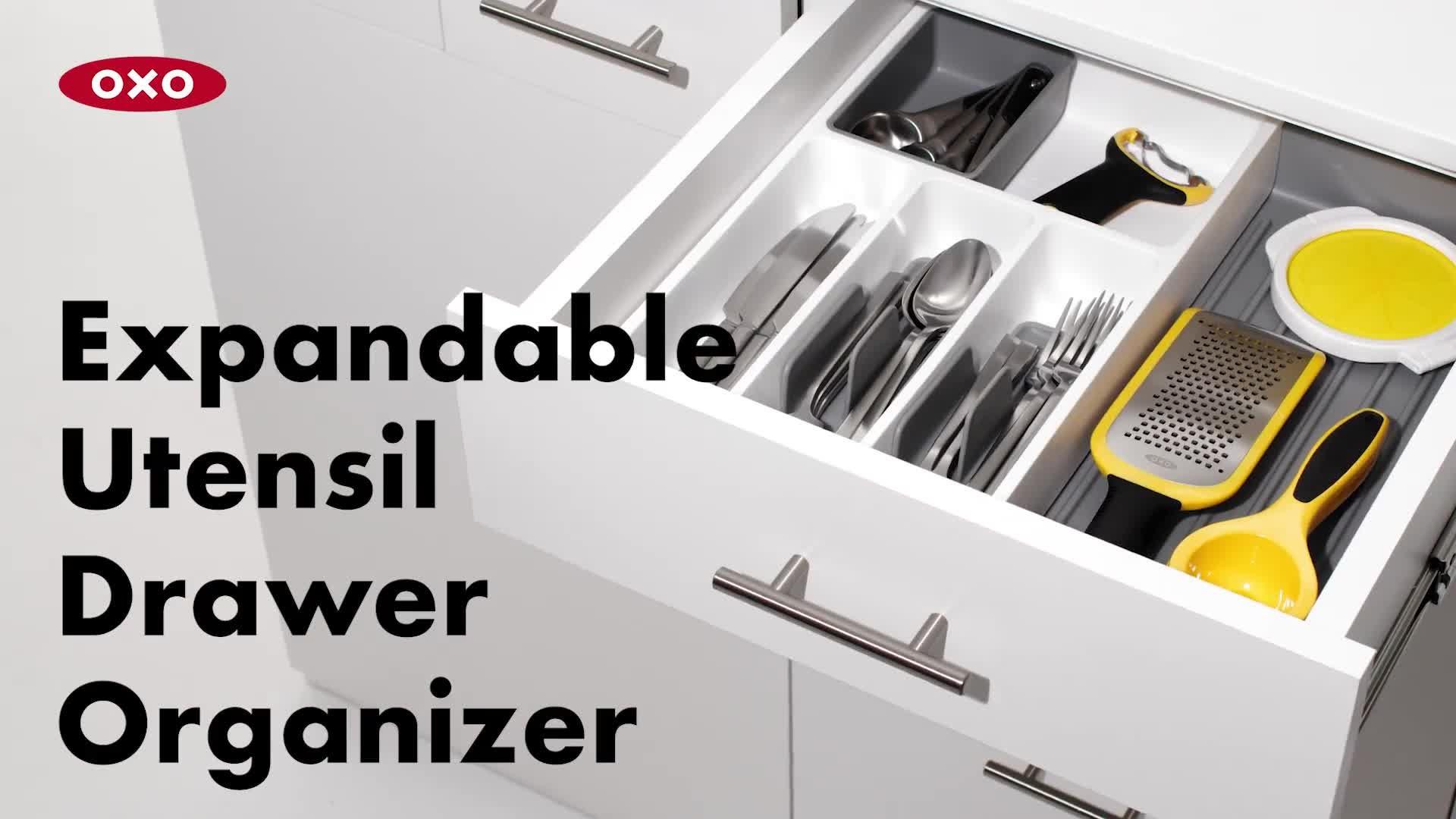 The OXO Good Grips Expandable Utensil Drawer Organizer helps you declutter any size drawer. The utensil caddies save space by keeping utensils neatly stacked, and the large, undivided area is ideal for irregular-shaped kitchen tools like can openers.