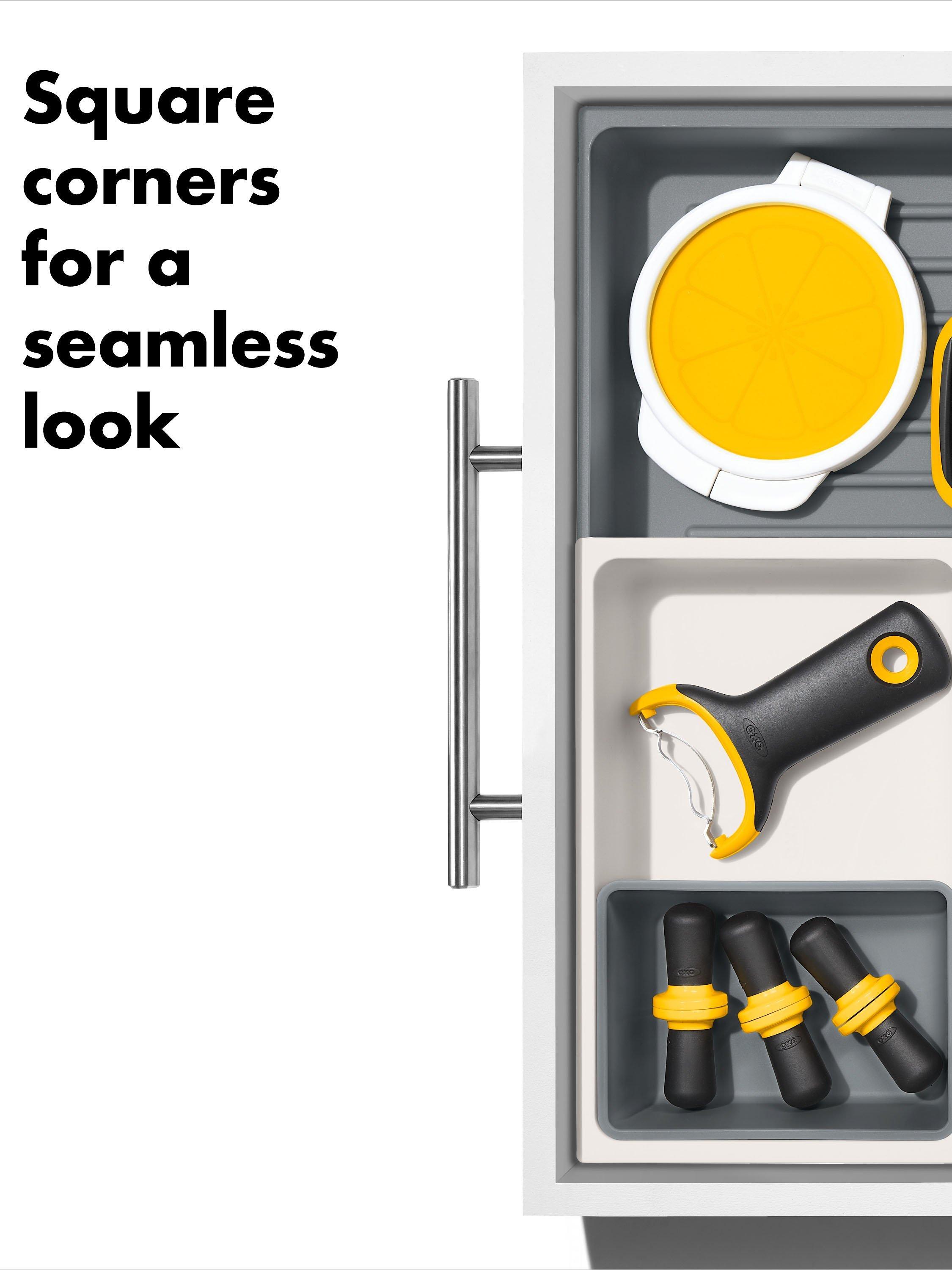 The organizer even includes a removable cup for small, hard-to-store gadgets, like wine stoppers and corn holders. The non-slip feet keep the organizer in place when you open and close the drawer.