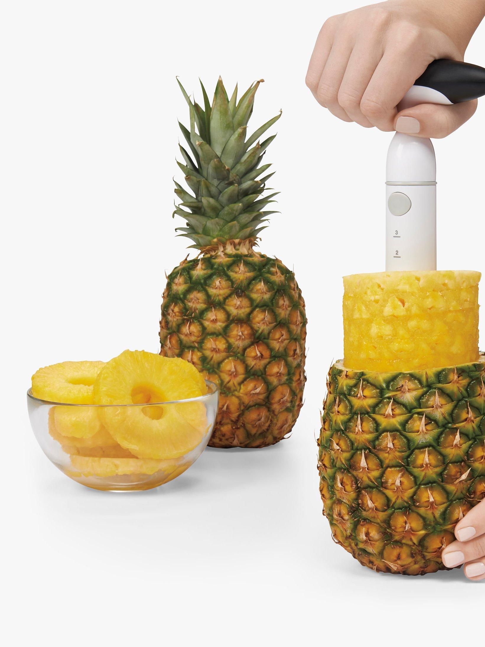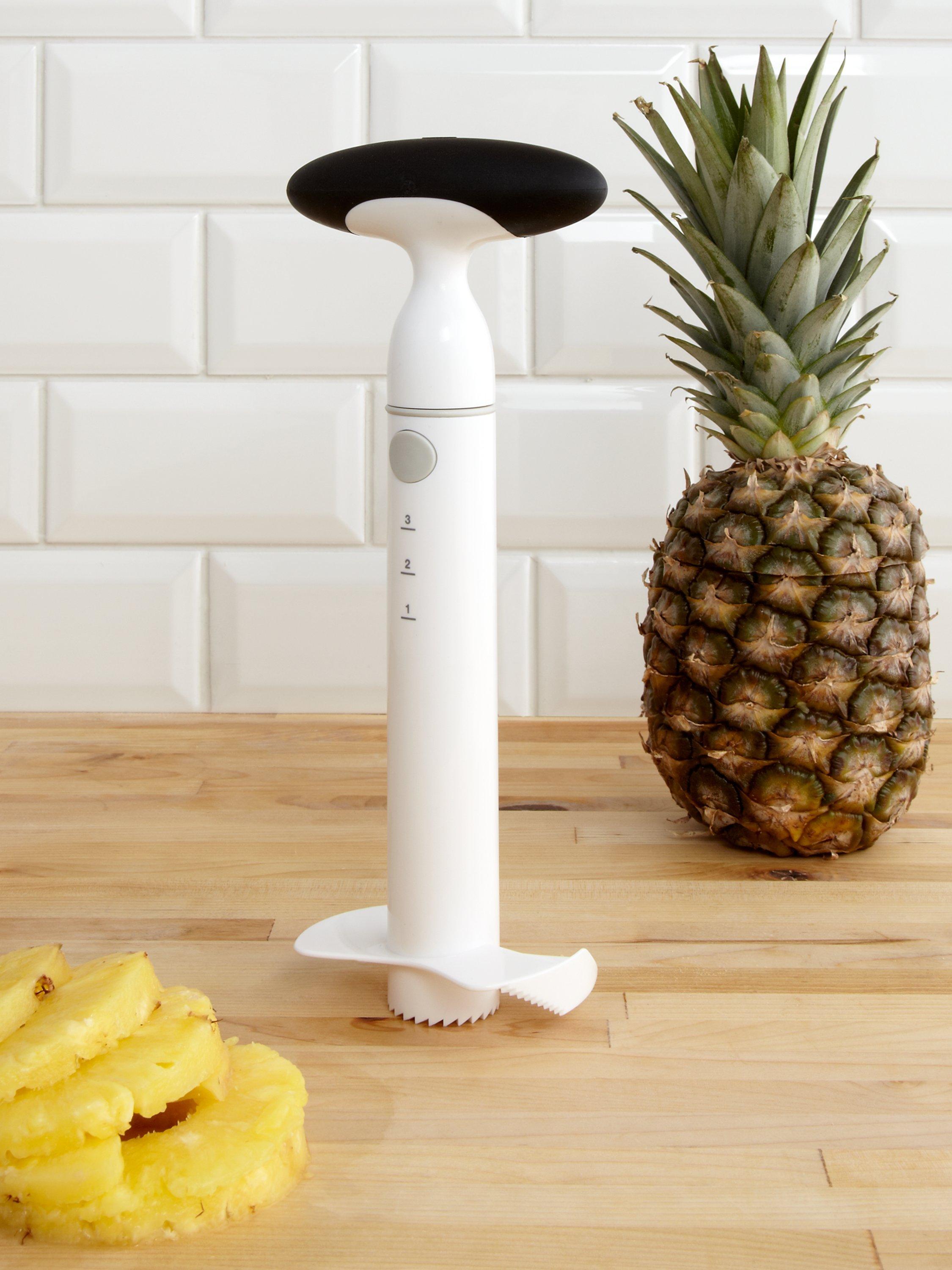 This useful gadget cores and slices a whole pineapple quickly and easily. Simply slice off the top of a fresh pineapple and twist the Slicer onto the exposed fruit to create perfect pineapple rings. The ratcheting handle makes it easy to core pineapples quickly without having to remove and replace your hand with each twist.