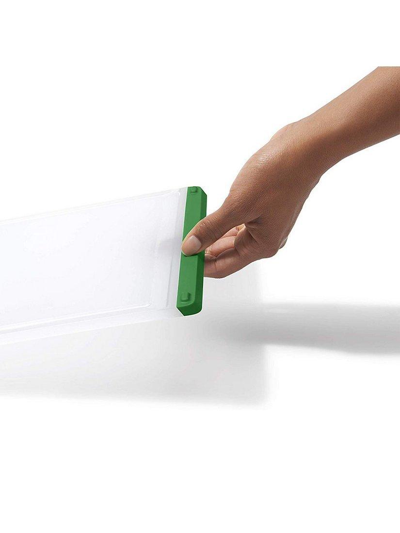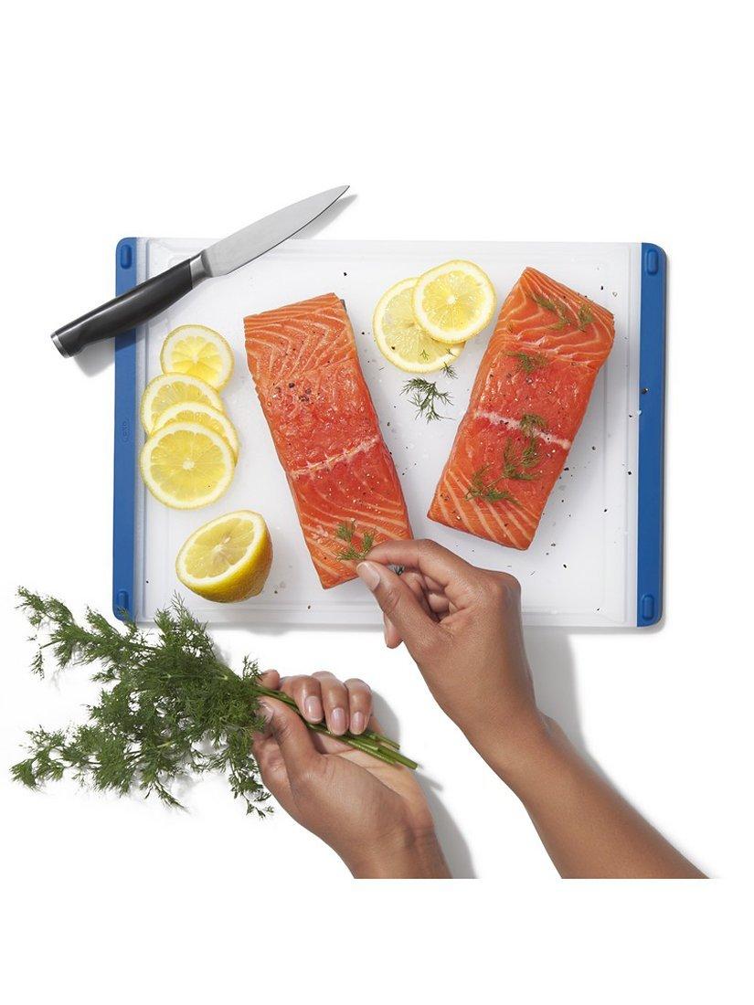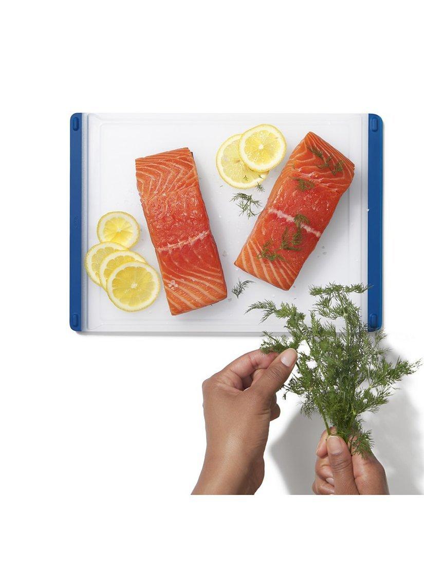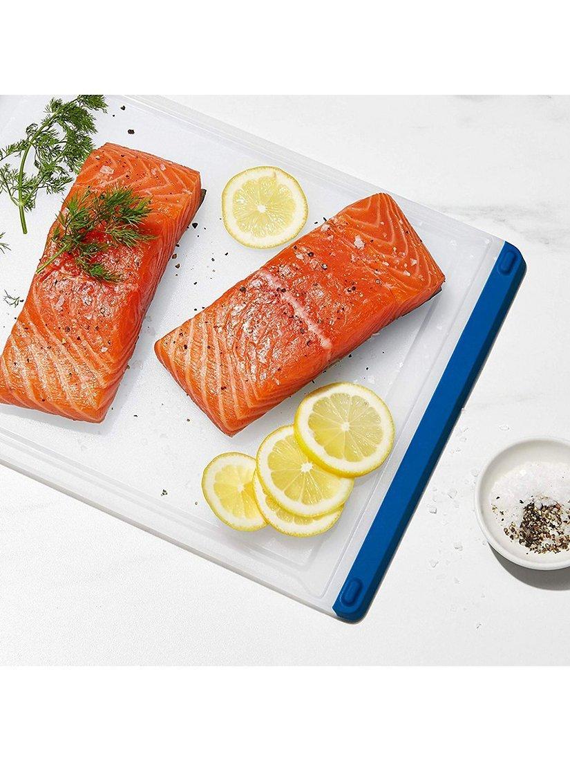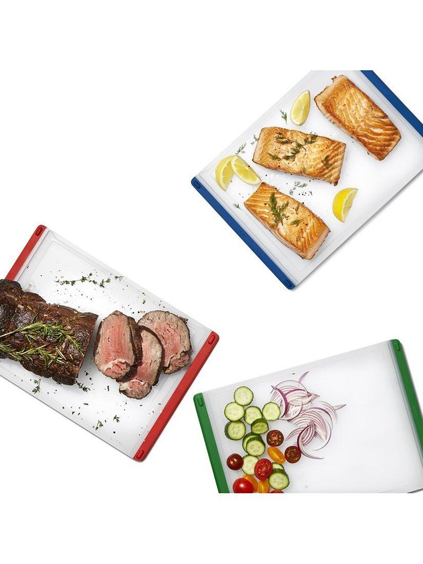 Kiss cross-contamination worries goodbye when you use the OXO 3-Piece Everyday Cutting Board Set for meal prep. Non-porous construction keeps the cutting surface fresh, while colour-coded bands keep you organised in the kitchen. Use red for meats, blue for fish, and green for vegetables to so always know which one to use for the task at hand. Soft, tapered edges double as handles for comfortable lifting and carrying, while the cutting surface goes easy on your knives. Non-slip feet keep the cutting board in place for safety as you slice. Each 9-inch by 12.9-inch board features an integrated drip-catcher to keep even the juiciest foods contained. When you're done, pour away excess liquid easily from any corner of the board and pop it in the dishwasher for thorough cleaning and sanitising. These durable boards are dishwasher safe for everyone who loves cooking more than cleaning up afterward.