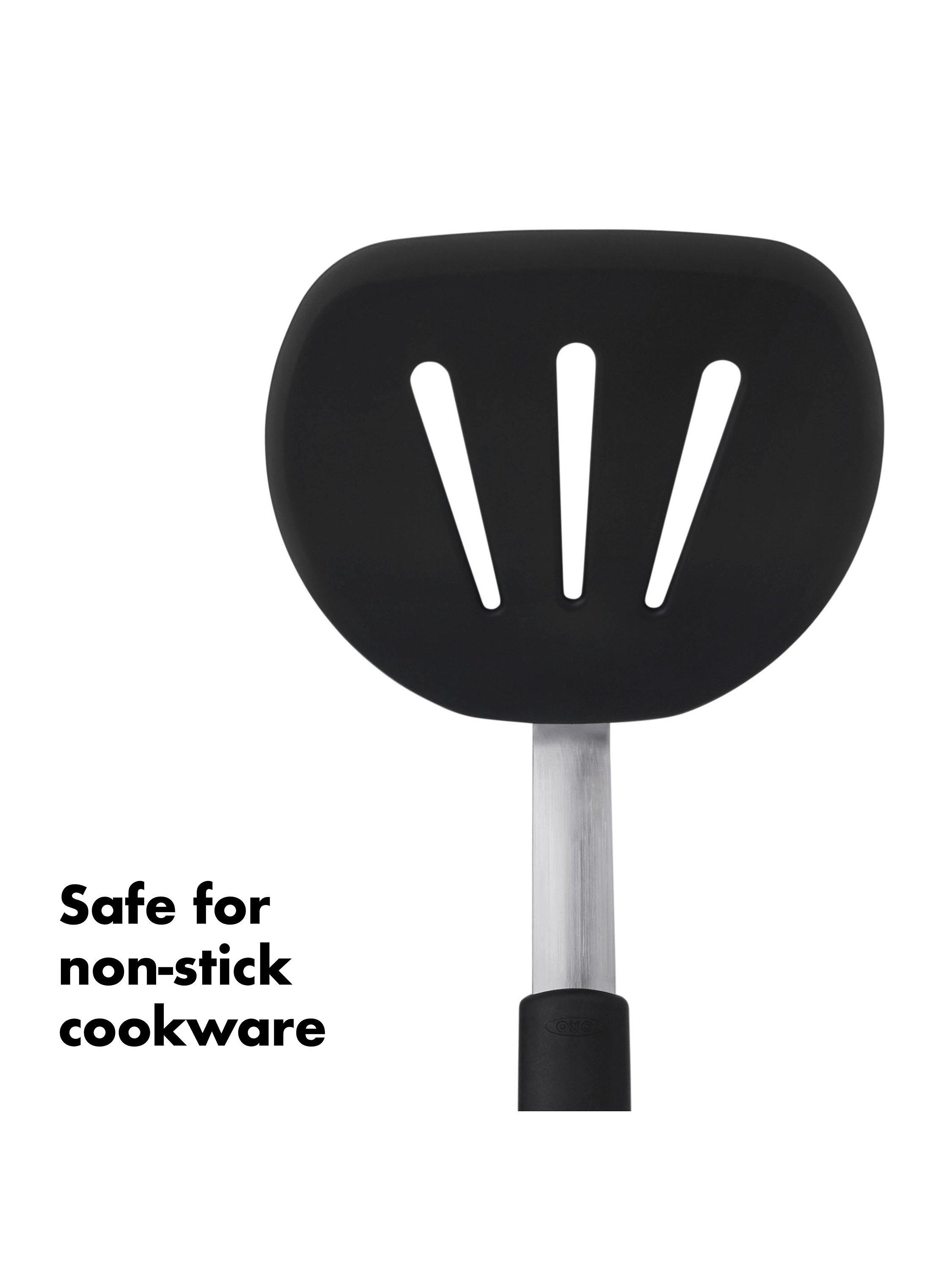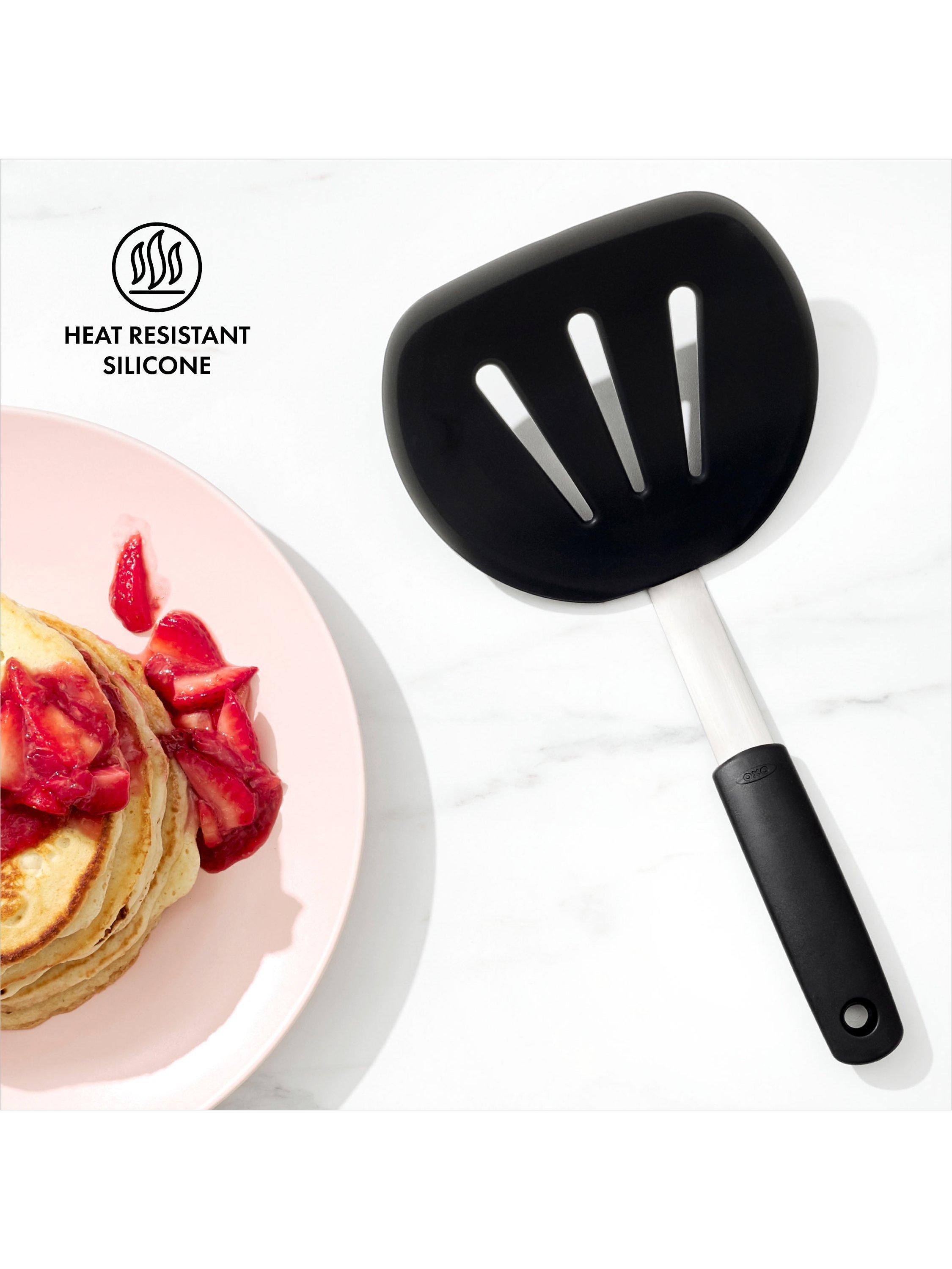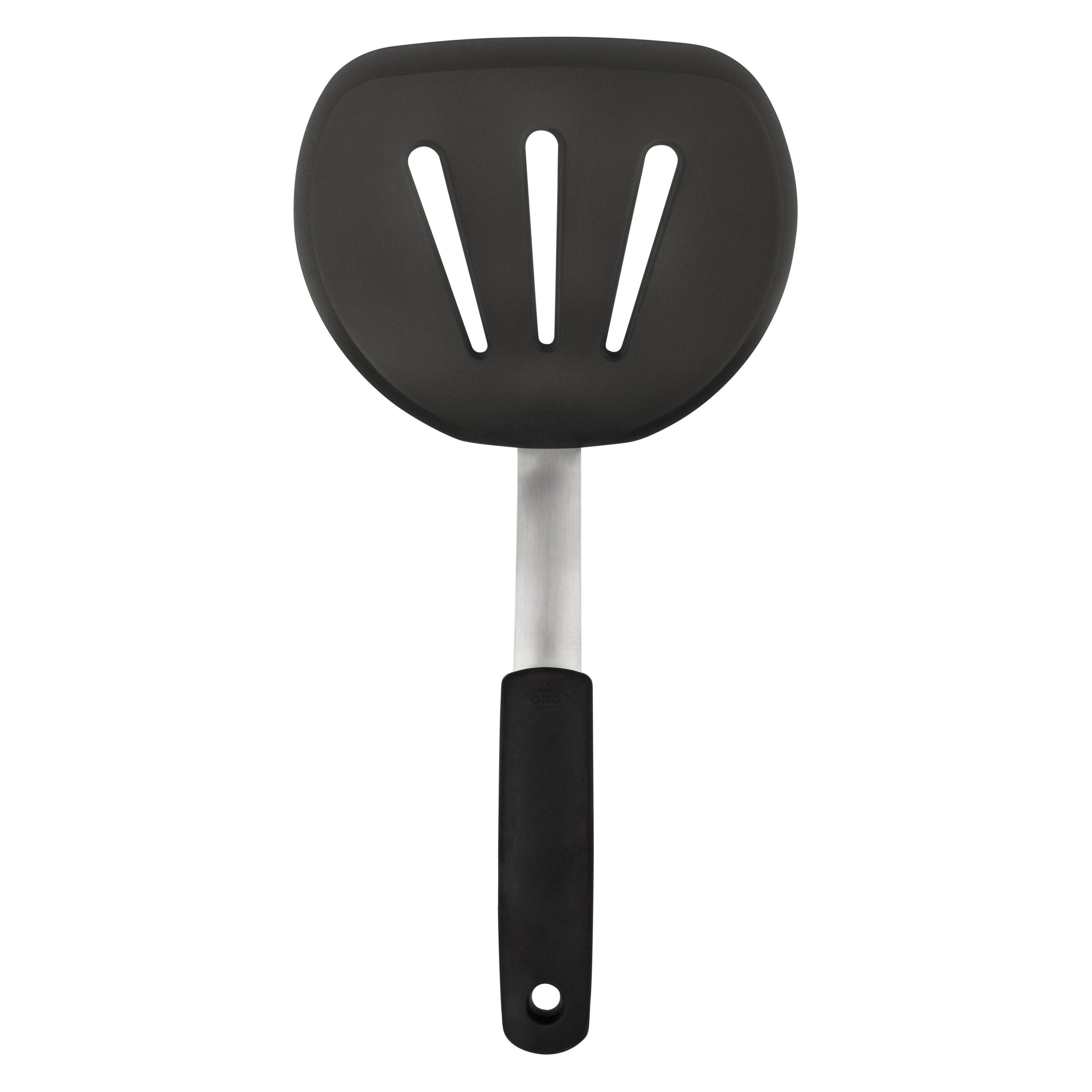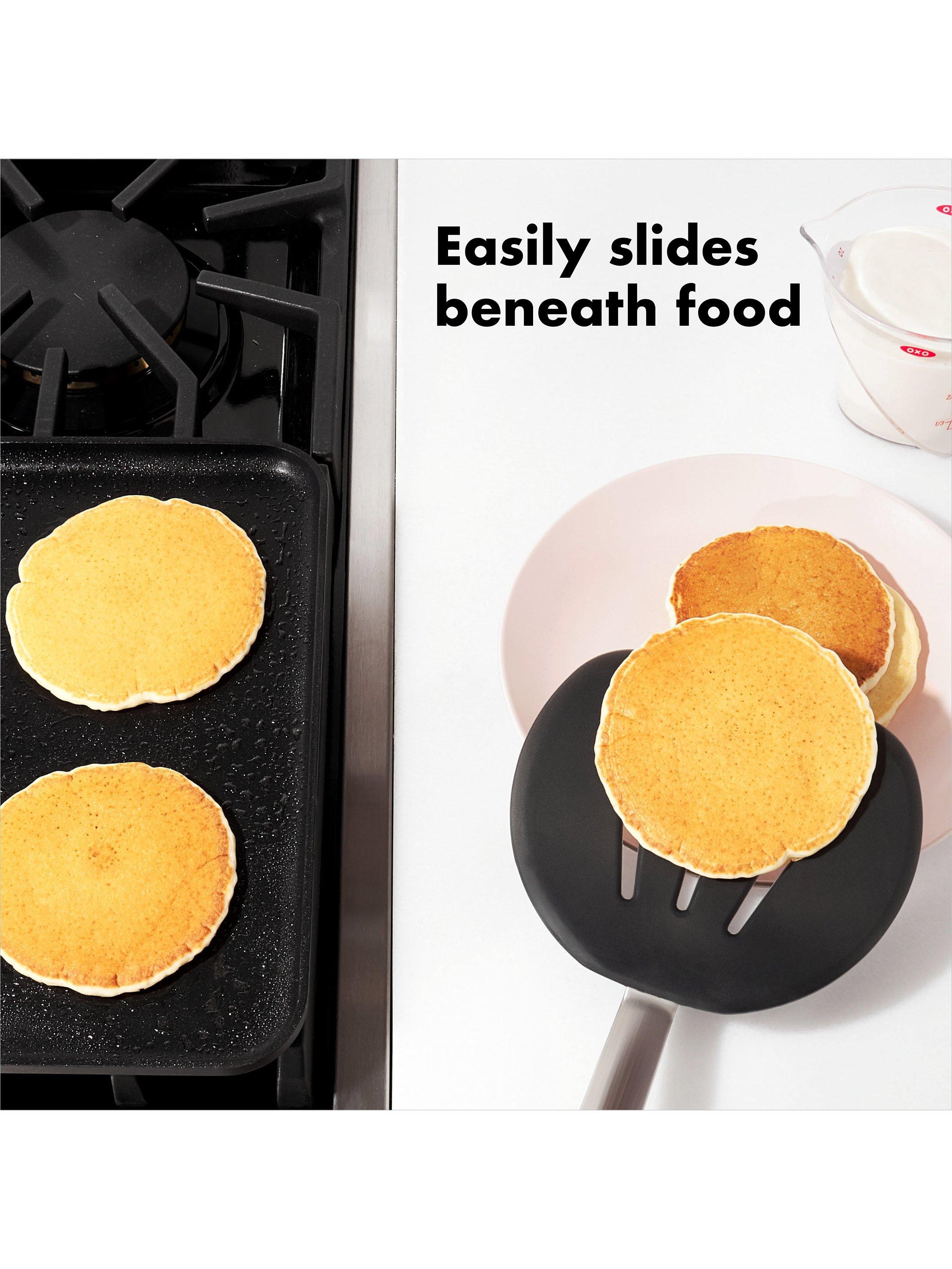 The OXO Good Grips Silicone Flexible Pancake Turner is a versatile addition to any kitchen. Its thin design slides easily under delicate foods like eggs but is sturdy enough to flip burgers. It's safe for non-stick cookware, so you can flip pancakes without bunching them and turn fish without breaking it. This nimble turner is constructed of heat-resistant silicone bonded to flexible stainless steel for durability. It has a soft, non-slip handle to keep you comfortable even when you're serving up cookies for a crowd. Dishwasher safe for easy cleaning.