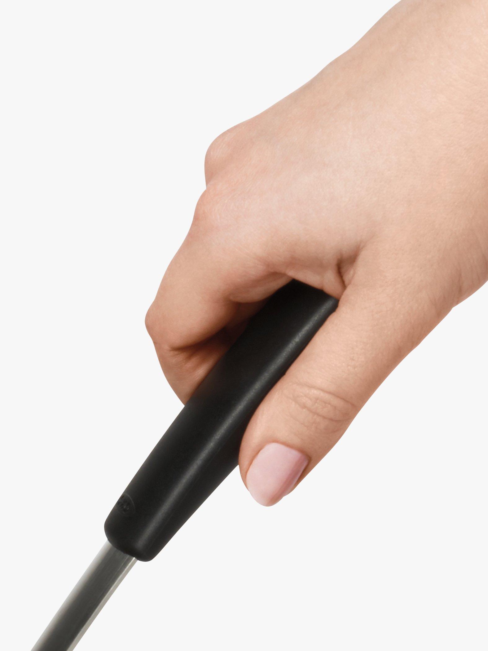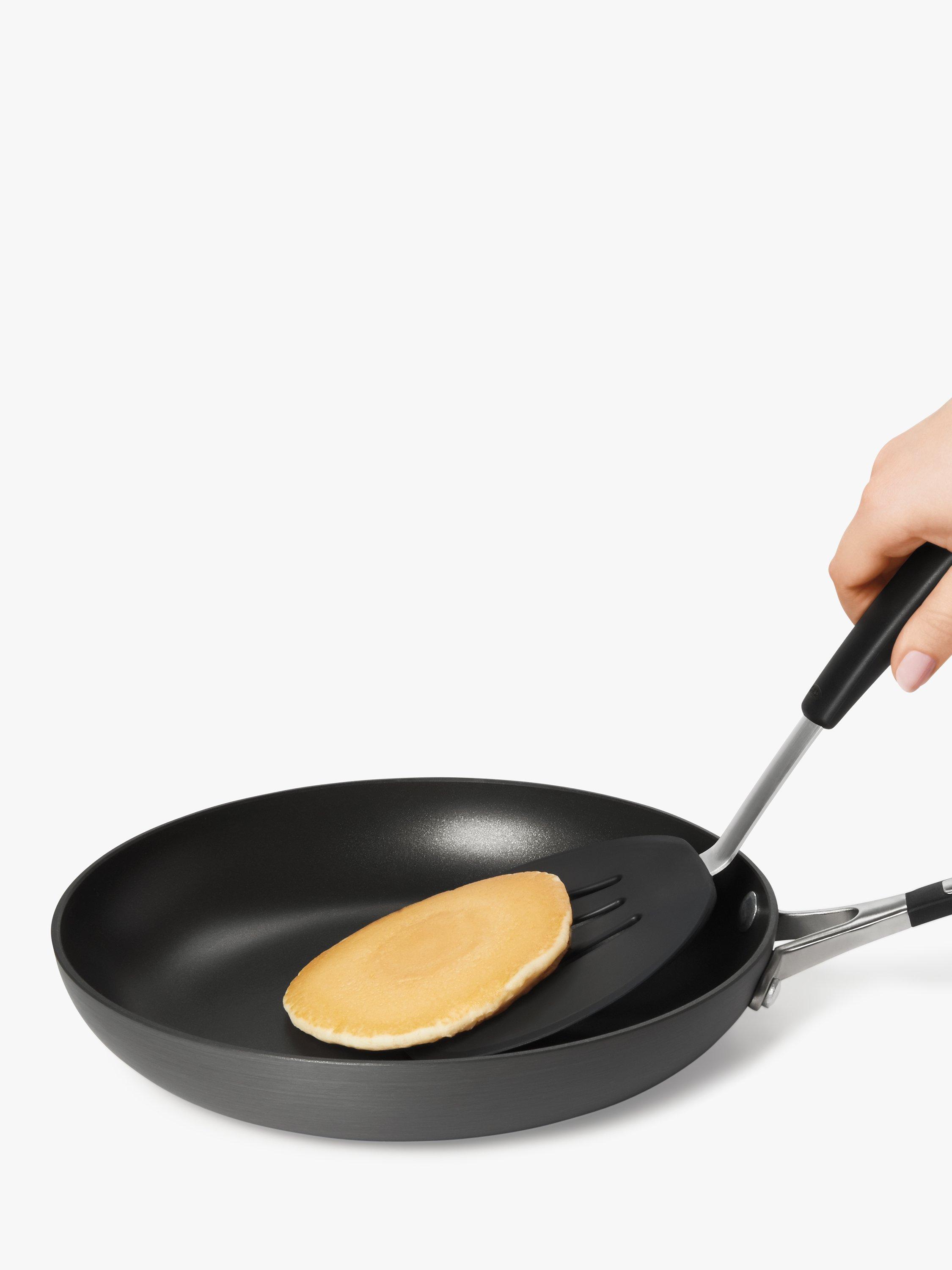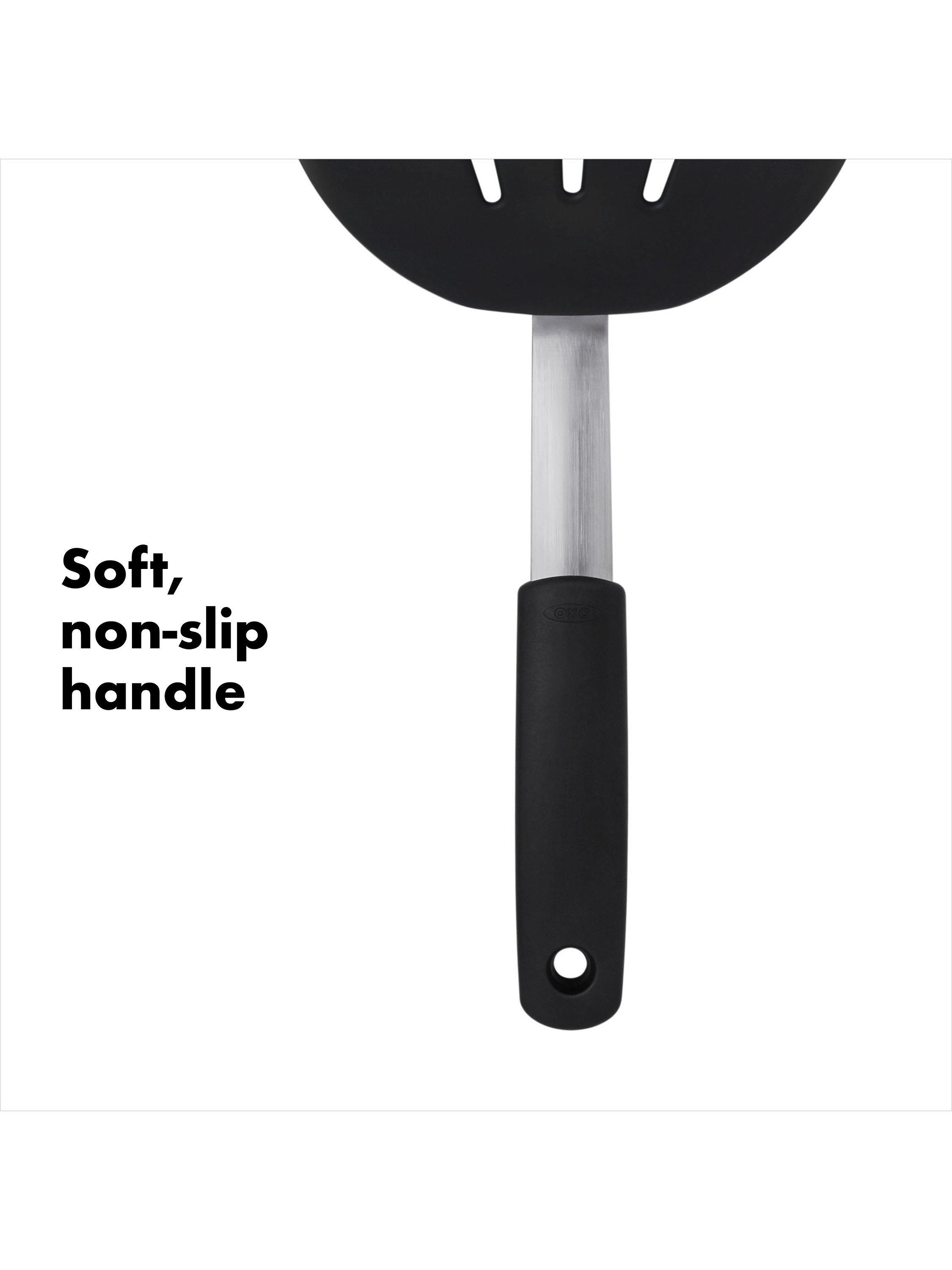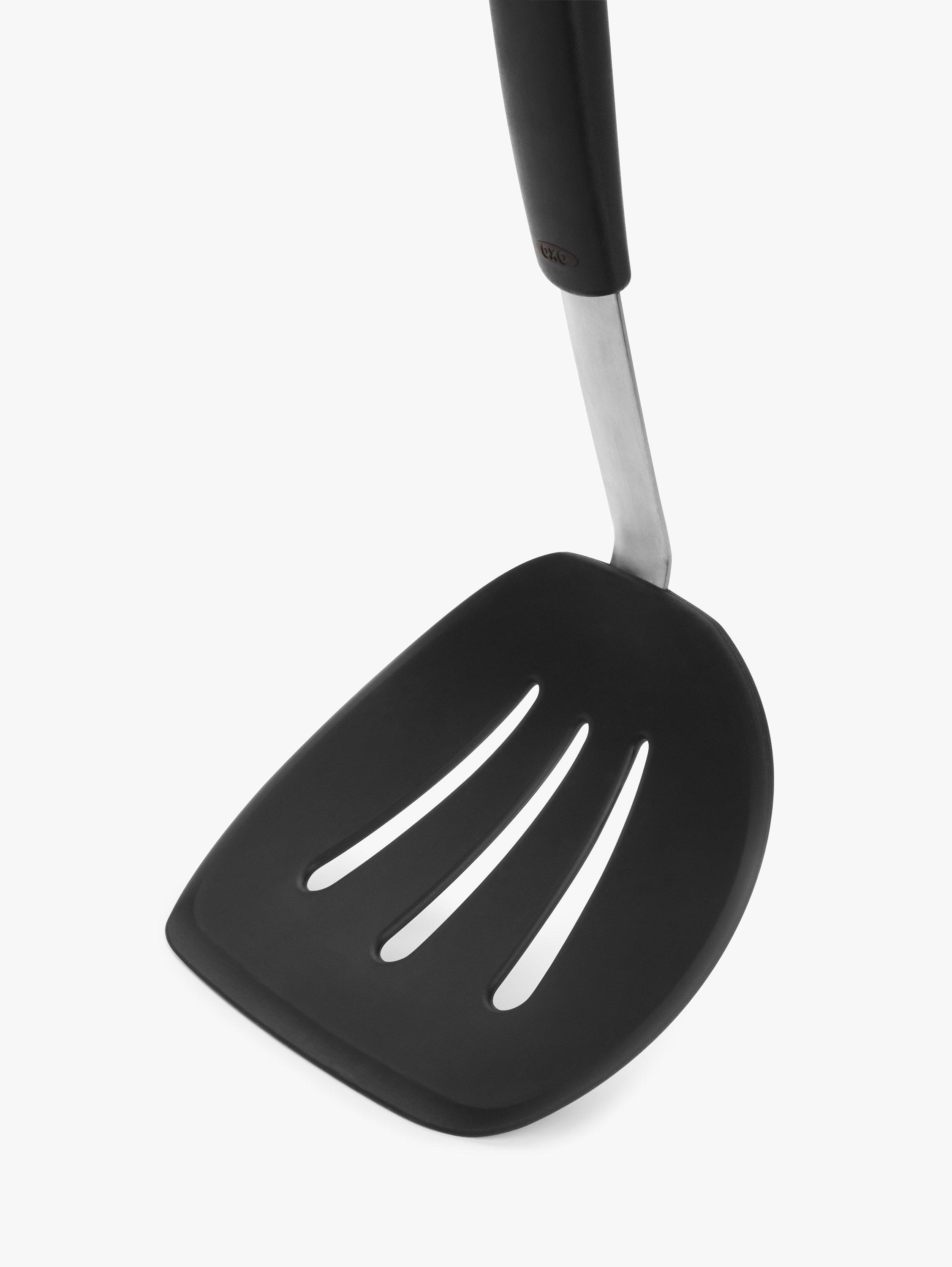 The OXO Good Grips Silicone Flexible Pancake Turner is a versatile addition to any kitchen. Its thin design slides easily under delicate foods like eggs but is sturdy enough to flip burgers. It's safe for non-stick cookware, so you can flip pancakes without bunching them and turn fish without breaking it. This nimble turner is constructed of heat-resistant silicone bonded to flexible stainless steel for durability. It has a soft, non-slip handle to keep you comfortable even when you're serving up cookies for a crowd. Dishwasher safe for easy cleaning.