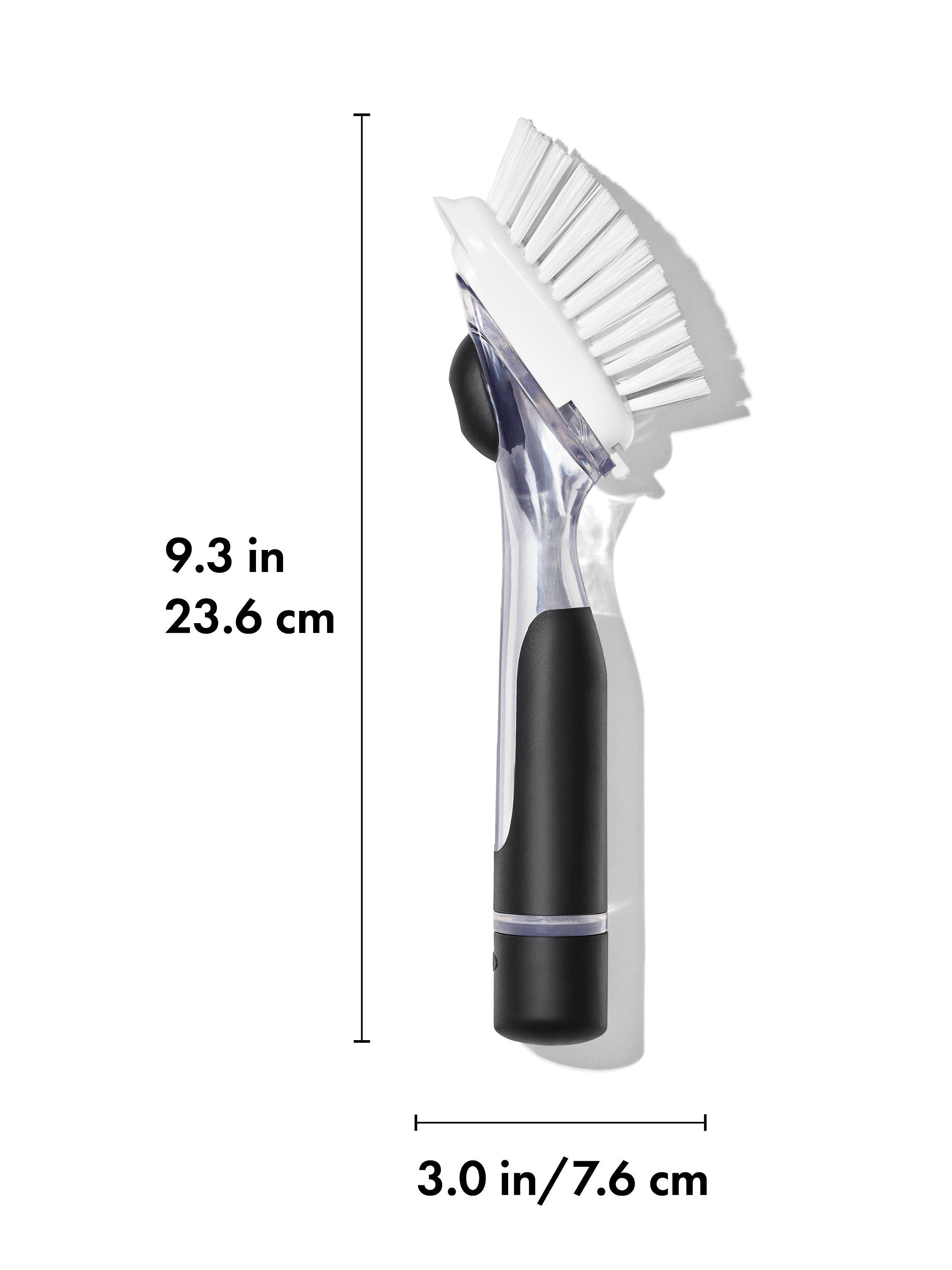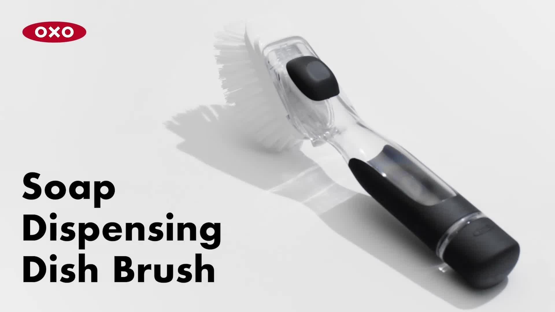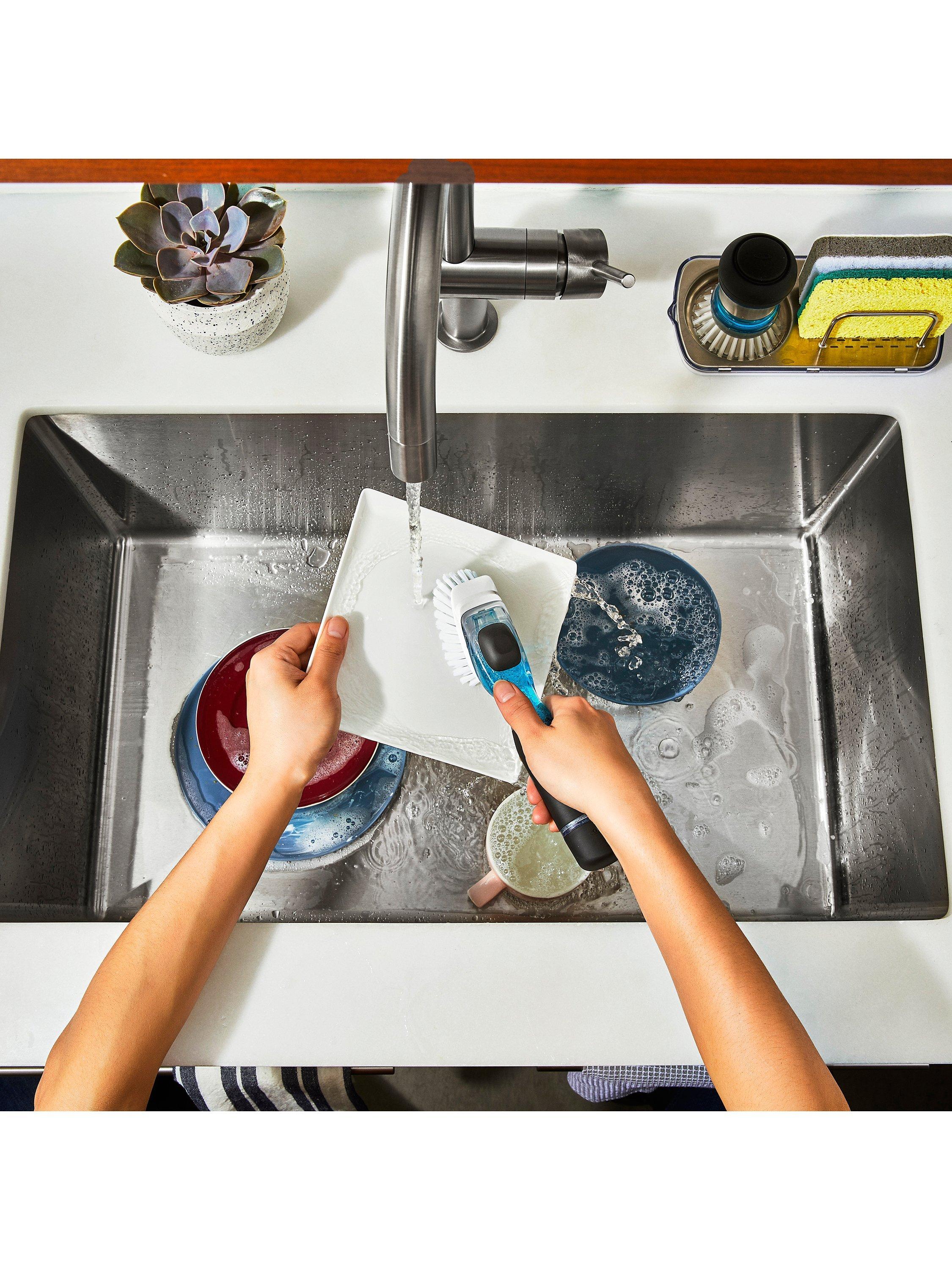 Add suds when you want. The OXO Good Grips Soap Dispensing Dish Brush has a drip-free valve that holds dish soap in the handle until you press a button to release just the right amount.