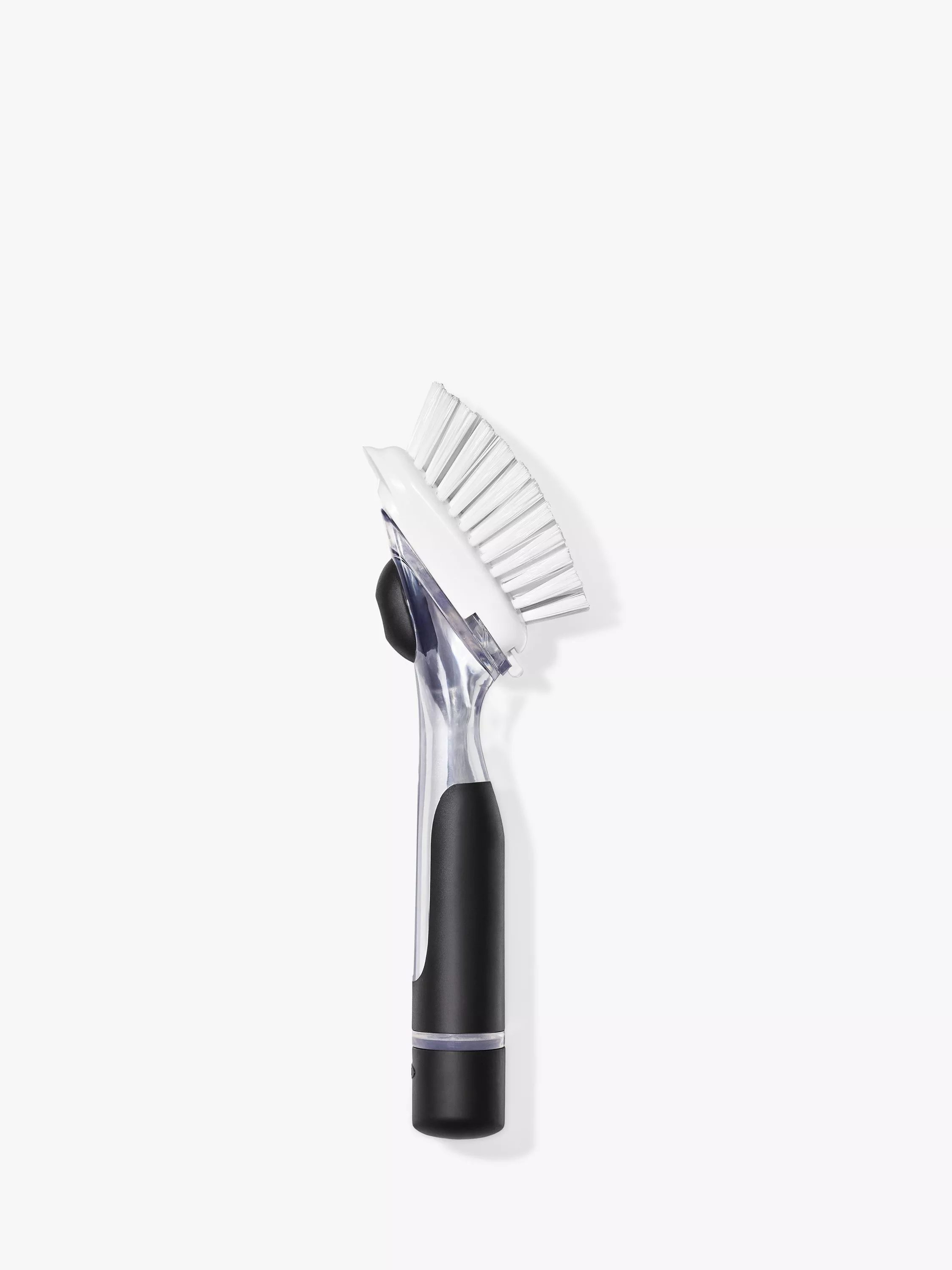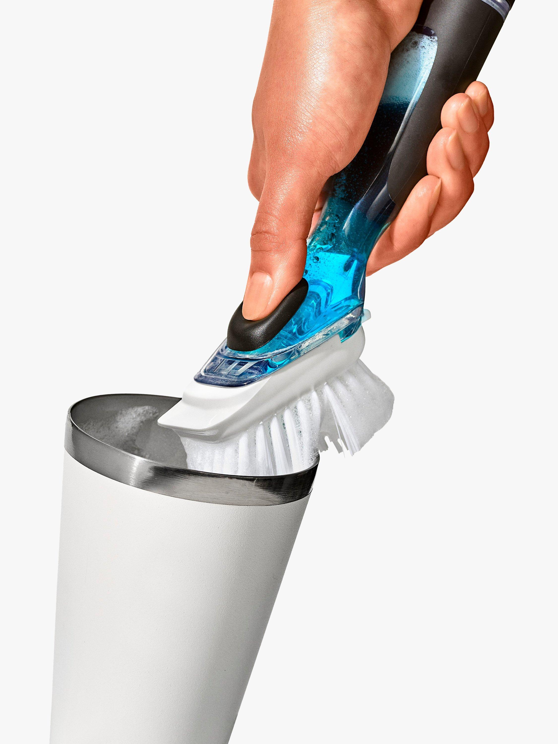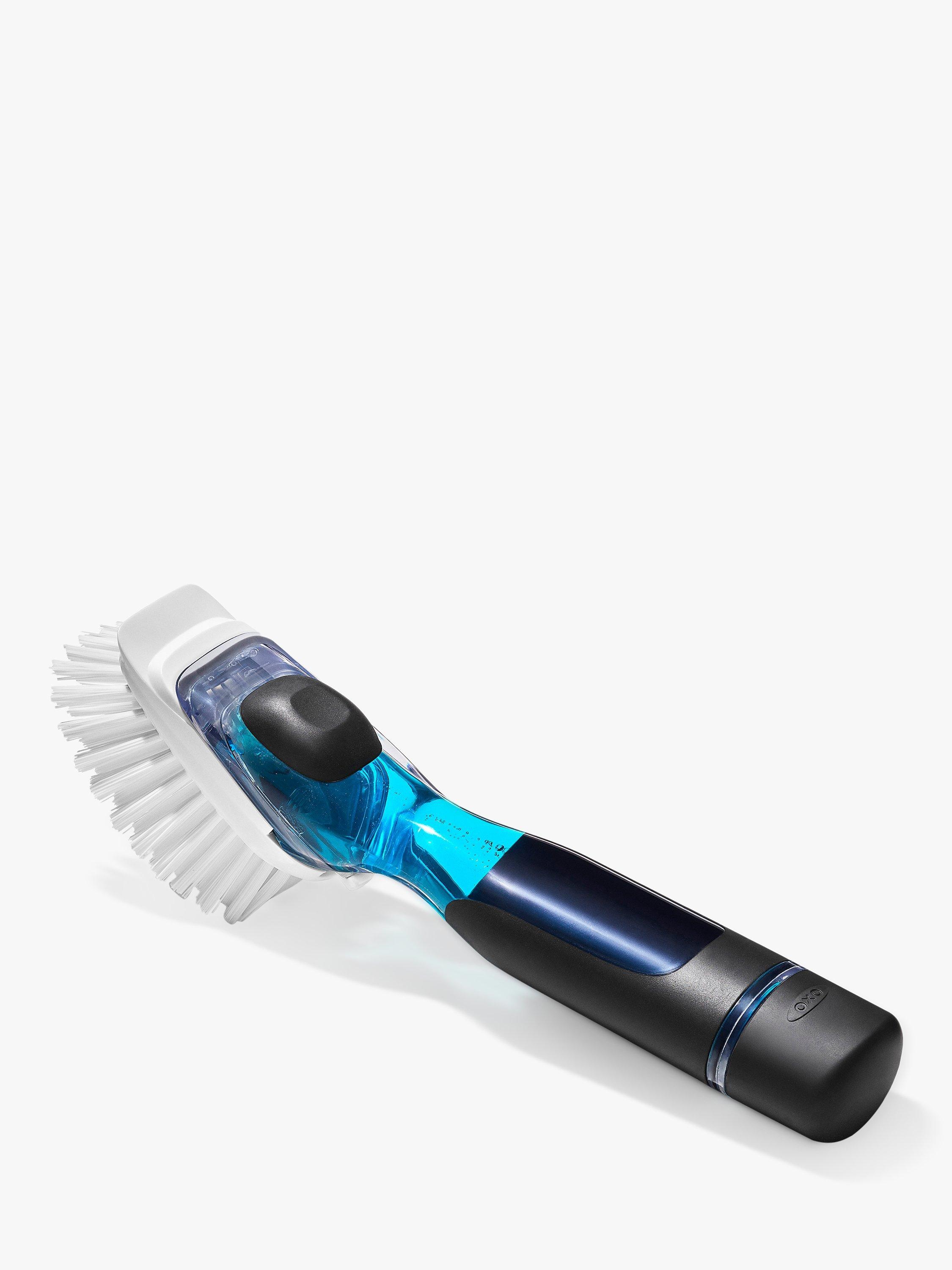 Add suds when you want. The OXO Good Grips Soap Dispensing Dish Brush has a drip-free valve that holds dish soap in the handle until you press a button to release just the right amount.