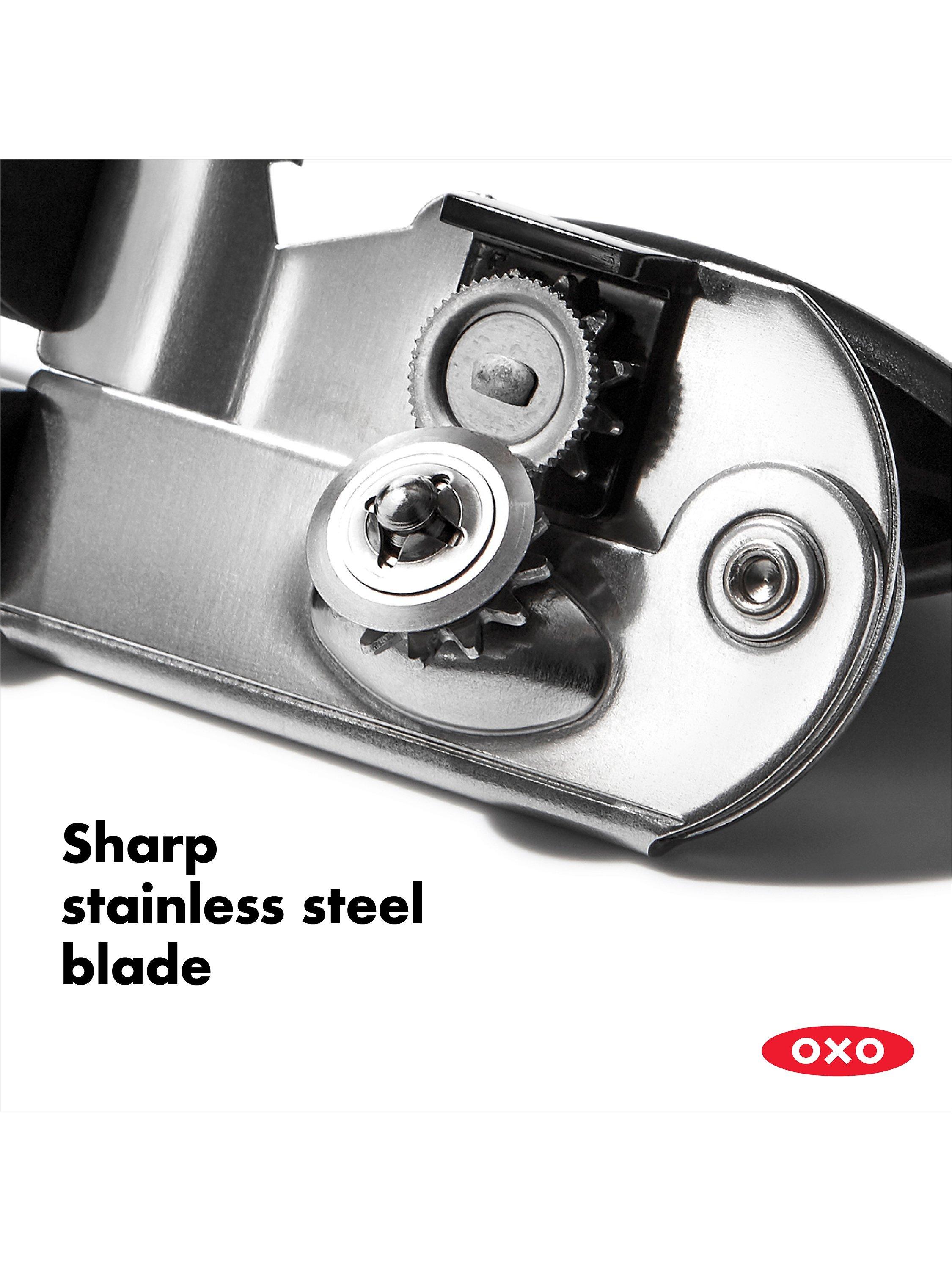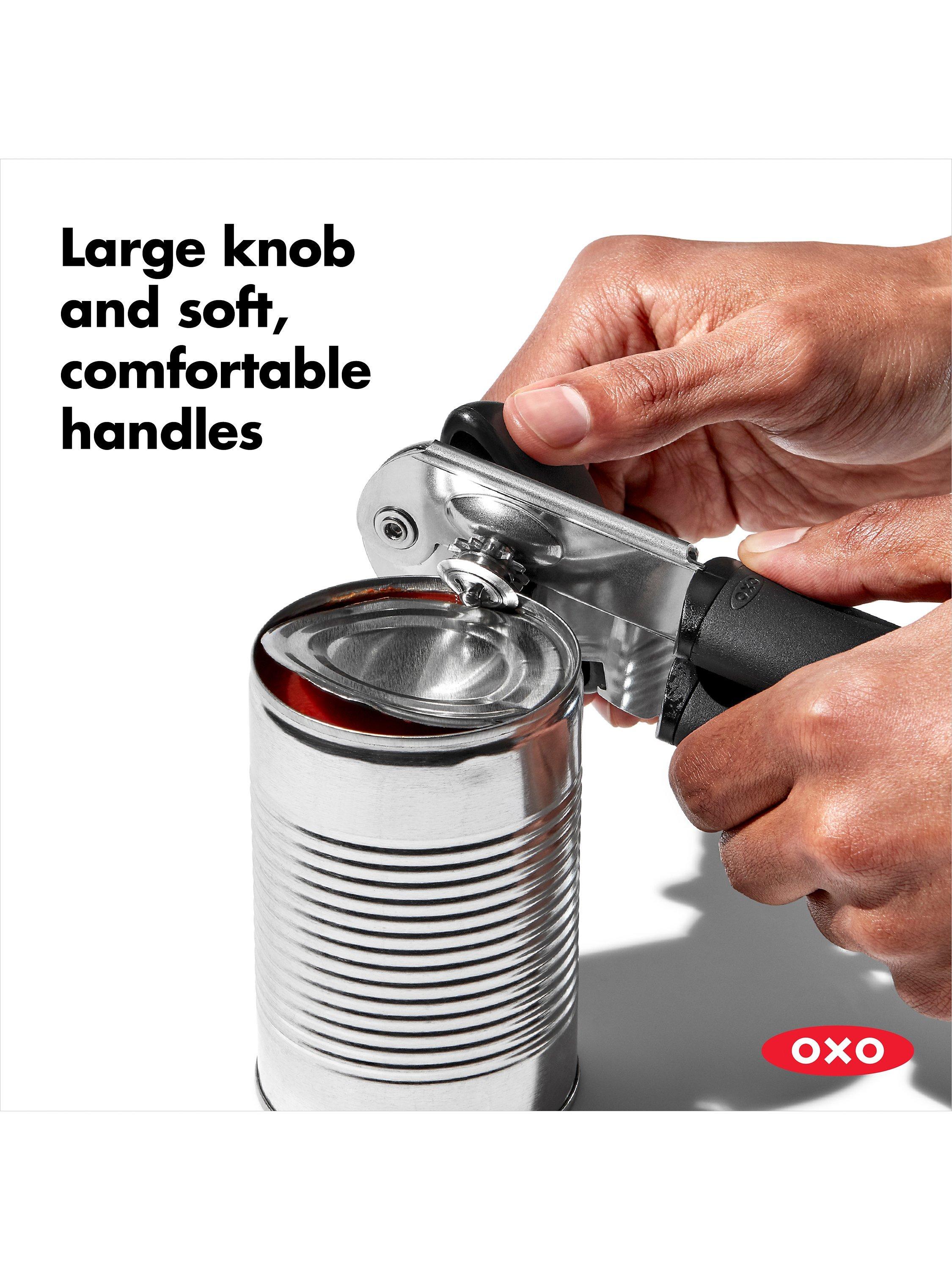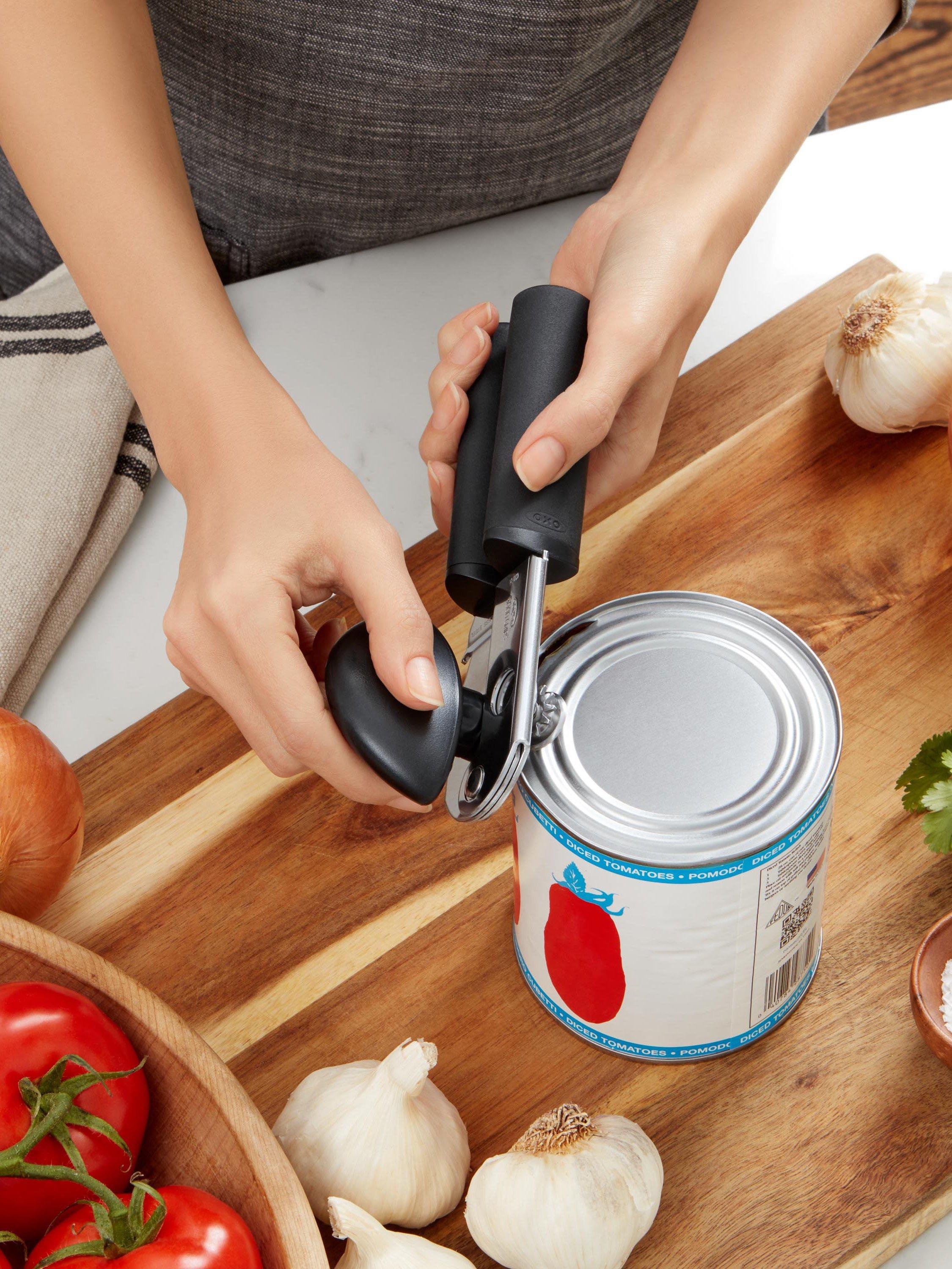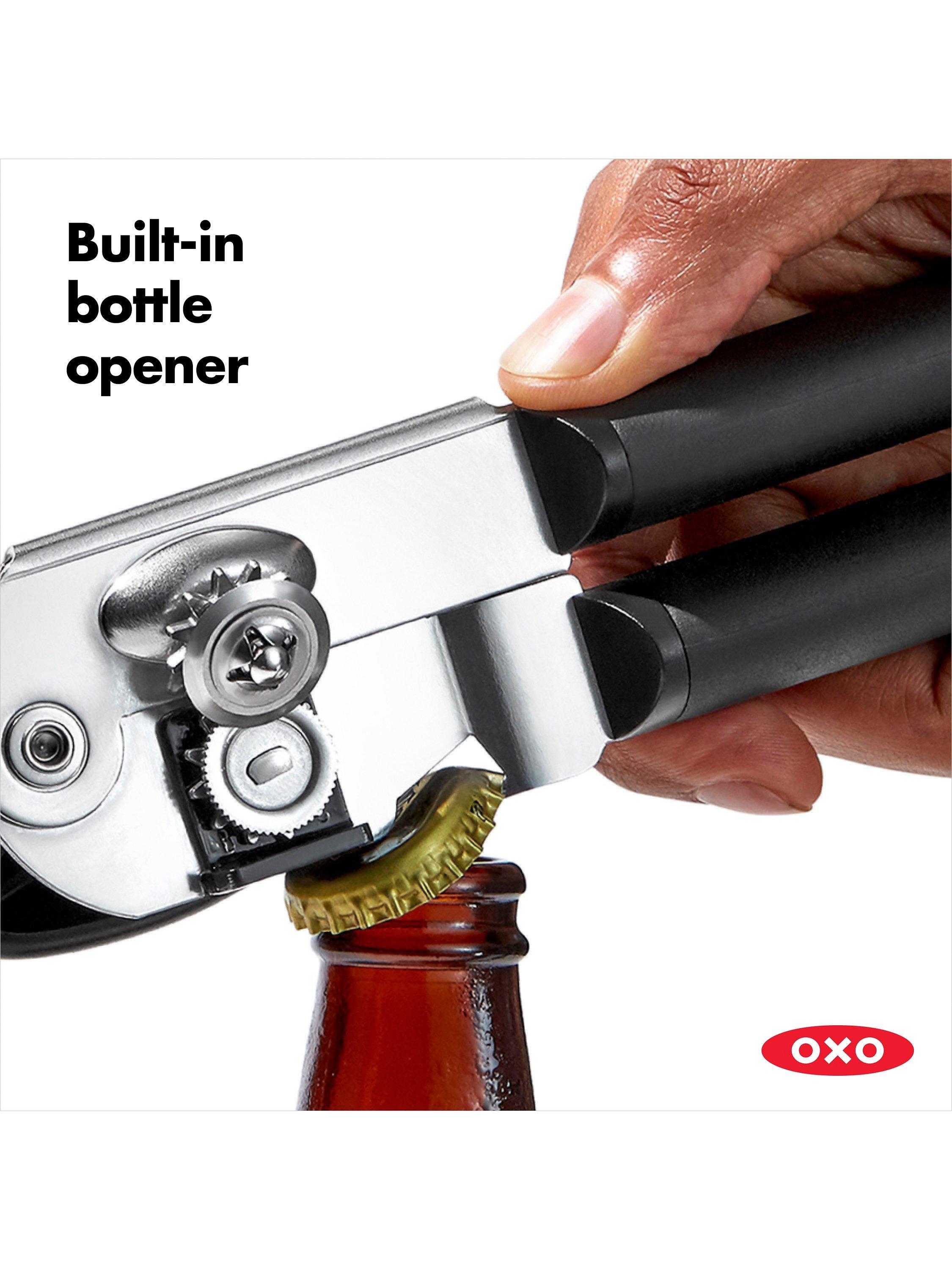 This kitchen essential makes opening a can easy on your hands. Big, cushioned handles absorb pressure and give you extra strength to pierce the can, while the oversized knob turns easily to lift the lid away. The sharp, stainless steel cutting wheel is designed for efficiency so that, paired with the built-in bottle cap opener, this multi-tasking gadget becomes a must-have for the kitchen or camping trip.
