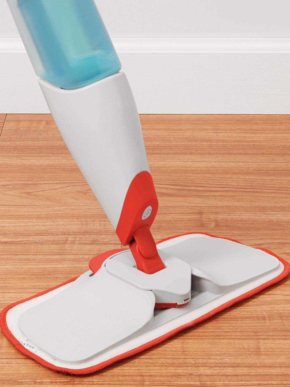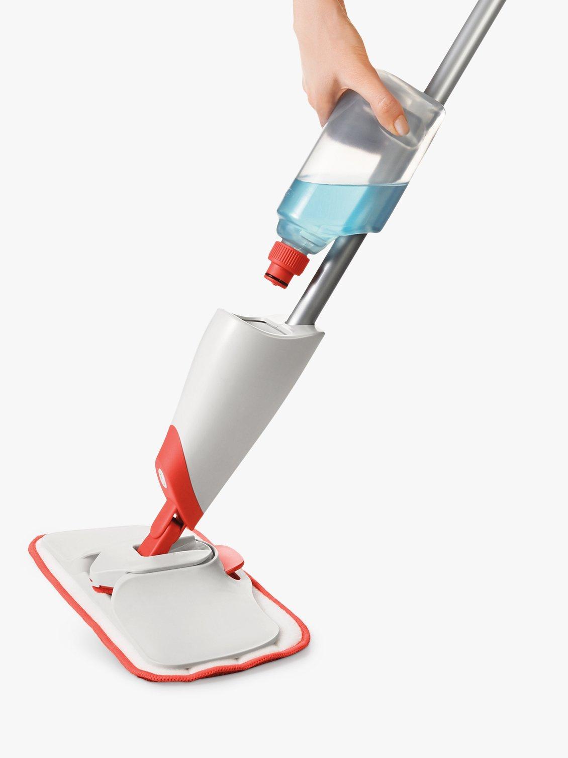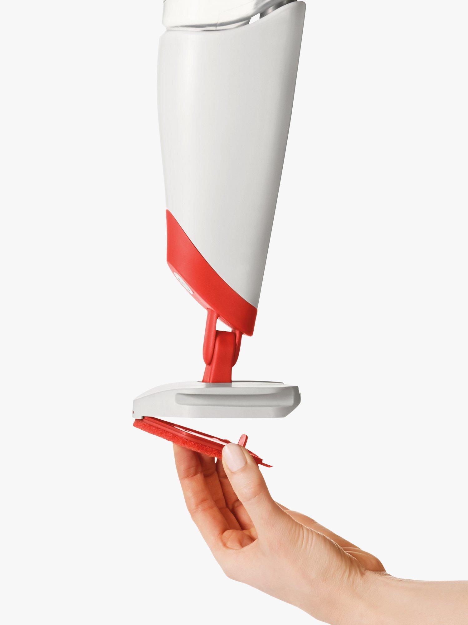 The pre-compression pump delivers an even spray of cleaning solution (refill with your own choice of cleaner when empty) which holds up to 16 floz. With a press of the pedal, a triangular scrubber slides out for more focussed cleaning on grubbier areas.