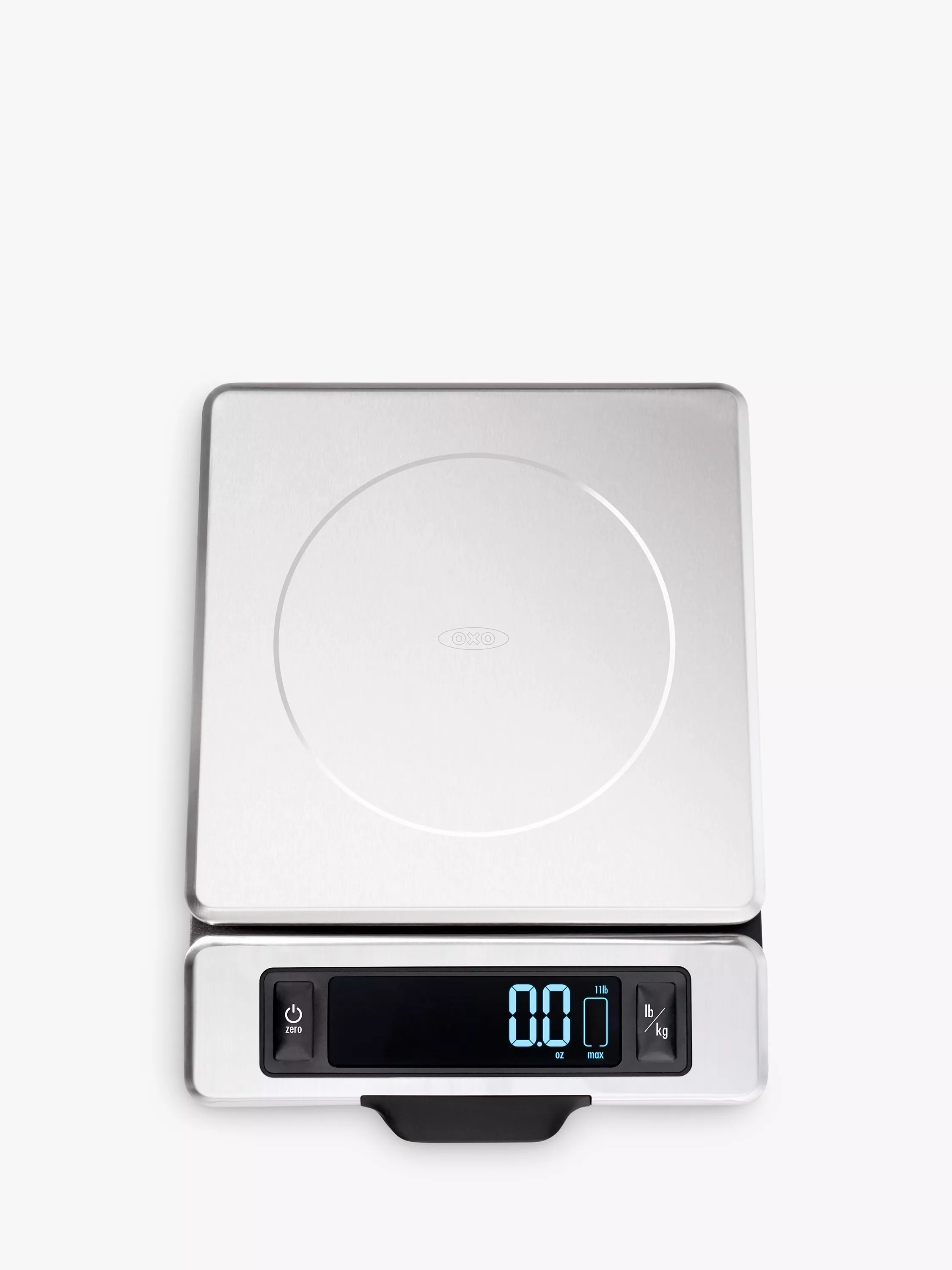 The OXO Good Grips 5kg Food Scale with Pull-Out Display is perfect for portioning meat, produce, spices and more. Weigh items directly on the platform, on a plate or in a bowl. The display pulls away from the base to prevent shadowing from large containers. A weight indicator shows the capacity left on the scale before the 5kg maximum is reached. Press the Zero button to offset the weight of a container or to set the weight back to zero before adding additional ingredients.