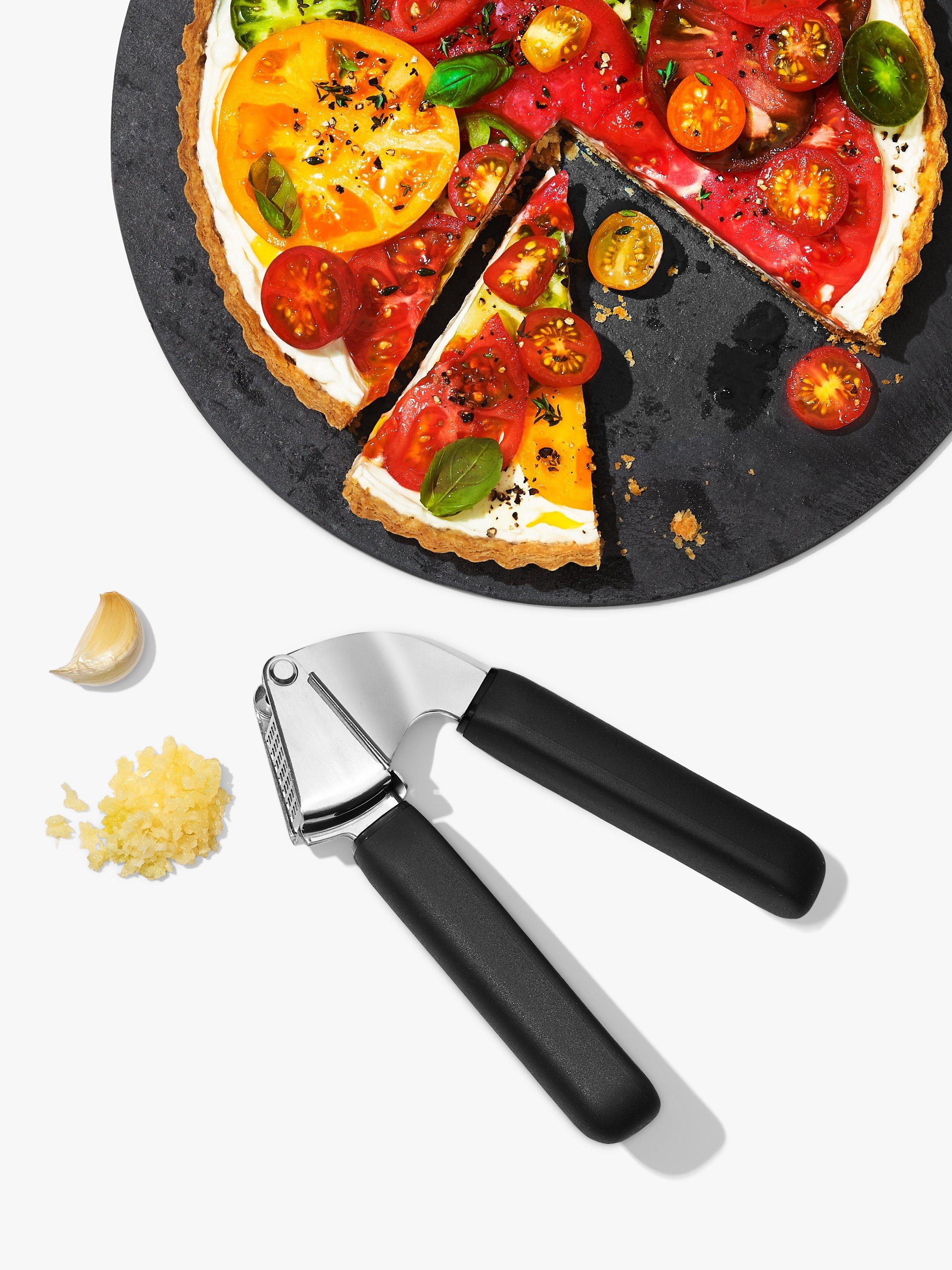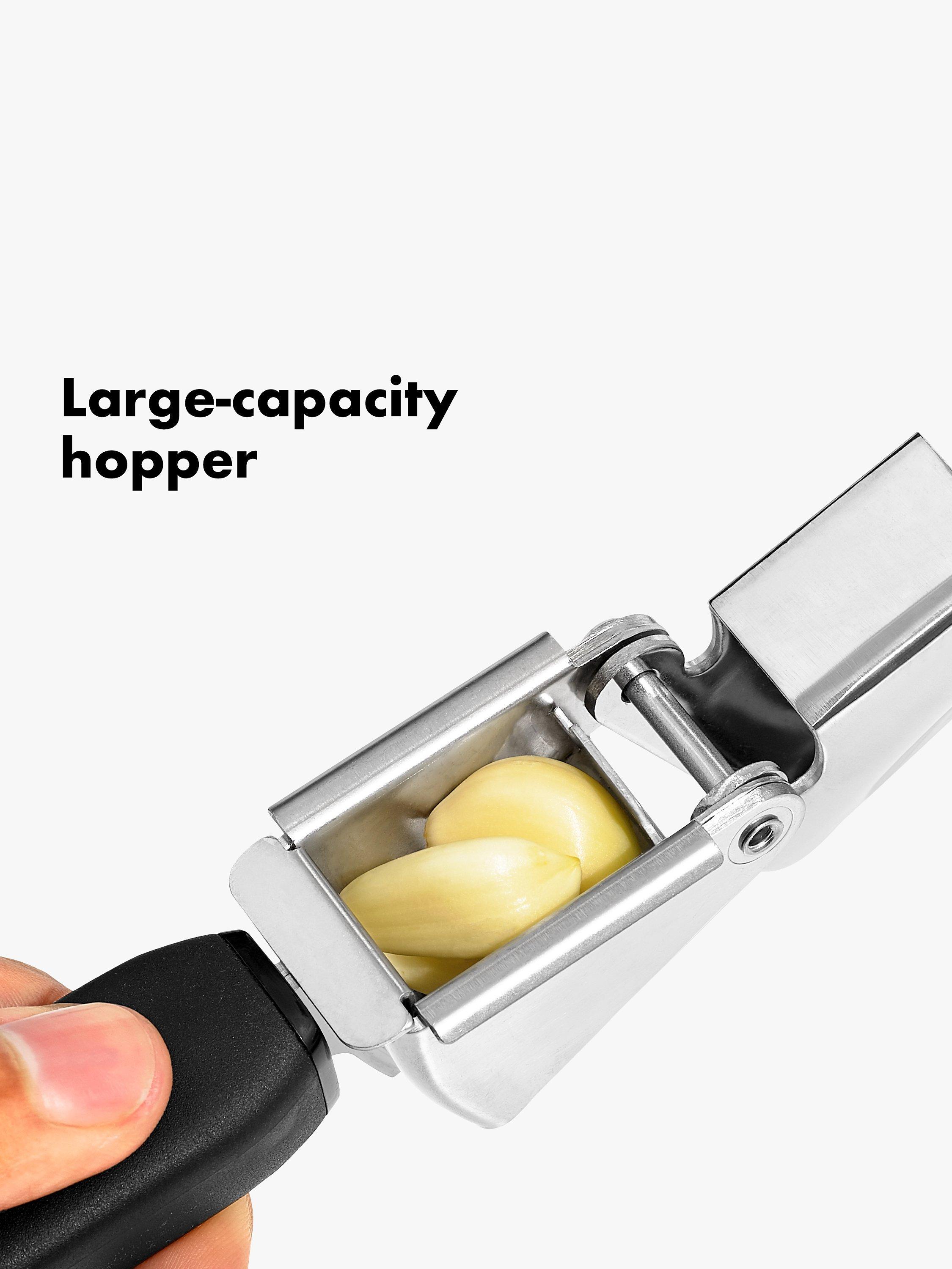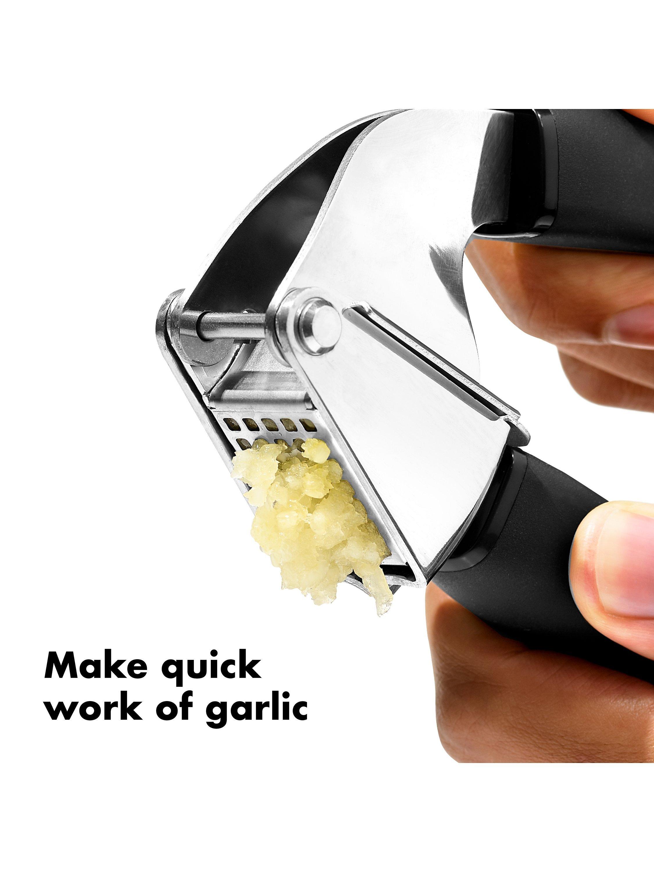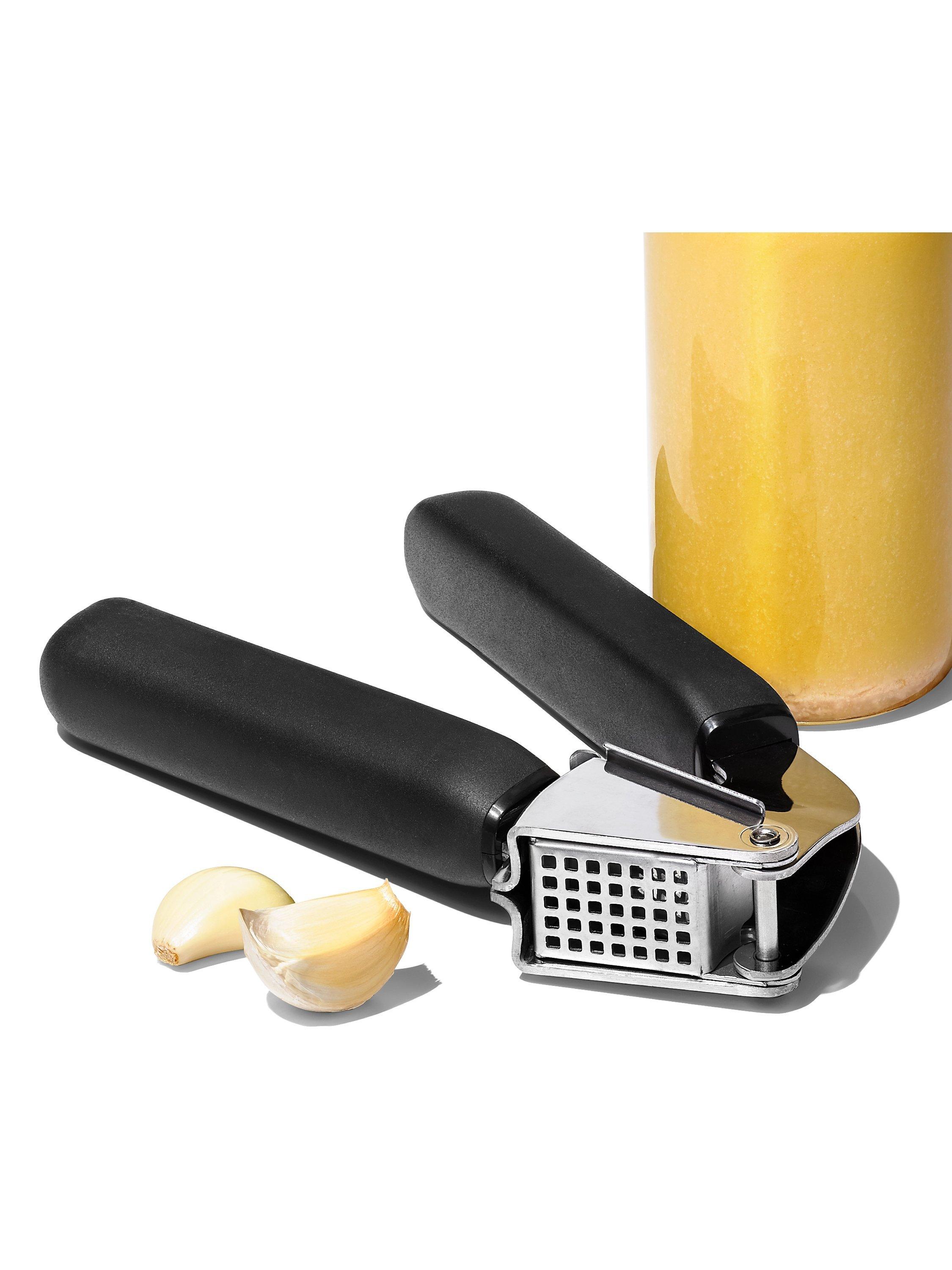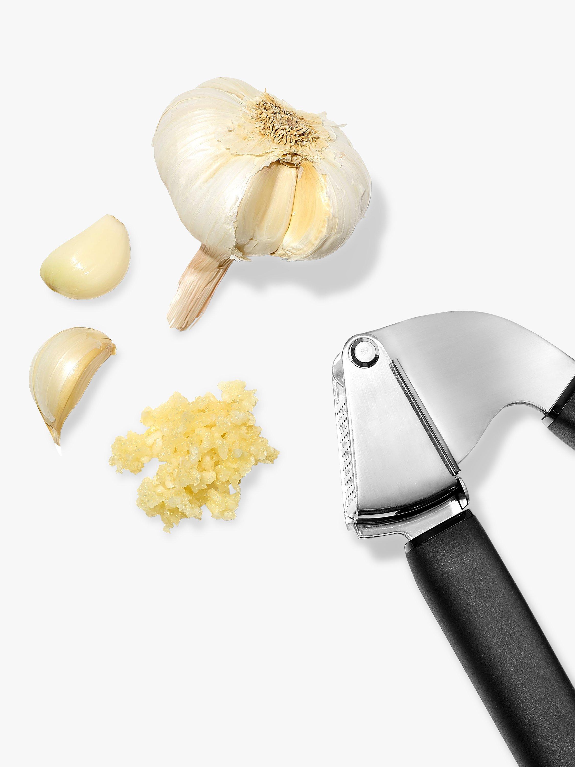 Love garlic but hate the mess of crushing it? With the comfortable and sturdy OXO Good Grips Garlic Press you can make light work of garlic and cleaning up as well. Made of sturdy stainless steel, its large-capacity hopper lets you crush multiple cloves at once. The soft, comfortable handles absorb pressure for easy squeezing.