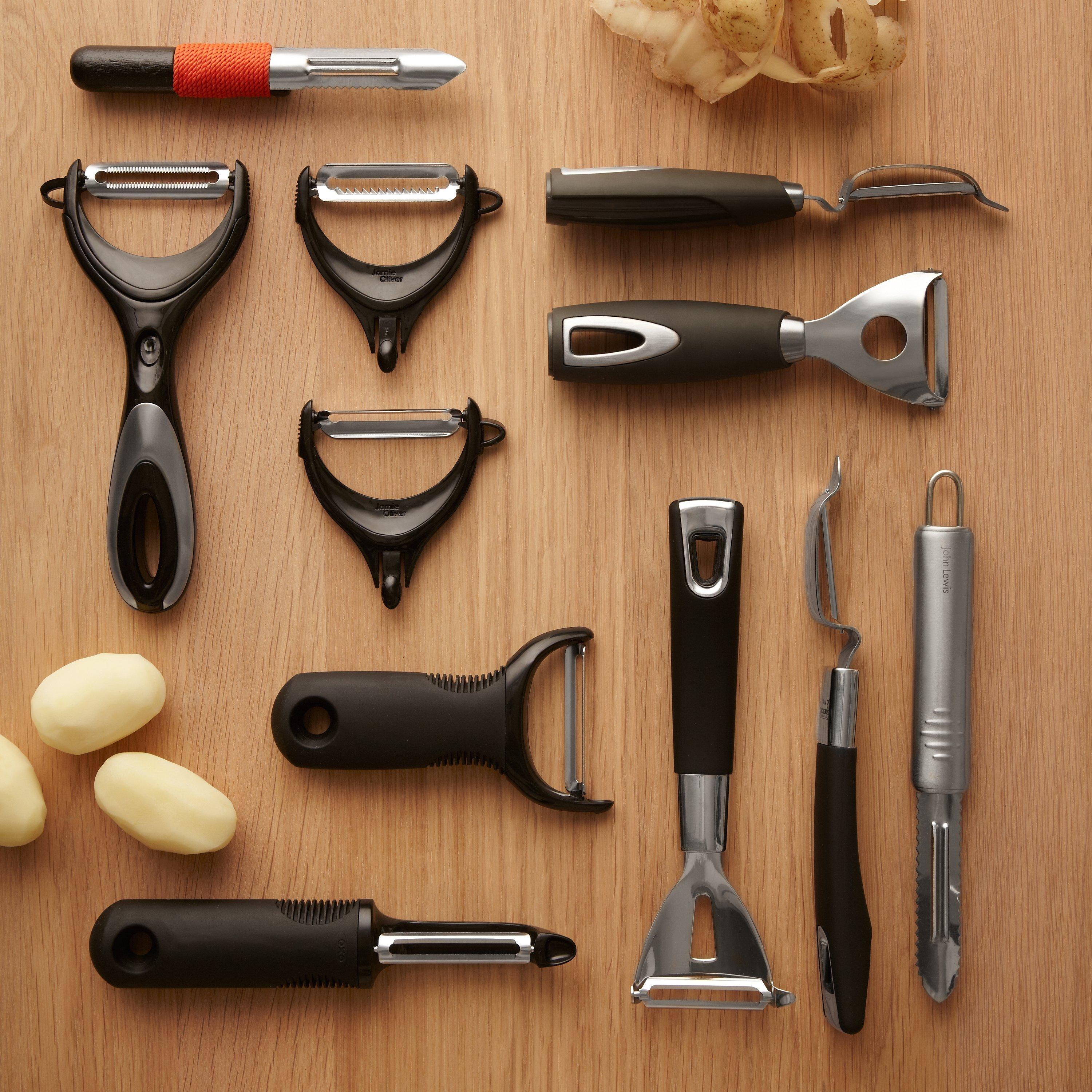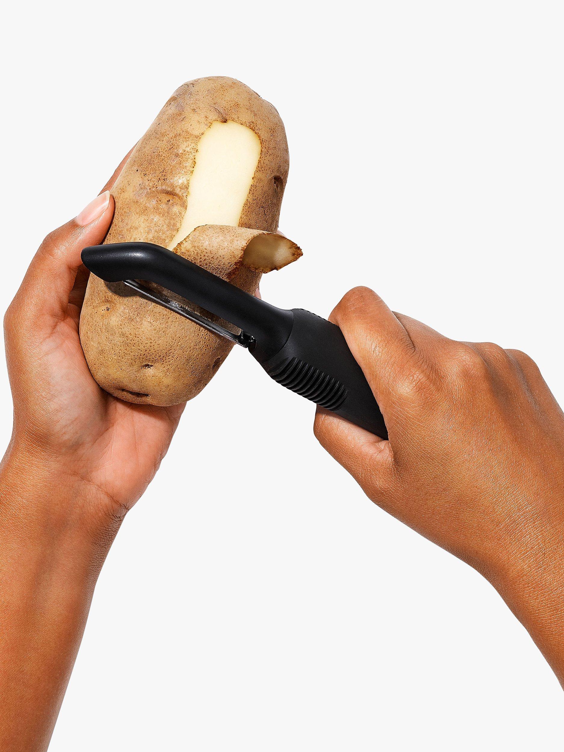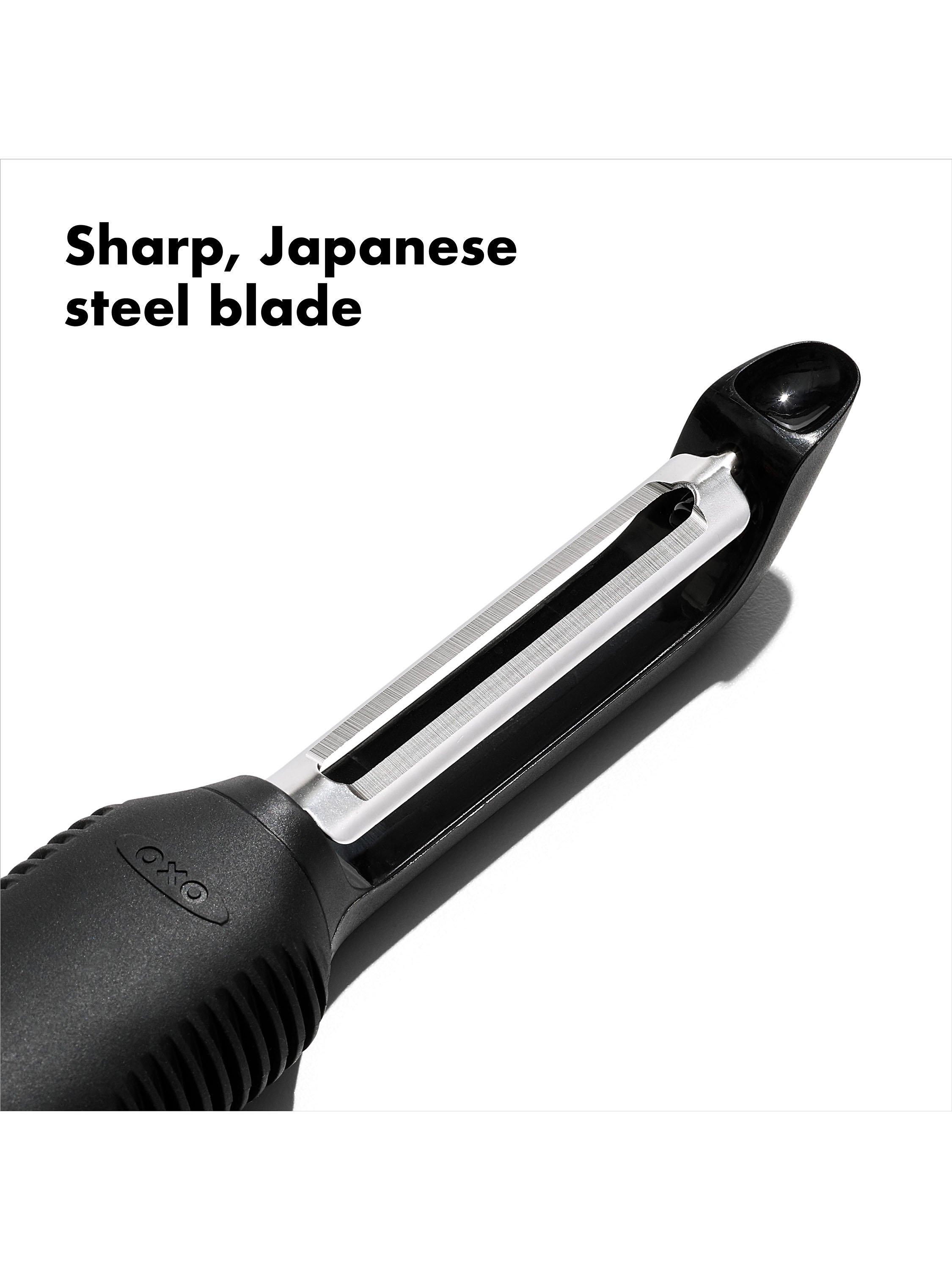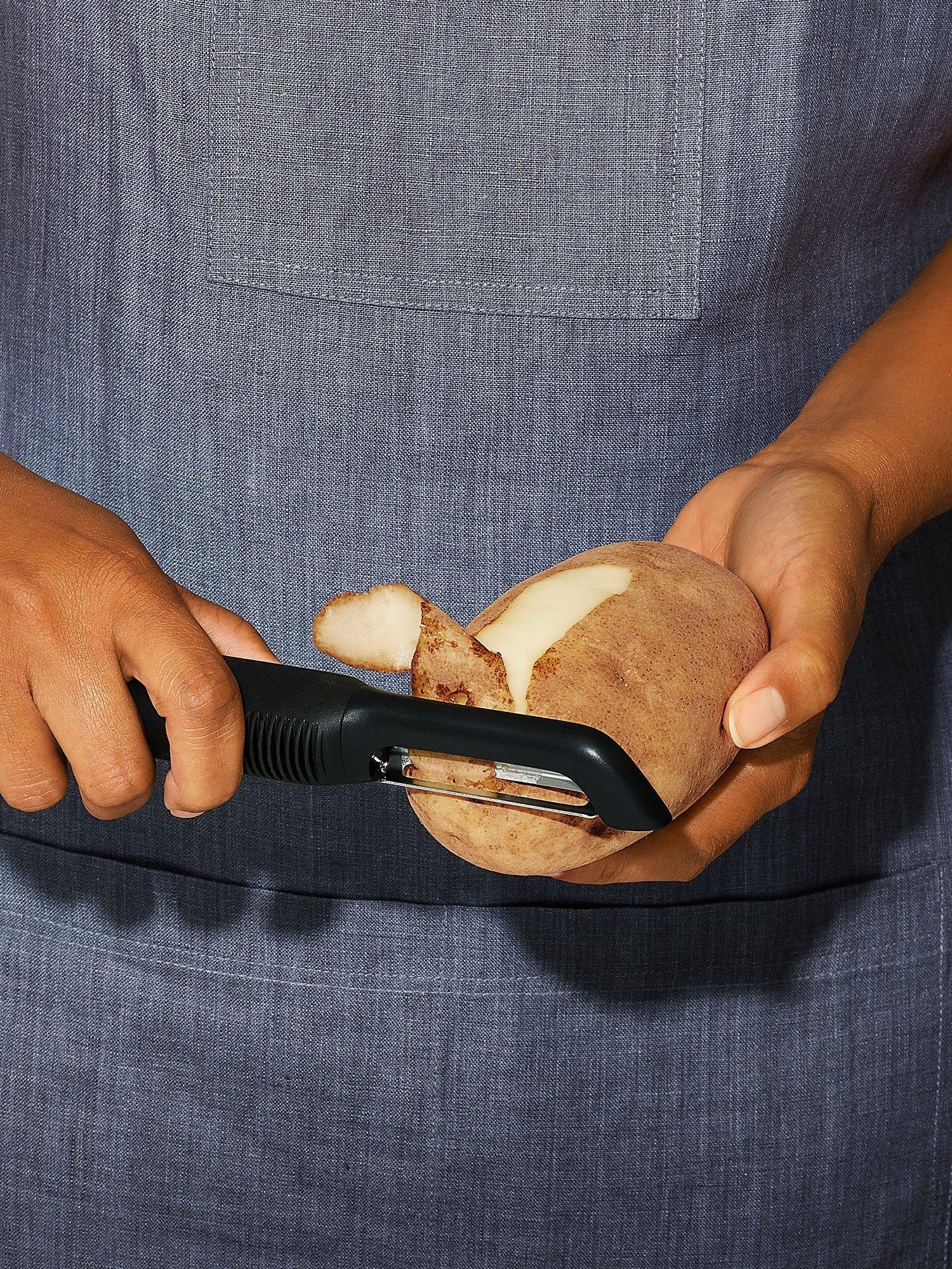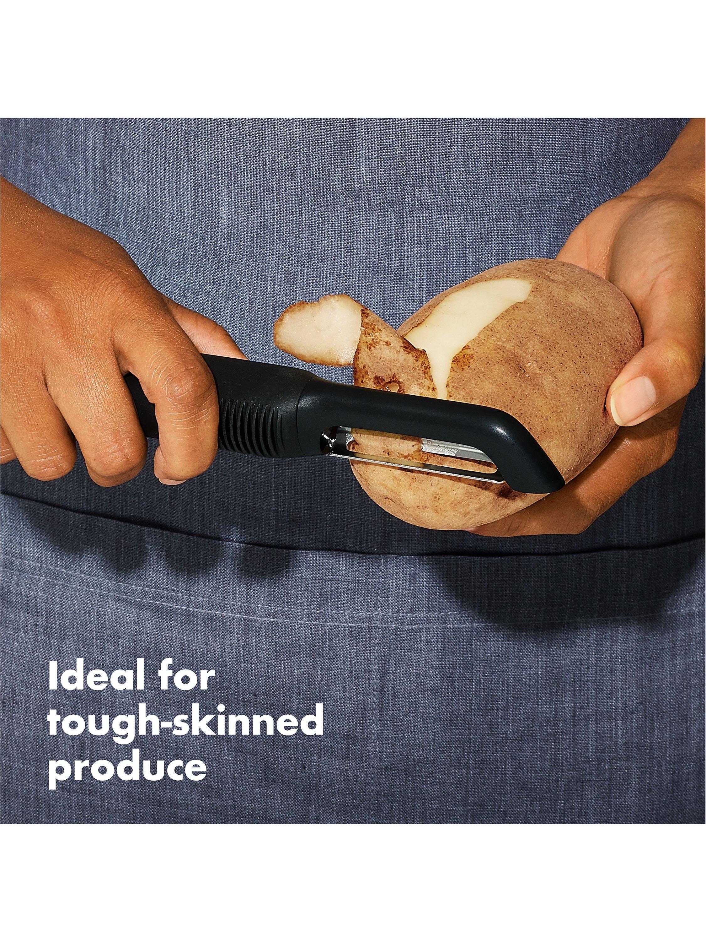 The award-winning OXO Good Grips Swivel Peeler is engineered to stay comfortable through fast, repetitive use. It's perfect for prepping tough-skinned fruits and vegetables like apples and cucumbers. Two sharp Japanese stainless steel blades flex to peel large areas with each stroke. The easy-grip handle is designed to work for lefties and righties, and it stays non-slip, even when wet.
