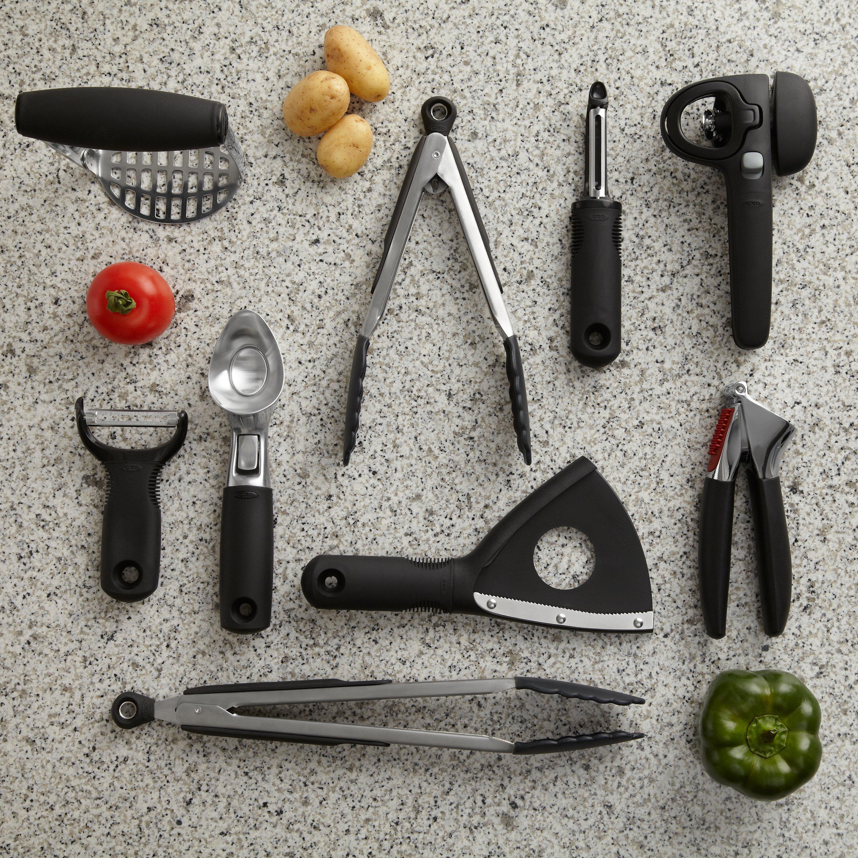 A durable, built-in potato eyer carves out blemishes without ruining your produce. The handle includes a hole for hanging storage. Rustproof and dishwasher safe.