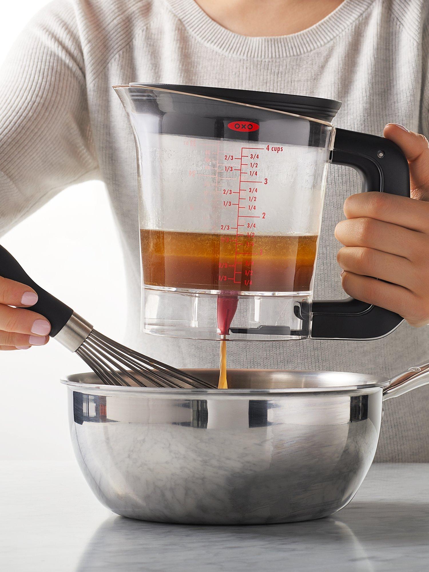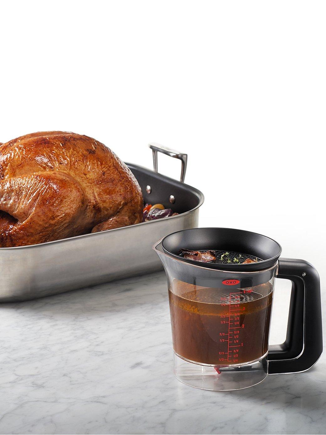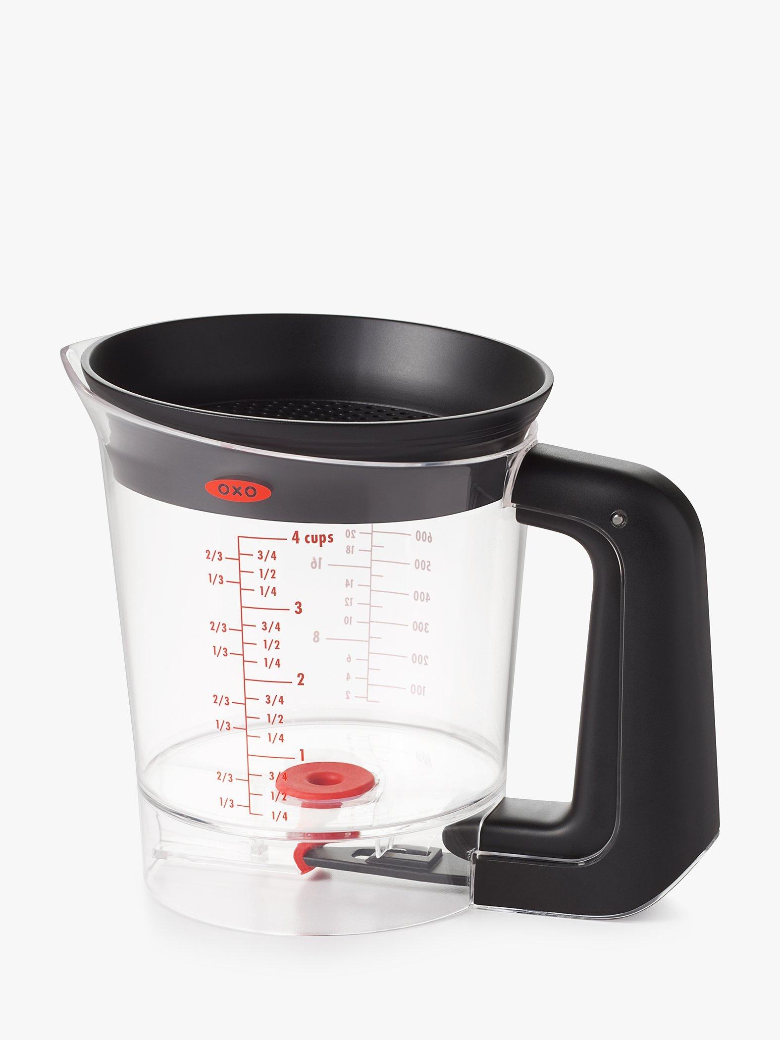This trigger-operated jug from OXO easily separates out the fat for healthier gravies, soups and sauces. Simply squeeze the trigger to release the gravy from the bottom and leave fat behind as the strainer catches unwanted bits, leaving a smooth sauce. Convenient measurement markings on the side to four cups (900ml). Heat-resistant and BPA-free nylon and a Tritan external mechanism for easy care and cleaning.