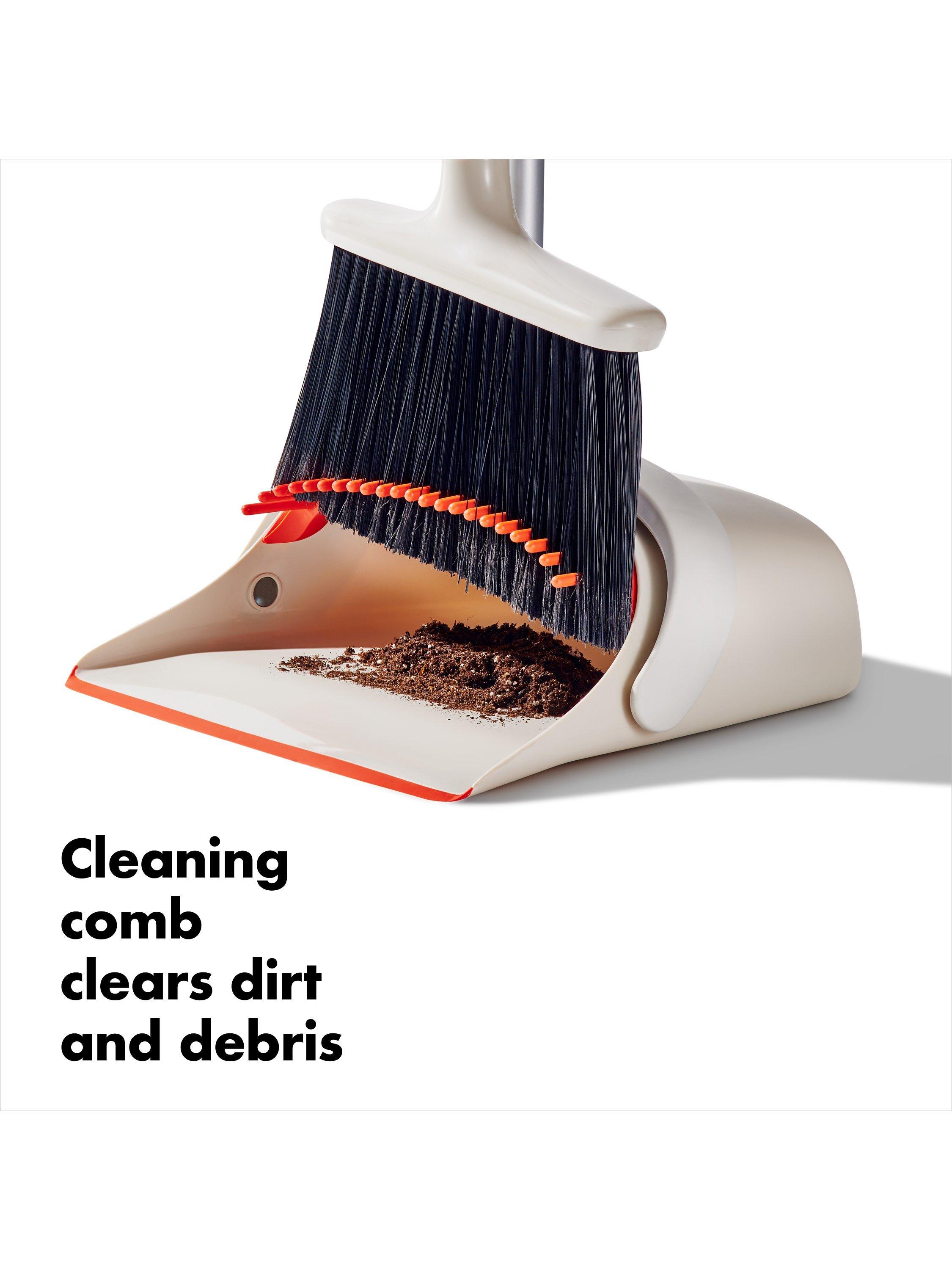 The dustpan’s built-in comb clears dirt and debris from the soft-tipped broom—no need to clean the bristles by hand to continue sweeping.
