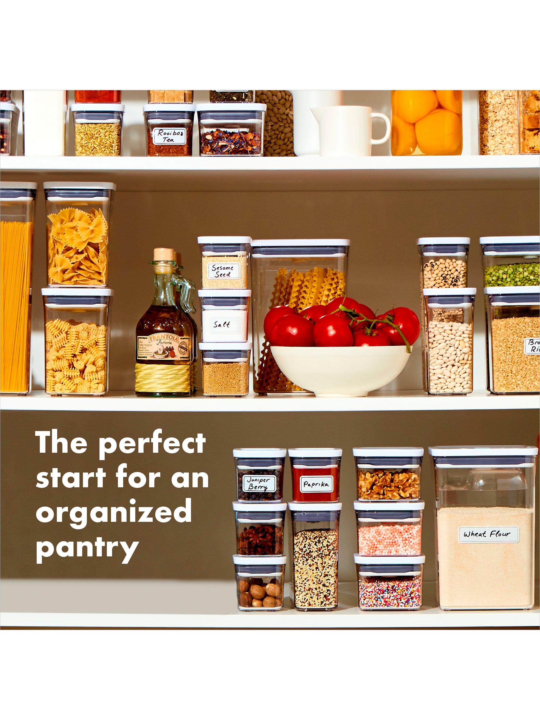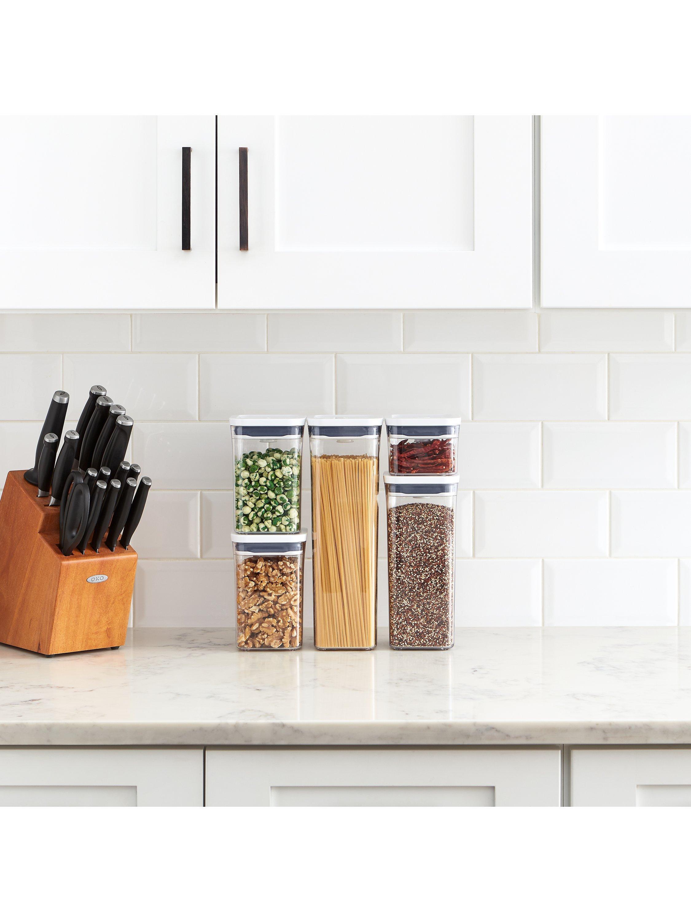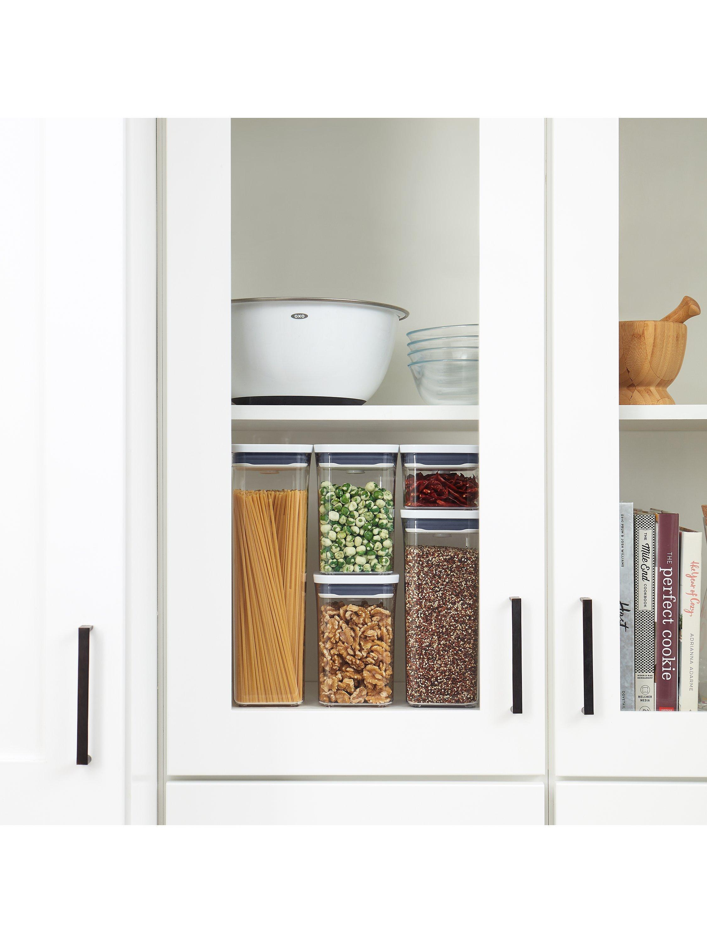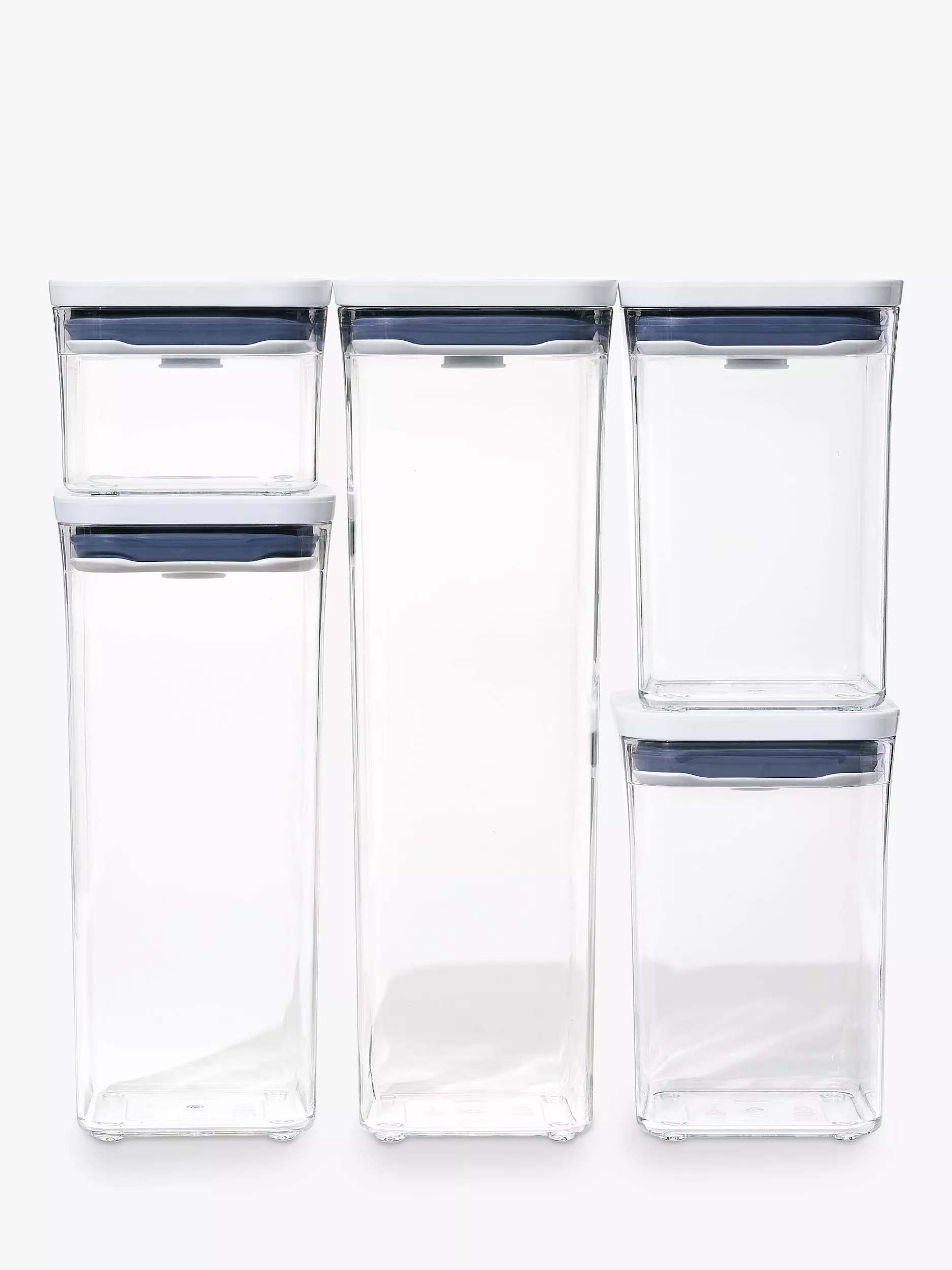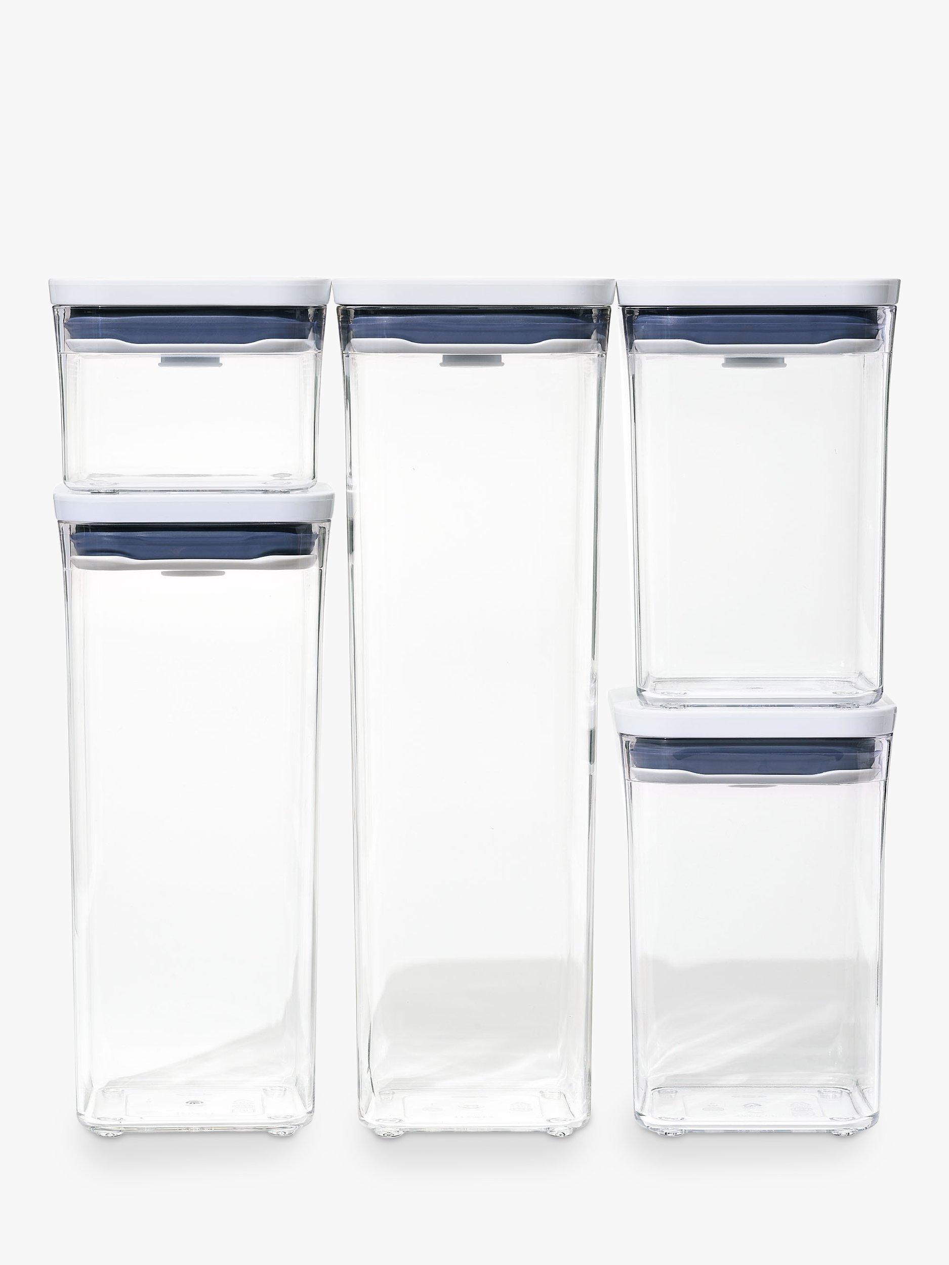 A set of five airtight storage containers for keeping dried foods or for home organisation. Easy to open with just one hand when you're busy in the kitchen, they're part of OXO's POP range of containers and are stackable for compact storage.