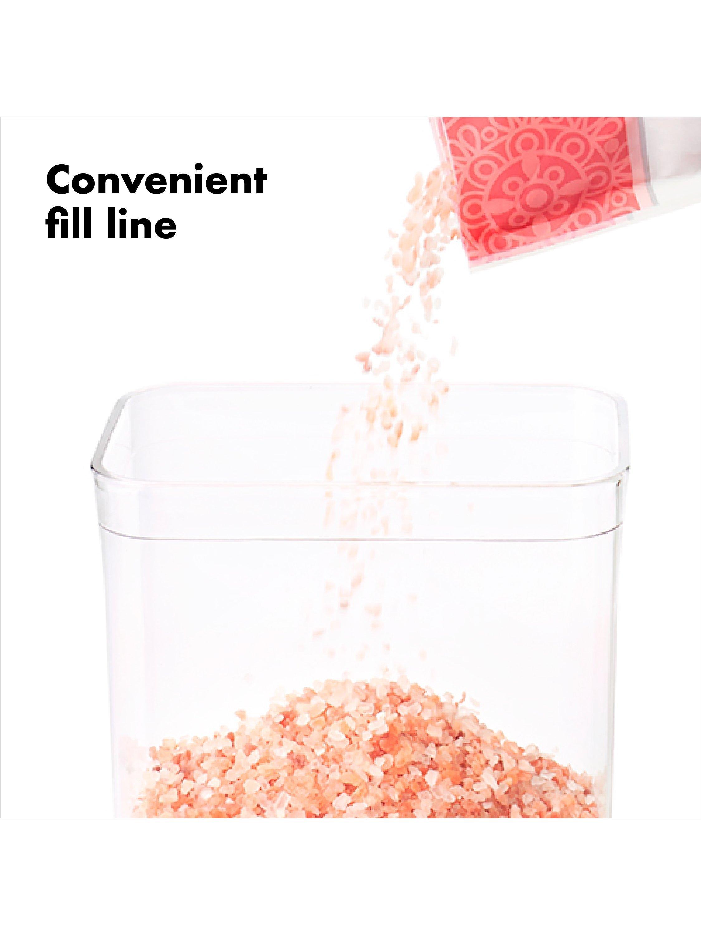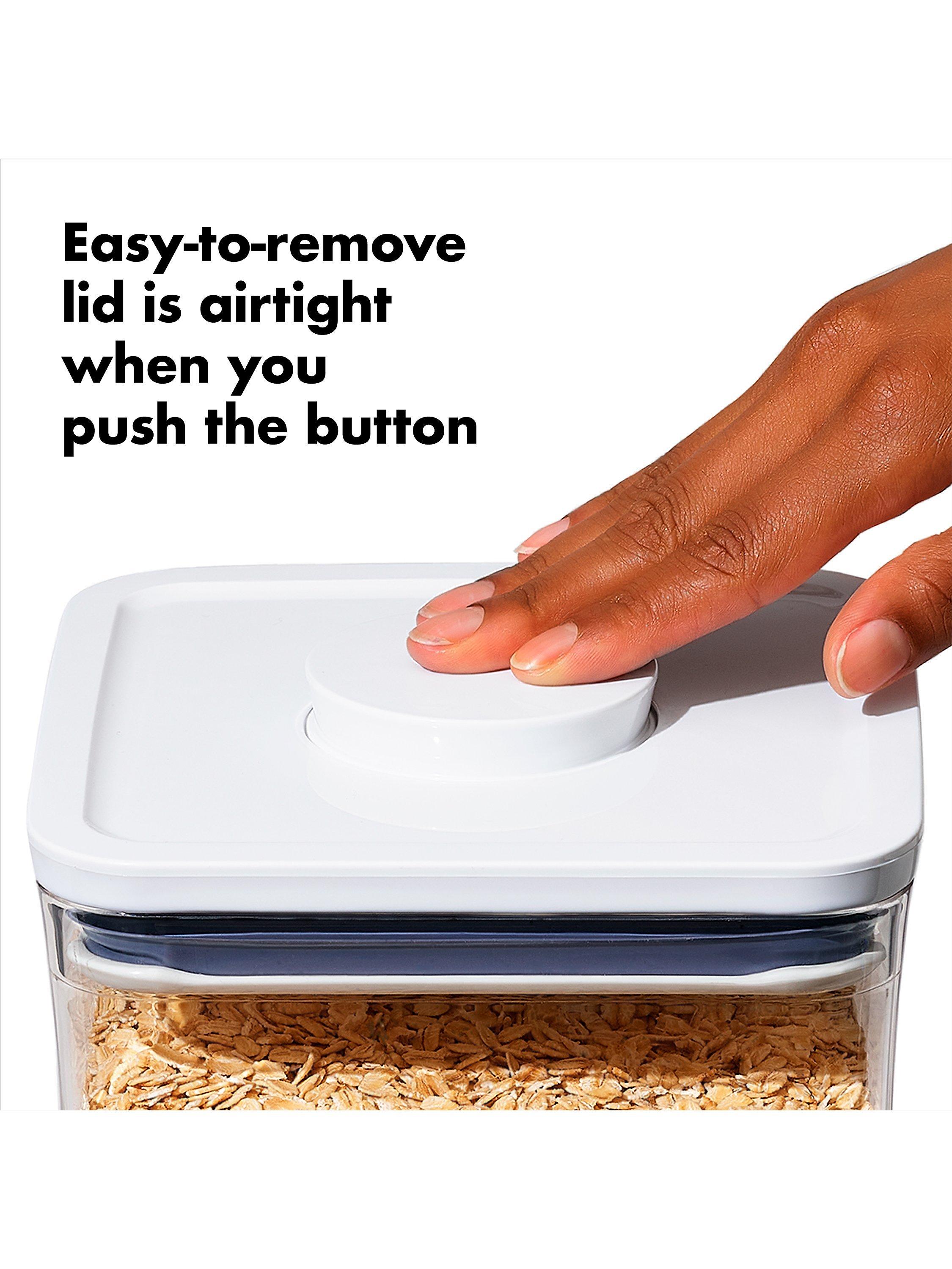 POP containers are available in different shapes and sizes to suit your needs. They're made of clear, BPA-free plastic with rounded corners for easy pouring and a push-button opening. The button pops up to use as a handle for the airtight-sealed lid. A handy fill line helps prevent over-filling and the containers are dishwasher safe for easy cleaning.