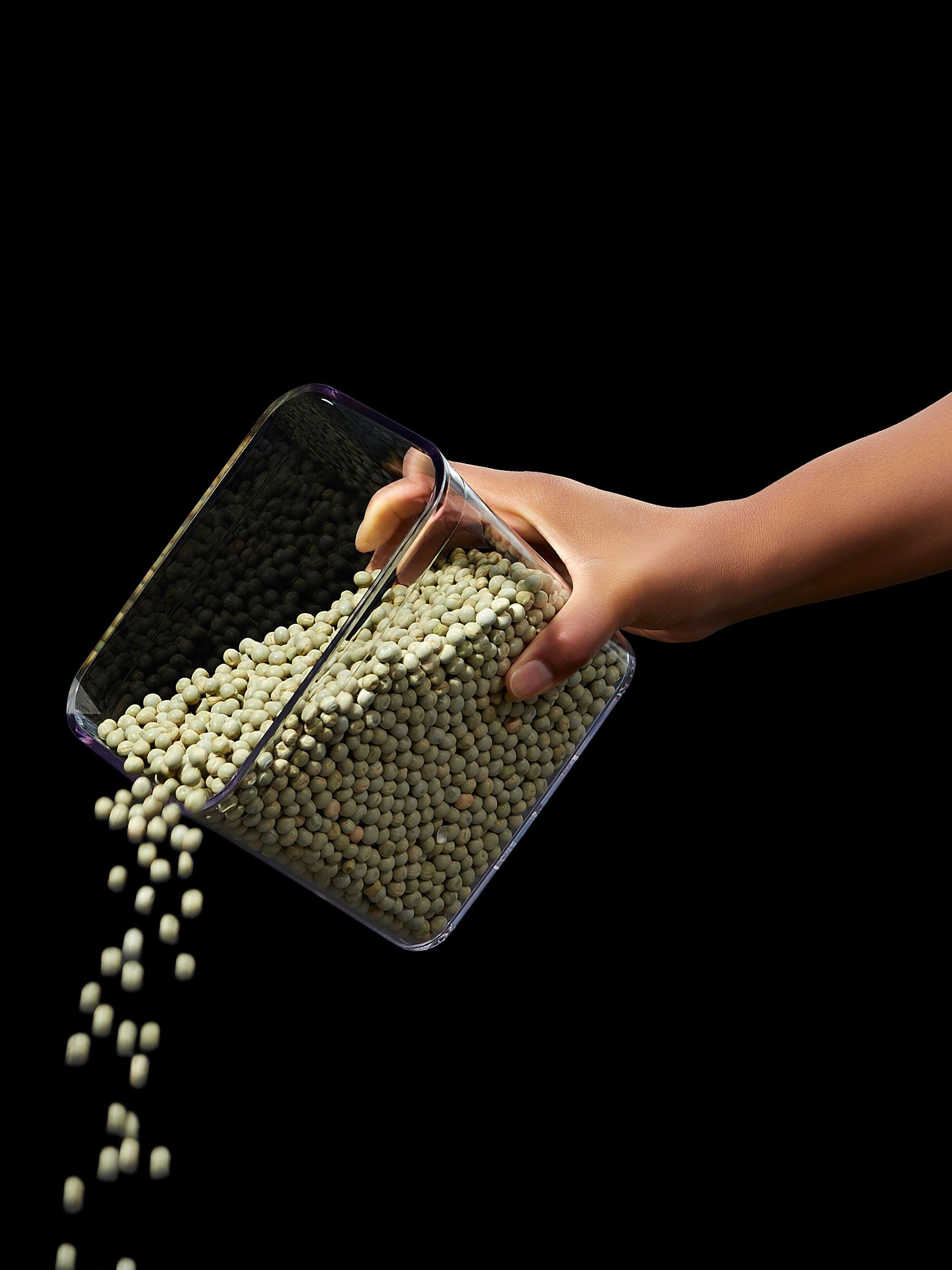 POP containers are made of clear, BPA-free plastic with rounded corners for easy pouring and a push-button opening. A handy fill line helps prevent over-filling and the containers are dishwasher safe for easy cleaning, on the top rack.