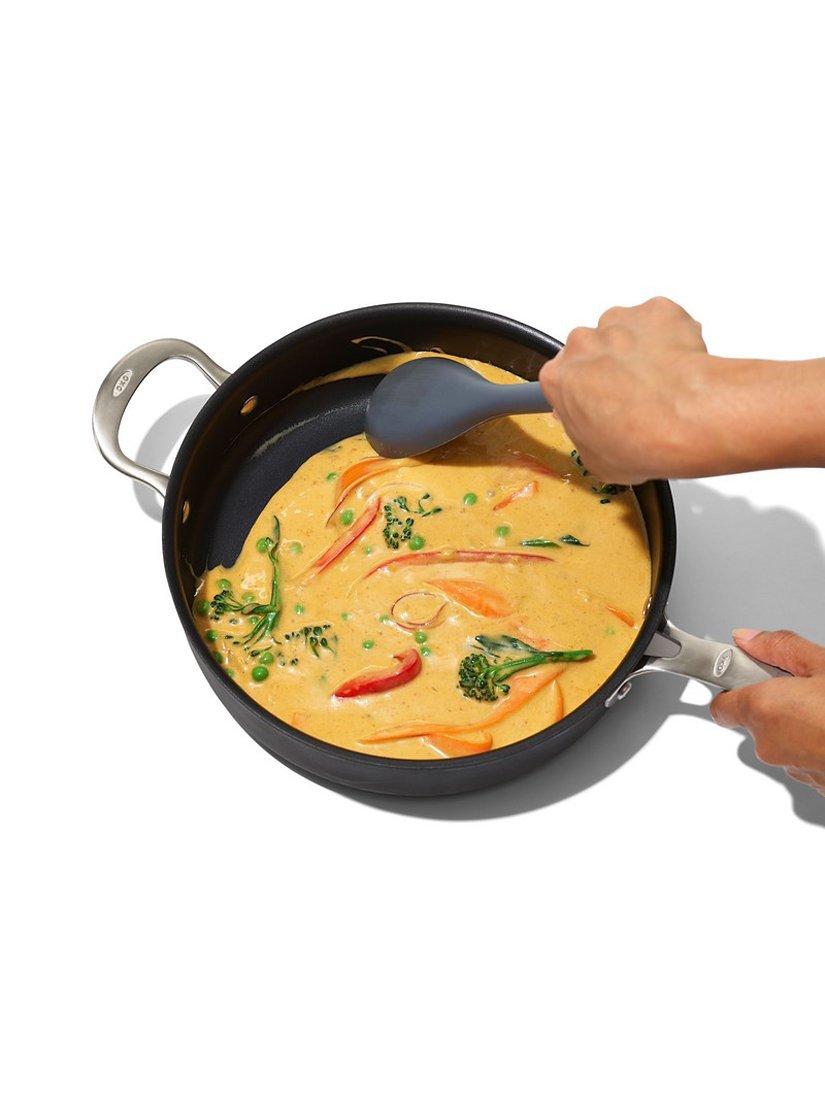 The OXO Good Grips Silicone Chop and Stir Cooking Spoon is the perfect tool for preparing everything from bolognese sauce to tortilla soup, thanks to careful engineering. The rounded shape and flexible tip fit perfectly against the curves of pots and pans so you never miss a bit as you scoop and serve. The spoon's sides are stiff and strong enough for chopping ground beef in the pan, and you can efficiently scrape pans for deglazing. Heat-resistant silicone allows you to work directly over high heat without damaging non-stick pans. The spoon's polished edges also glide across stainless steel without resistance. The long handle is ideal for even deep pots, and the soft, non-slip grip stays comfortable in hand no matter how long you need to stir that slow-cooked sauce. This sturdy spoon is dishwasher safe for fast clean-up.