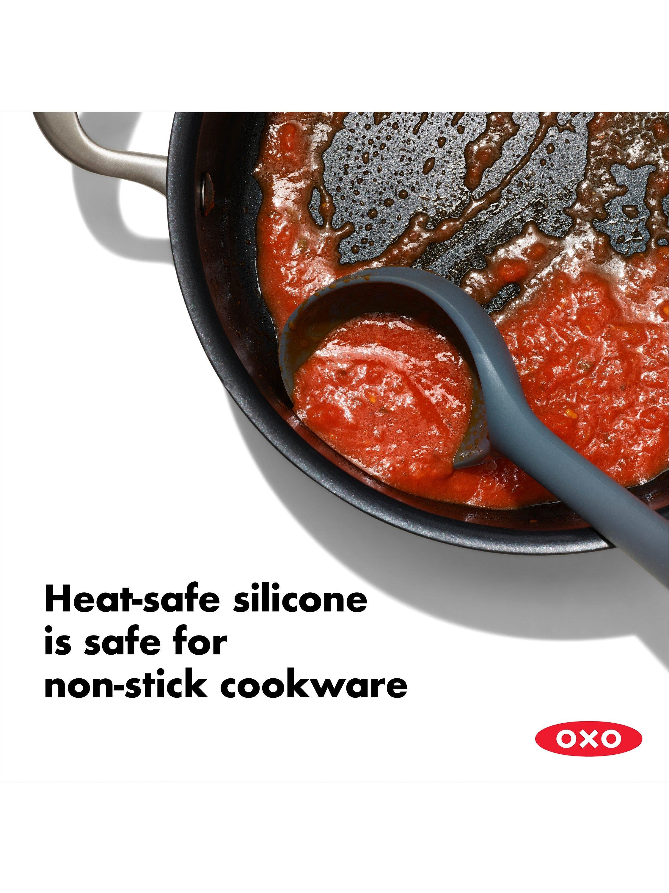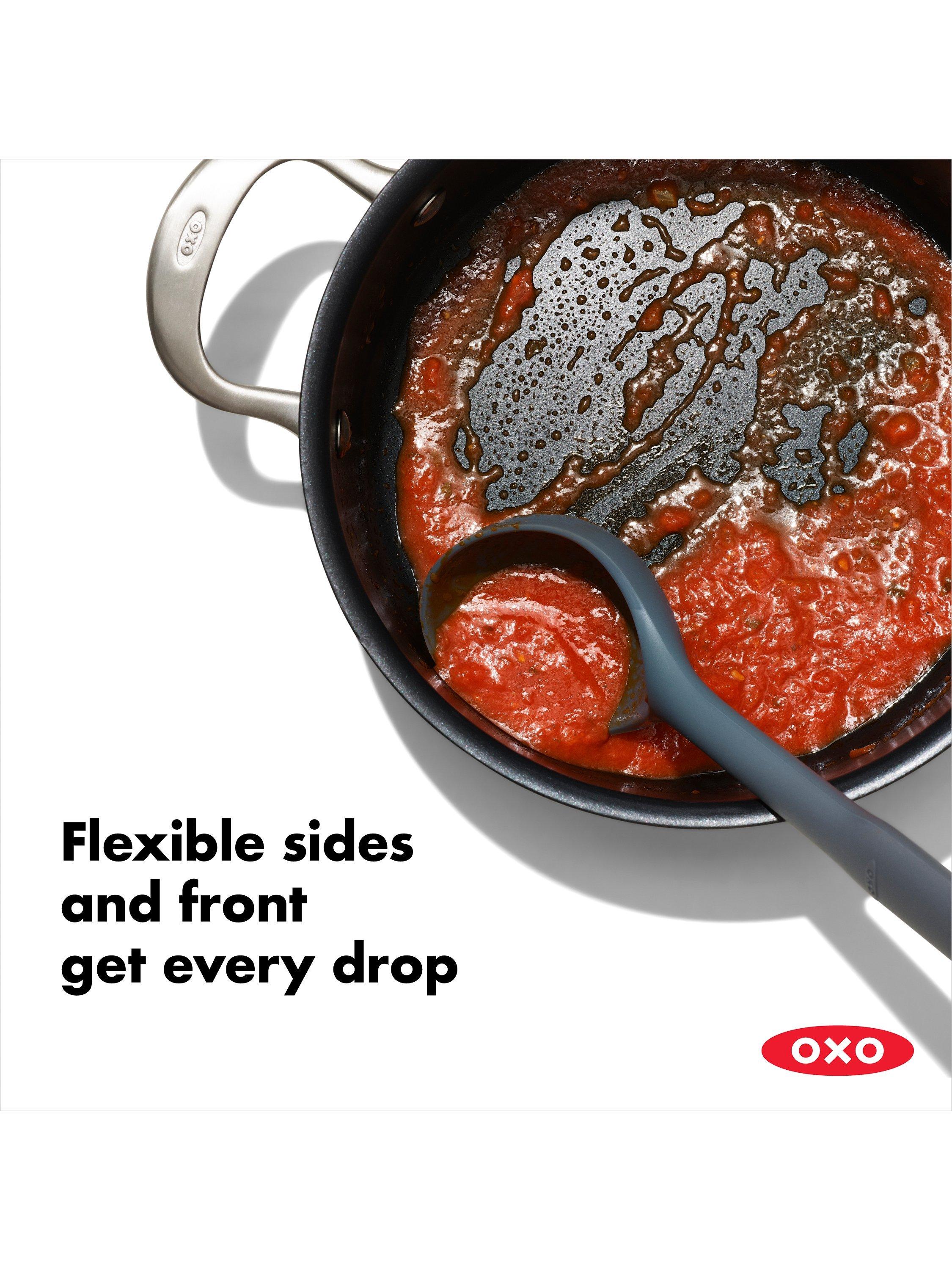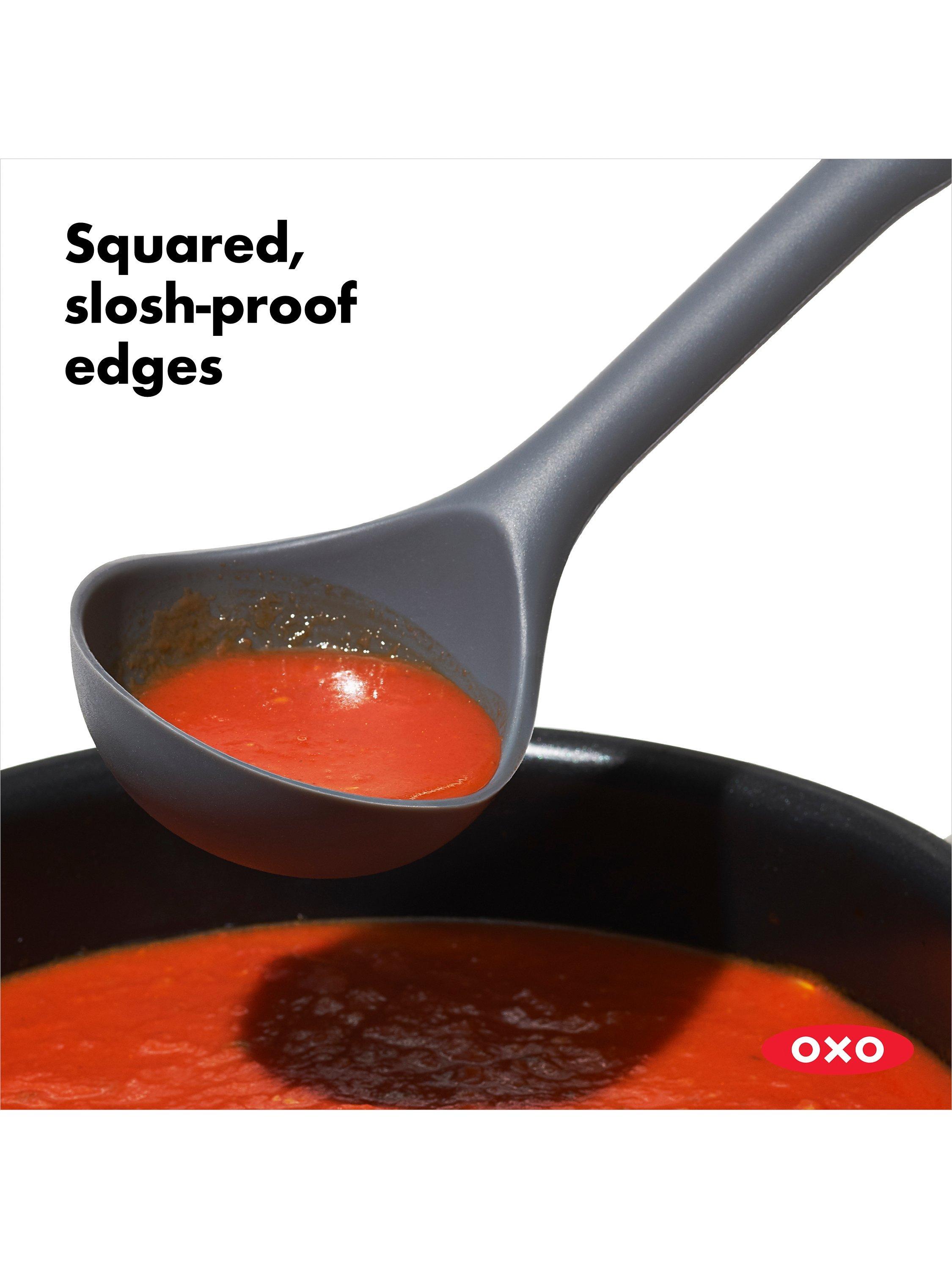 With the OXO Good Grips Silicone Everyday Ladle, it's never a struggle to get every last spoonful of soup or spaghetti sauce out of the pot and into your dish. The flexible front and sides bend to conform to the curve of your pot, so you can easily scoop out all of your delicious cooking to serve or store in the fridge for later. The ladle is generously sized, with square edges that stop drips and create a cleaner pouring surface. The unique angled design and sturdy central core keep liquid where it belongs when scooping and placing food into bowls. The soft, non-slip grip is comfortable in your hand, no matter how many helpings of chili you serve to your guests. Heat-safe silicone is gentle on non-stick cookware and is dishwasher safe, so clean-up is a breeze.