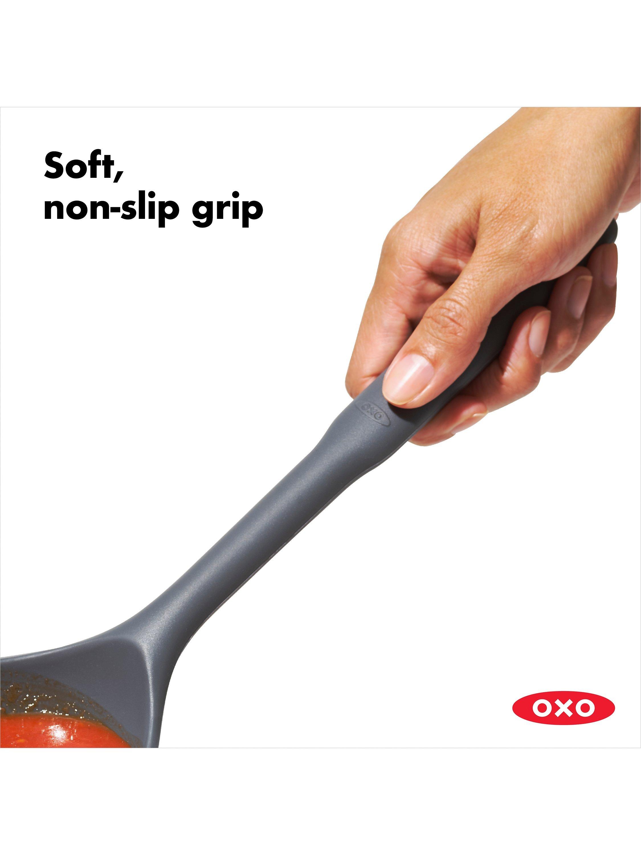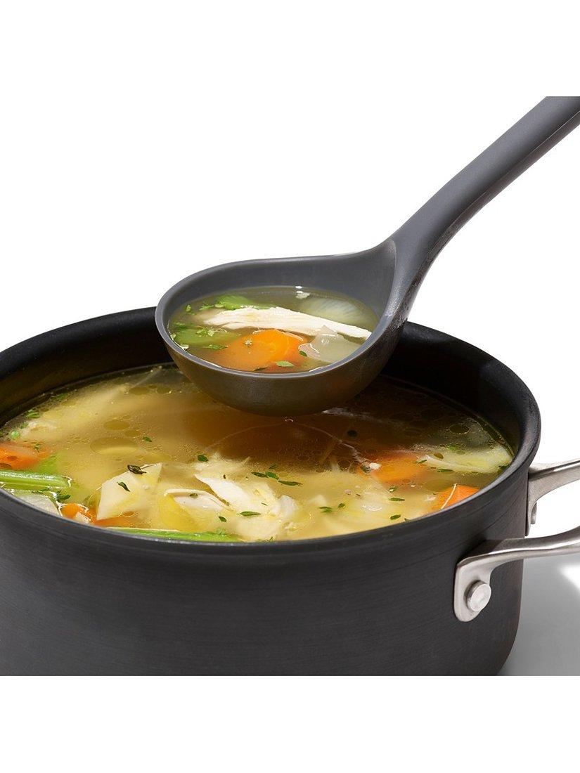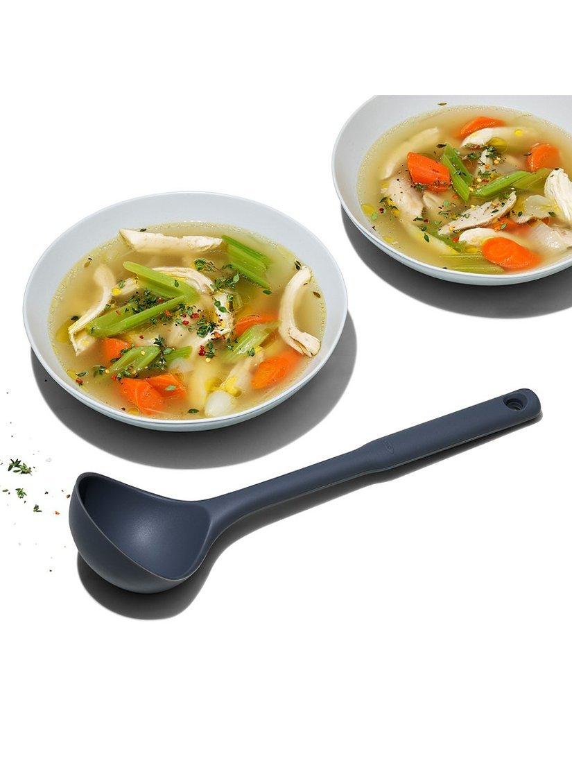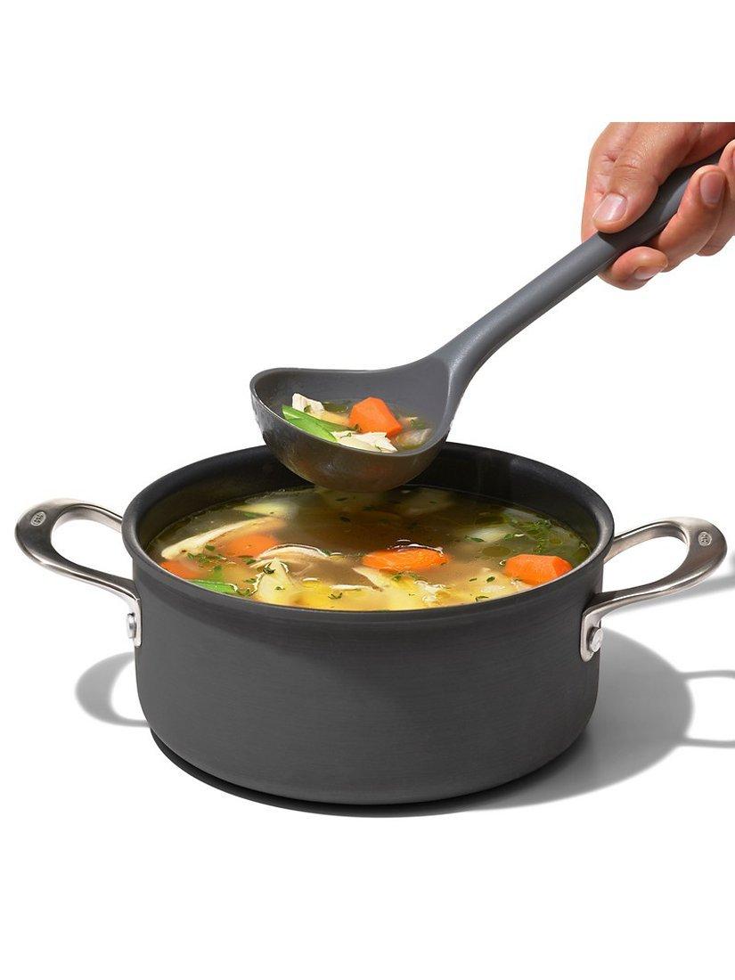 With the OXO Good Grips Silicone Everyday Ladle, it's never a struggle to get every last spoonful of soup or spaghetti sauce out of the pot and into your dish. The flexible front and sides bend to conform to the curve of your pot, so you can easily scoop out all of your delicious cooking to serve or store in the fridge for later. The ladle is generously sized, with square edges that stop drips and create a cleaner pouring surface. The unique angled design and sturdy central core keep liquid where it belongs when scooping and placing food into bowls. The soft, non-slip grip is comfortable in your hand, no matter how many helpings of chili you serve to your guests. Heat-safe silicone is gentle on non-stick cookware and is dishwasher safe, so clean-up is a breeze.