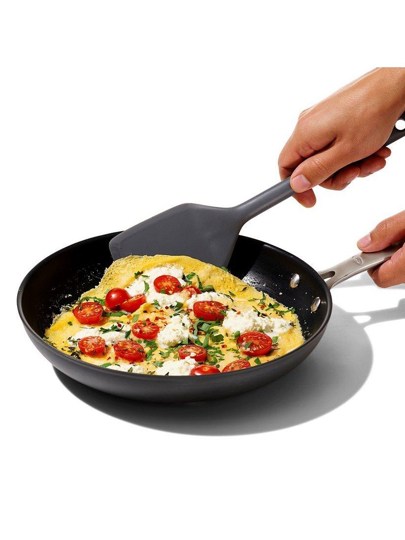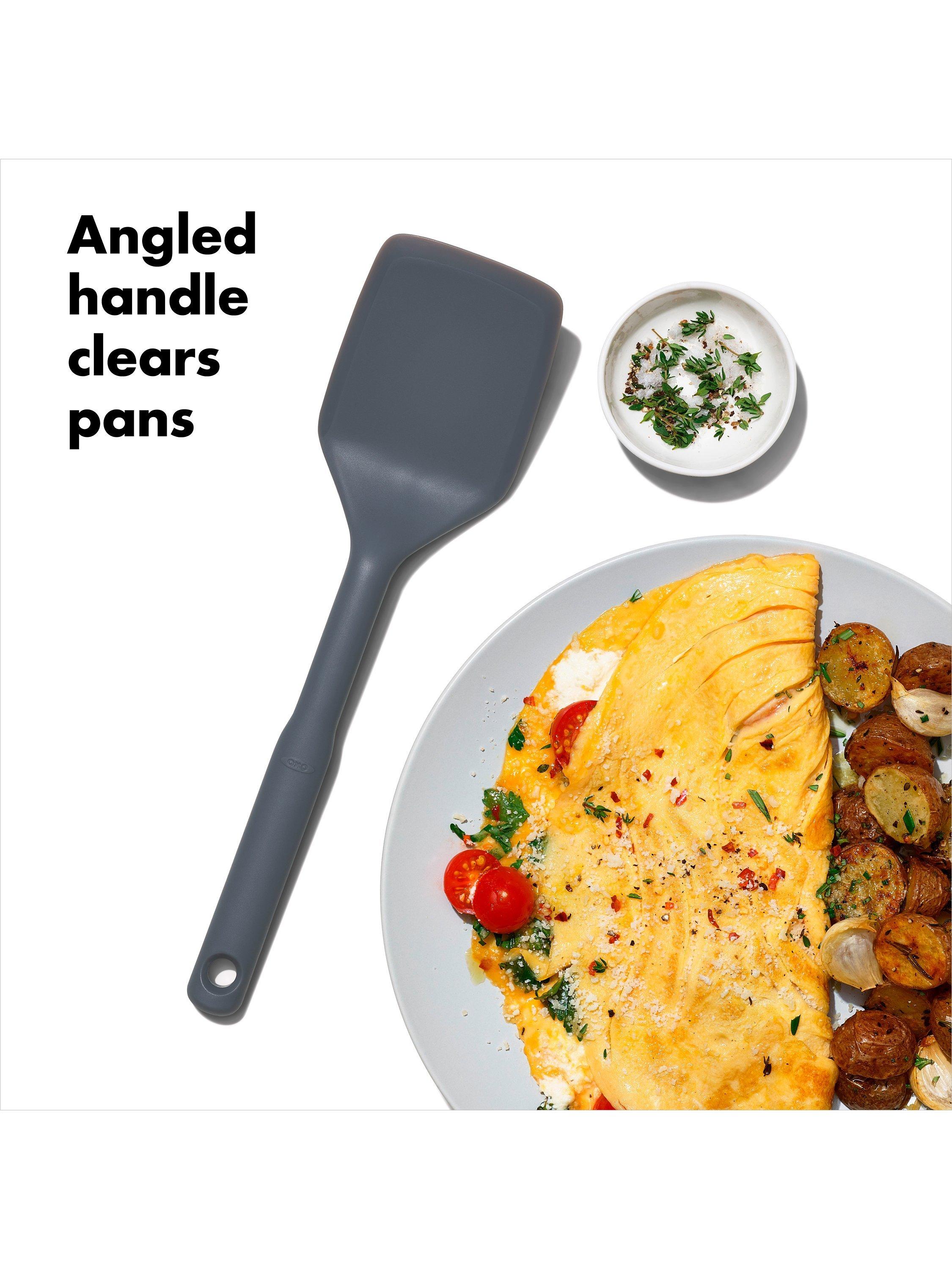 The OXO Good Grips Silicone Small Flexible Turner fits perfectly in small frying pans. This sturdy turner is just right for flipping eggs, lifting fish filets and transferring burgers from pan to plate. The flexible metal core is encased in heat-resistant silicone for use in hot pans and sheet pans straight out of the oven (up to 550ºF/288ºC). The compact turner's head has beveled edges that easily slip under food and hug the sides of pans for fast deglazing. It's also sturdy enough to chop up ground meat without scratching non-stick cookware. With a precision-angled neck to better clear the sides of the pan, and a non-slip handle for a comfortable grip. Dishwasher safe.