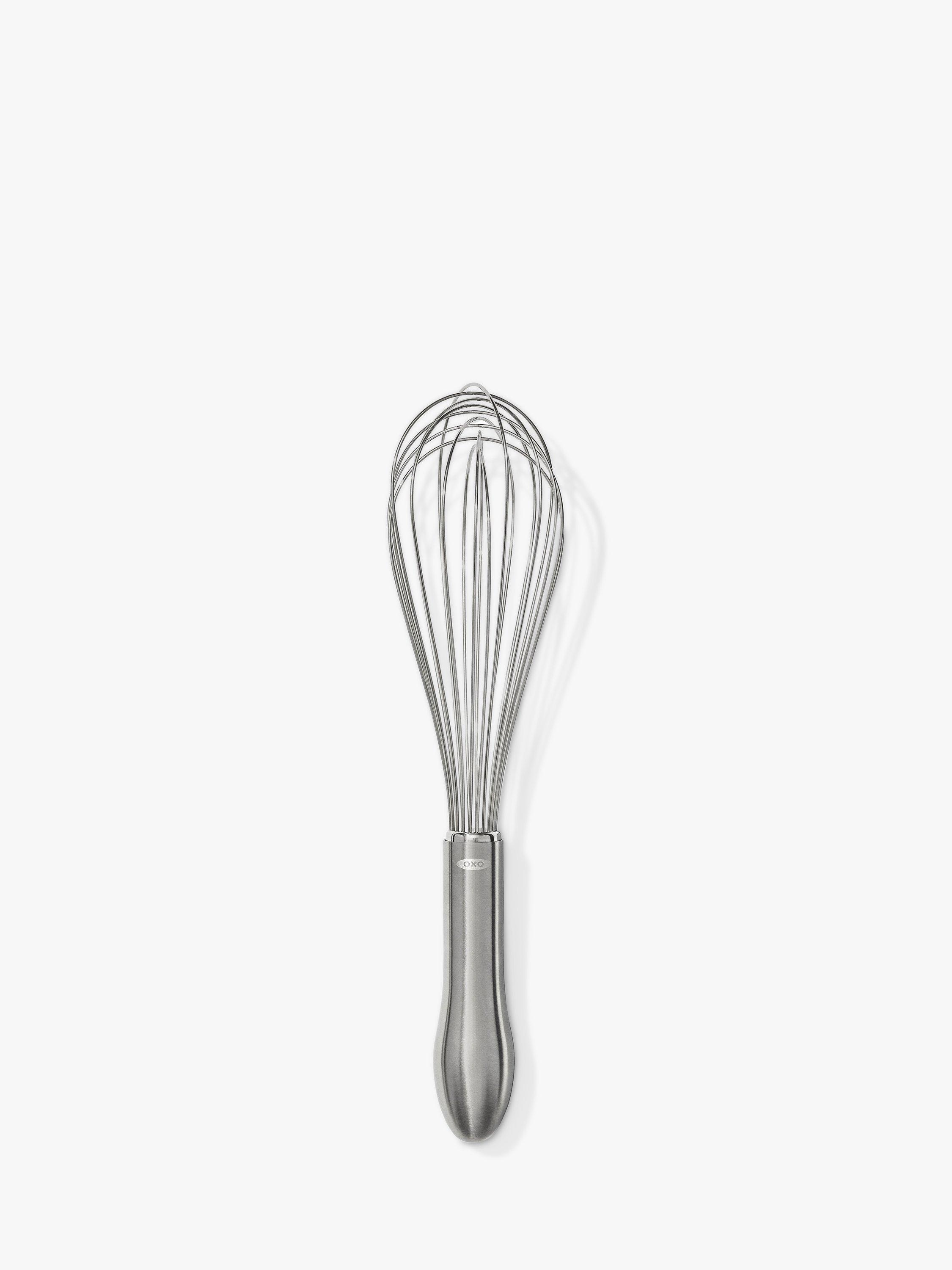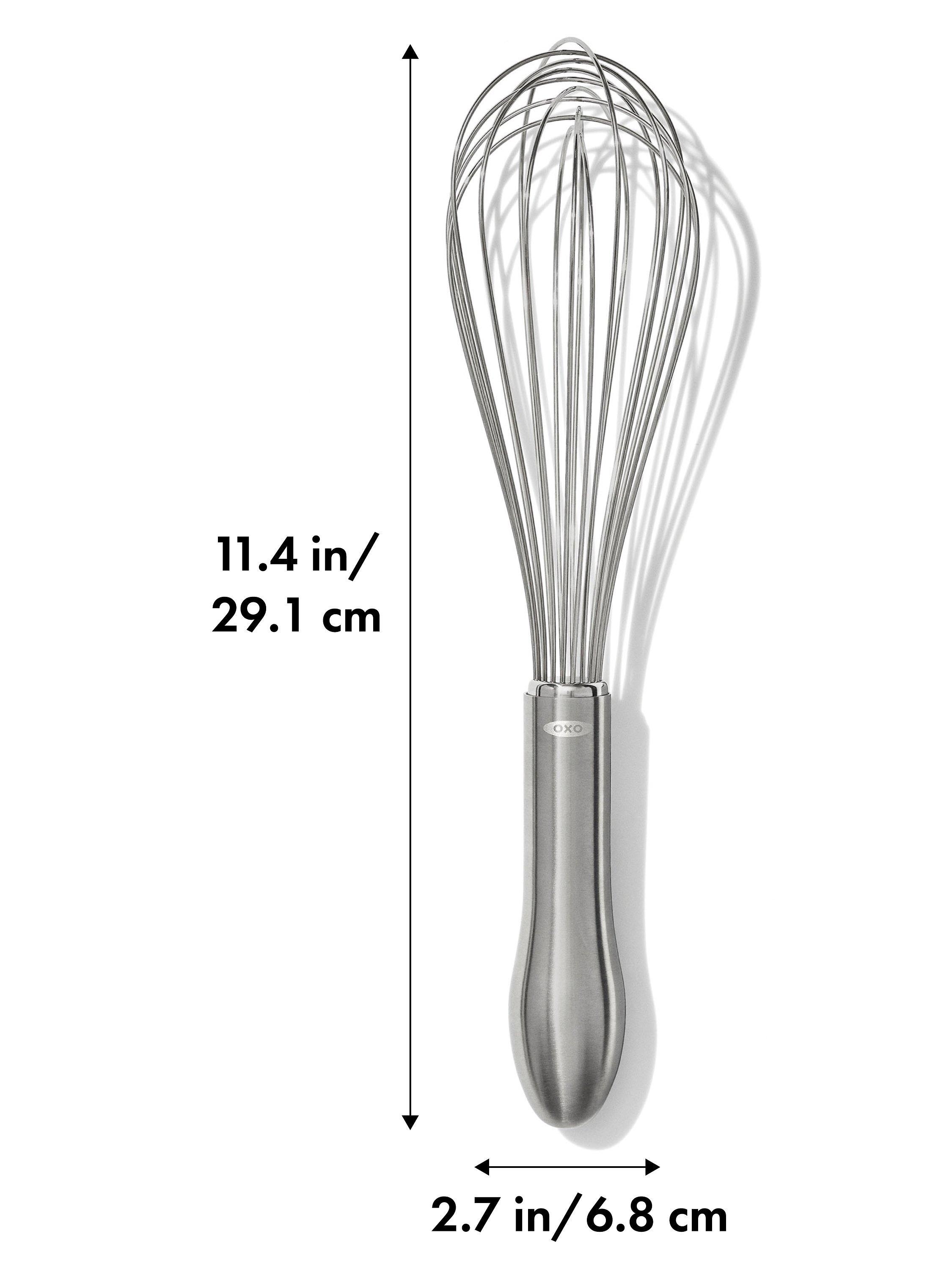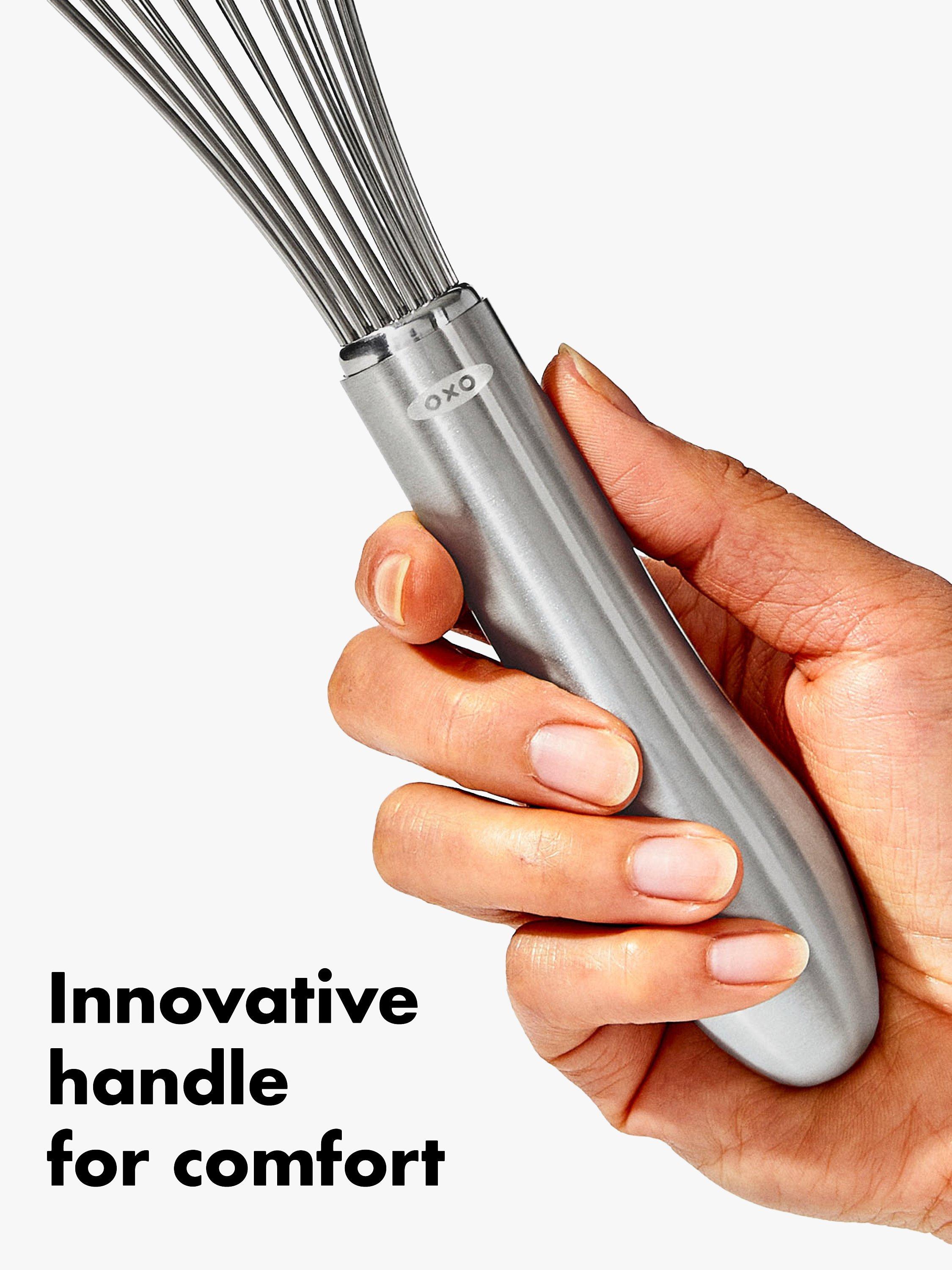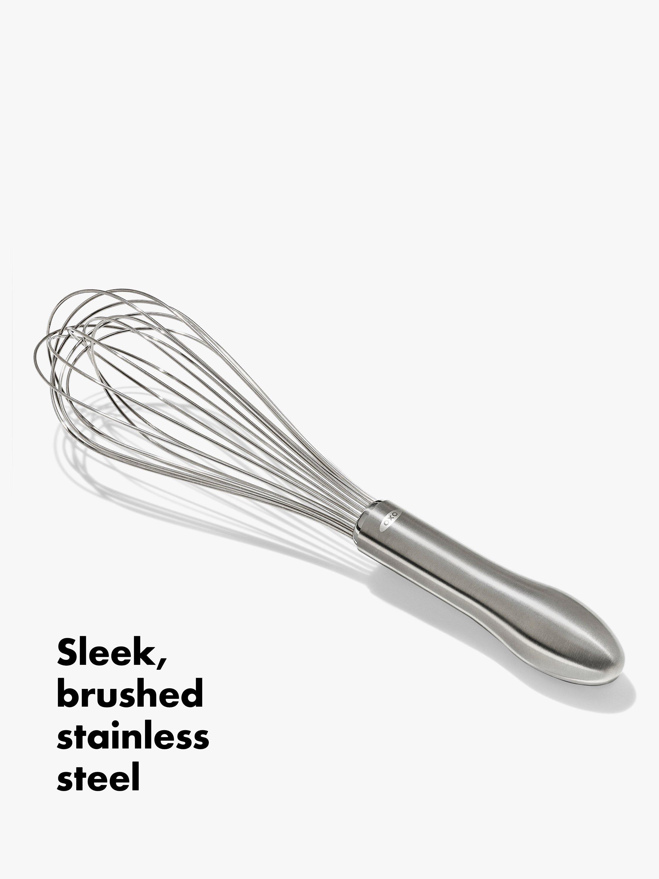 Whether you're scrambling eggs or mixing a waffle batter, with this OXO whisk you'll whip with less fatigue. The elegant brushed stainless steel handle has an innovative design that fits in the palm of your hand for comfort during repetitive motion. The wires are engineered to blend ingredients efficiently. The narrow shape is ideal for whisking and blending.