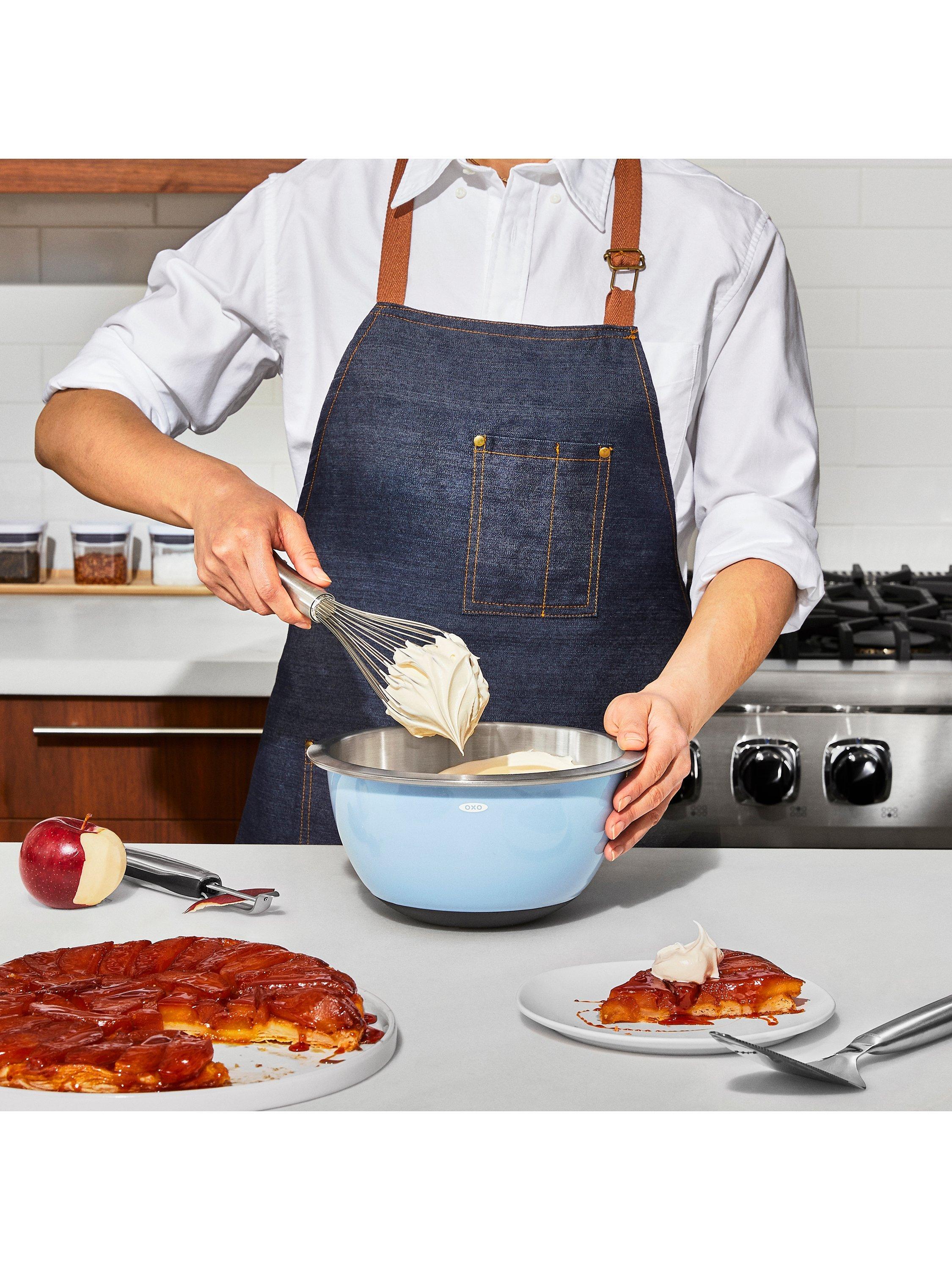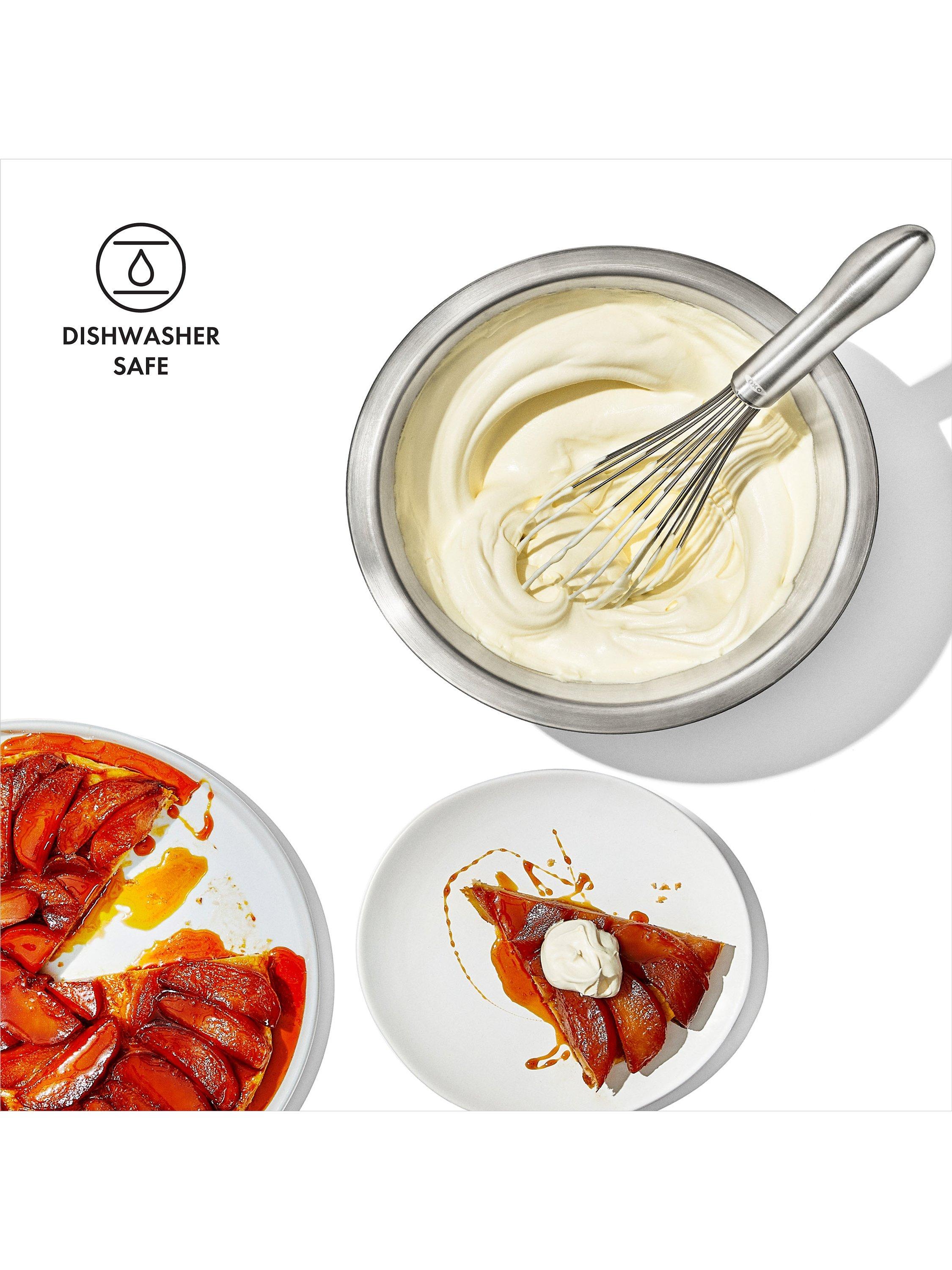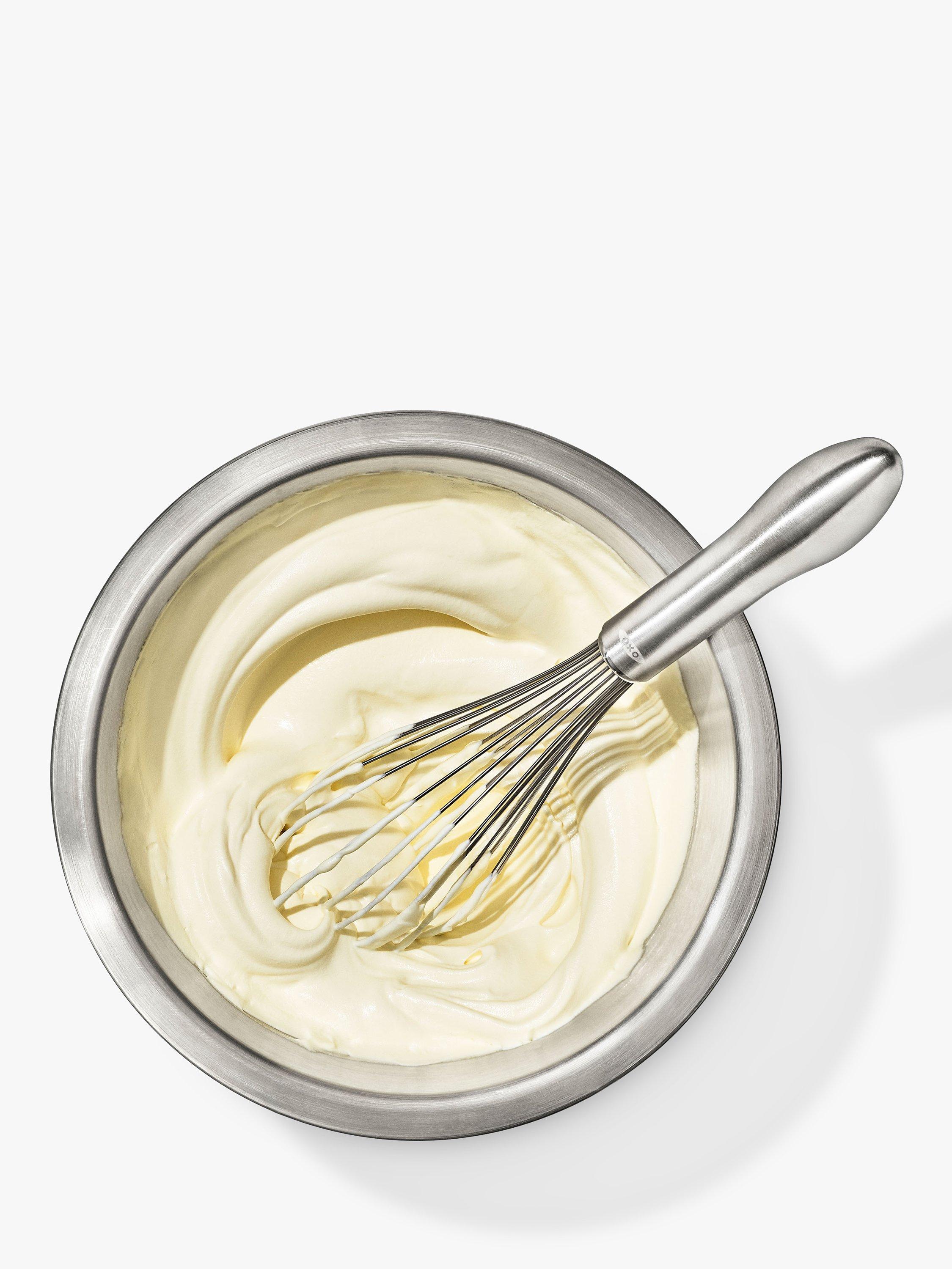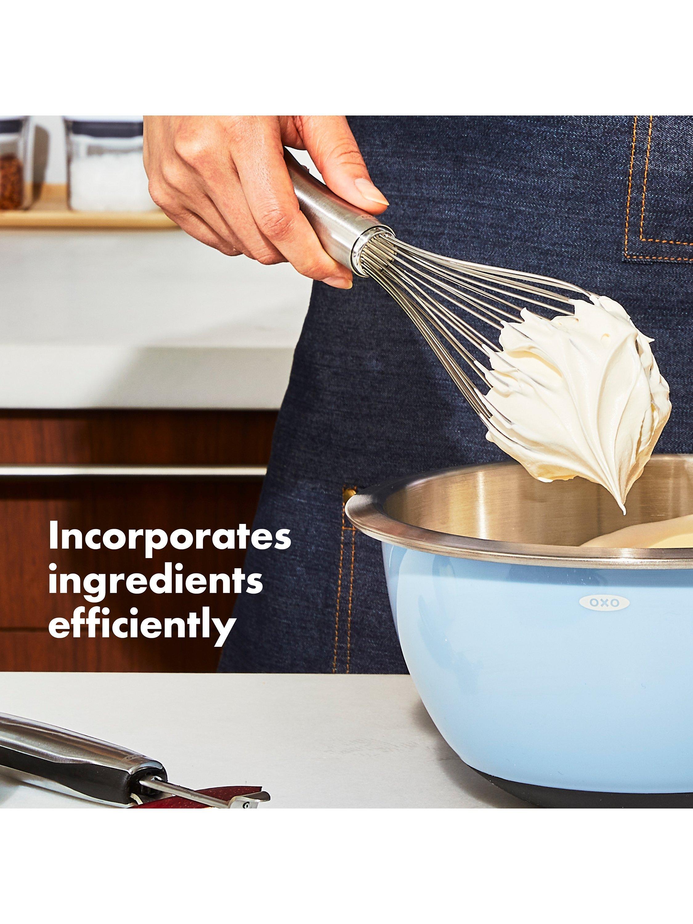 Whether you're scrambling eggs or mixing a waffle batter, with this OXO whisk you'll whip with less fatigue. The elegant brushed stainless steel handle has an innovative design that fits in the palm of your hand for comfort during repetitive motion. The wires are engineered to blend ingredients efficiently. The narrow shape is ideal for whisking and blending.