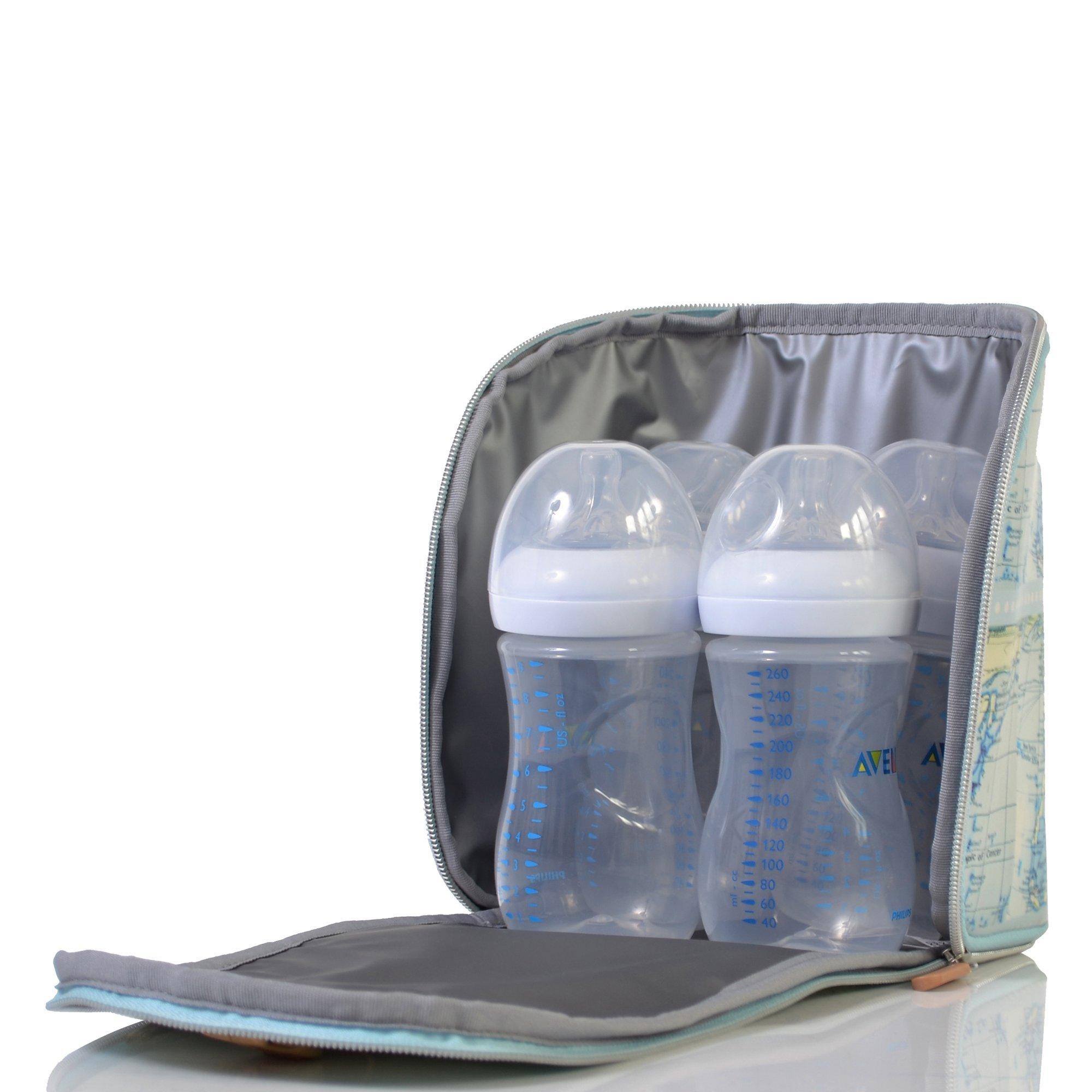 - The map-printed feeder pod, which is fully insulated, tucks neatly beside the ever necessary changing pod, which contains labelled pockets to assist with packing for the day ahead