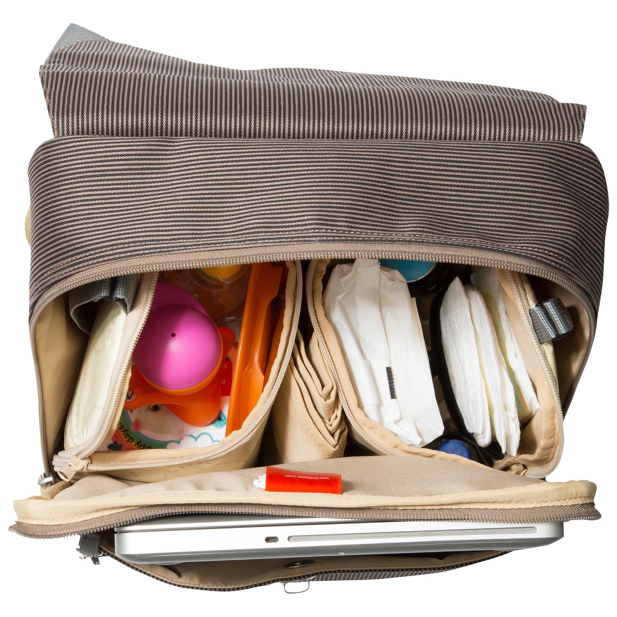 Remove the internal pods and this bag can be used on it’s own. Most laptops fit inside the top section and there are divider sections in the front to easily reach parent items on the move. This bag also comes with a padded changing mat and pram clips.
