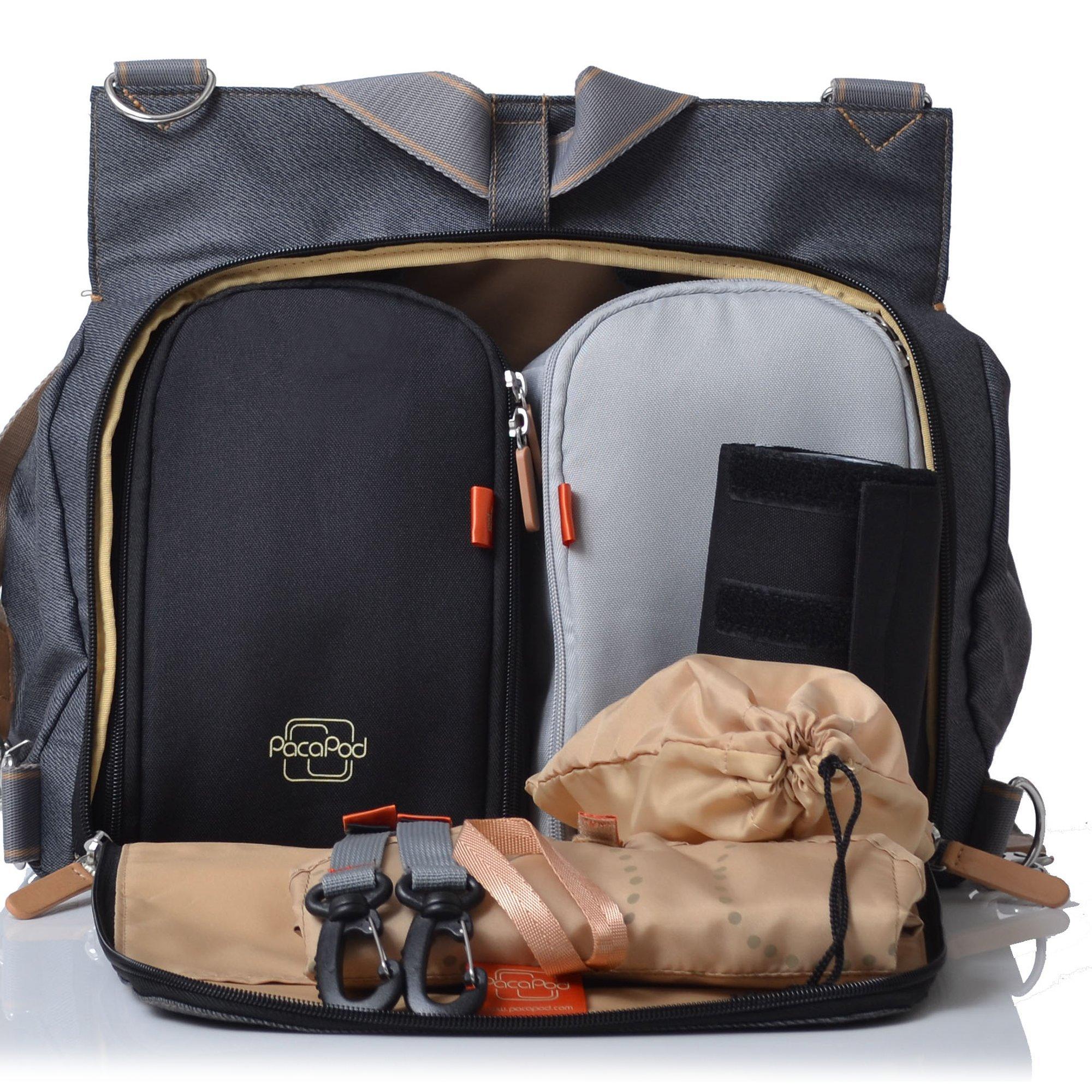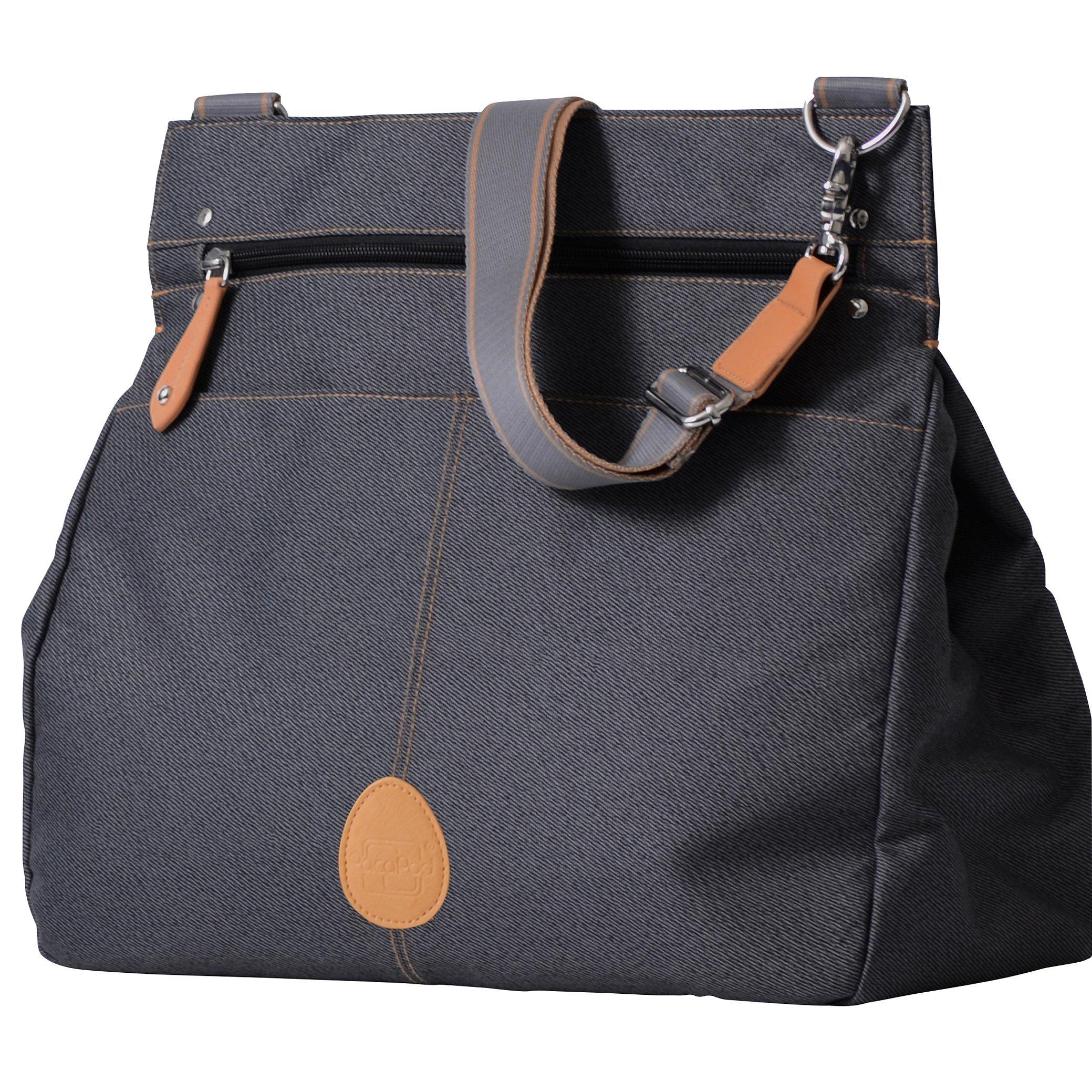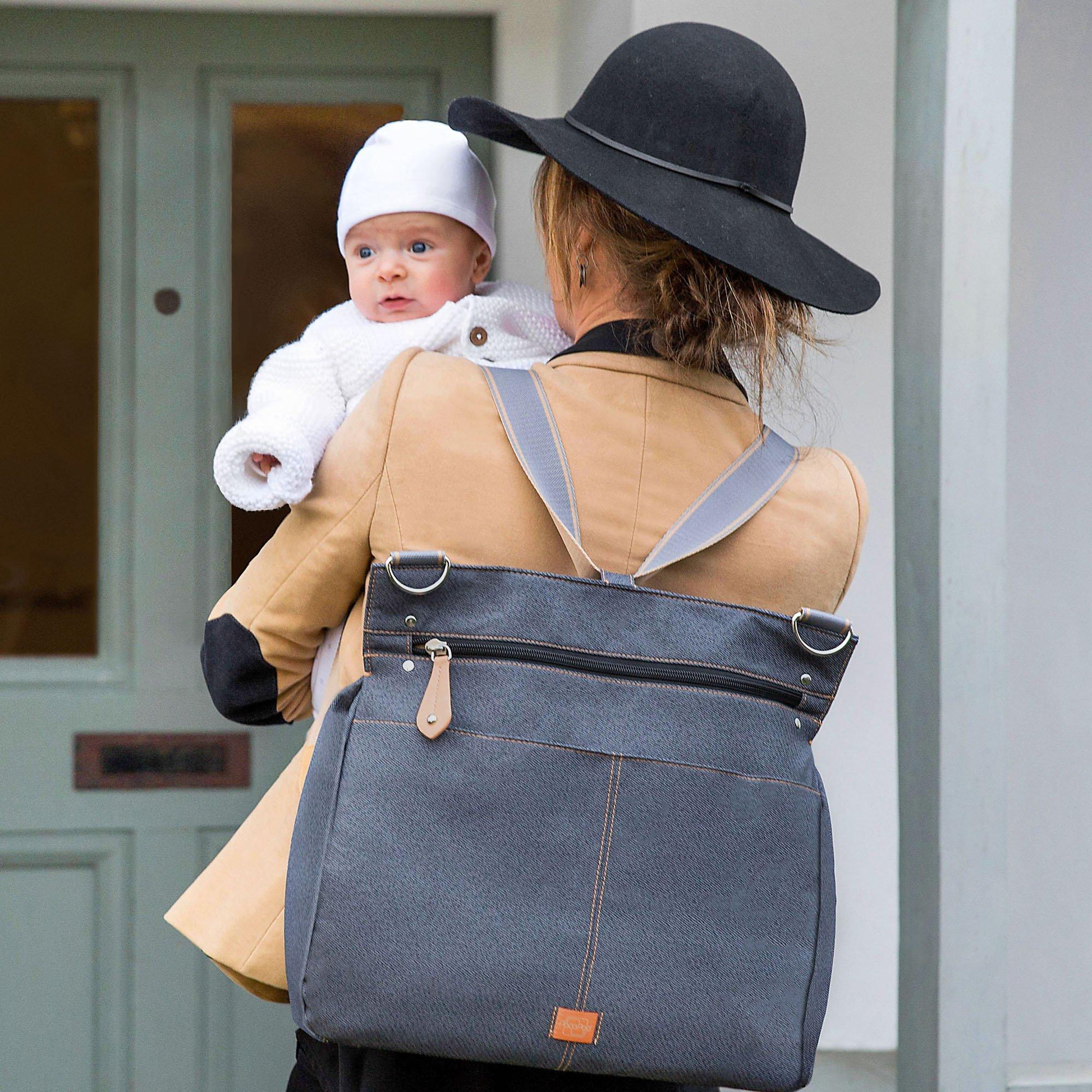 The pods can be removed from the main bag, attached to any buggy, leaving plenty of space for a laptop, shopping or gym gear. It is crafted from a durable polyester style fabric with demin style detail with pebble faux leather trims.