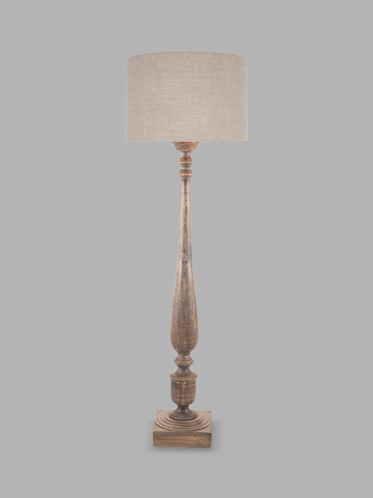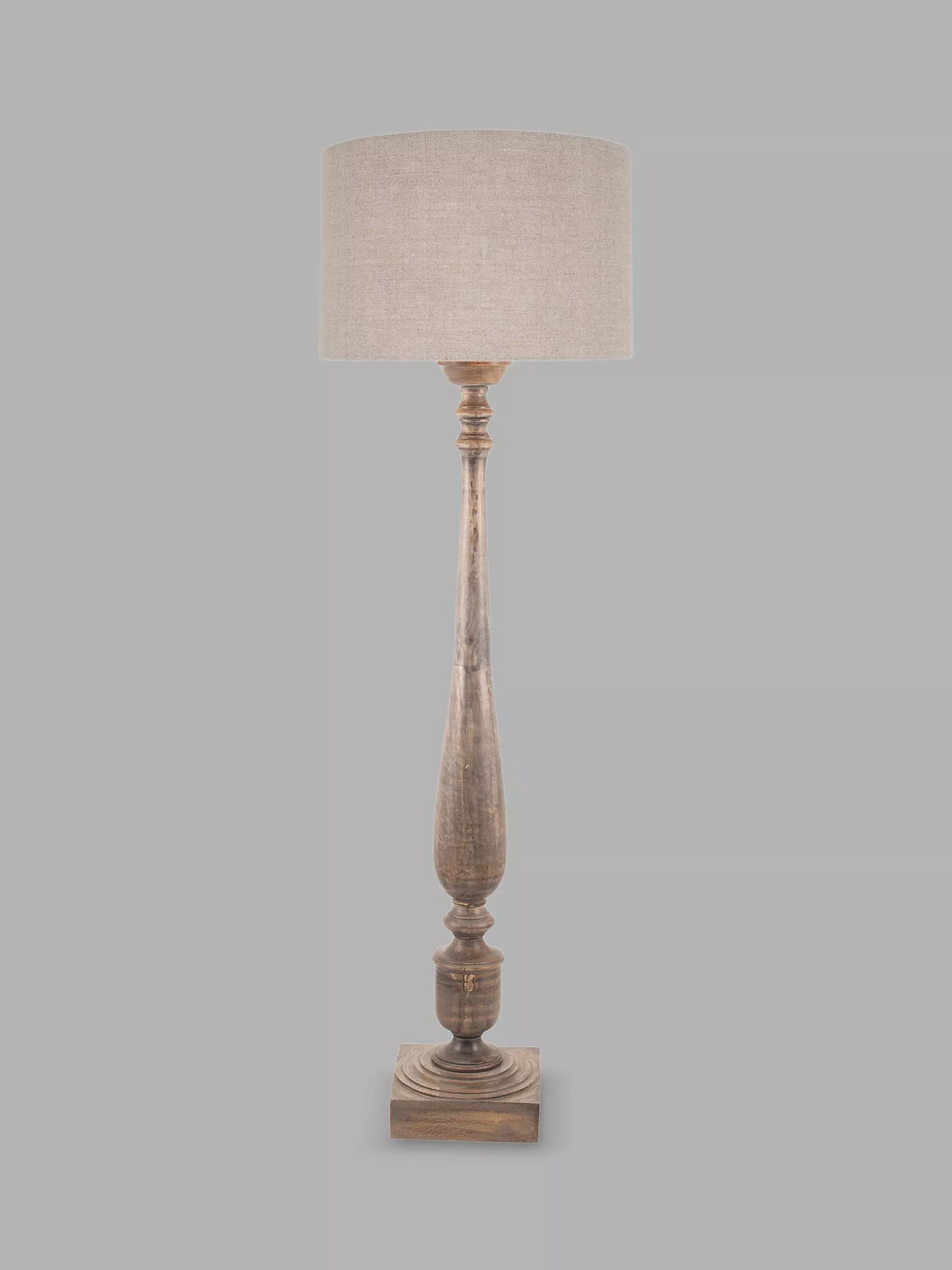 A beautiful rustic turned wood floor lamp base, handcrafted in India and finished in grey wash wood. This is an elegant lighting solution with natural charm in abundance. Paired with a 40cm natural woven linen cylinder lampshade.