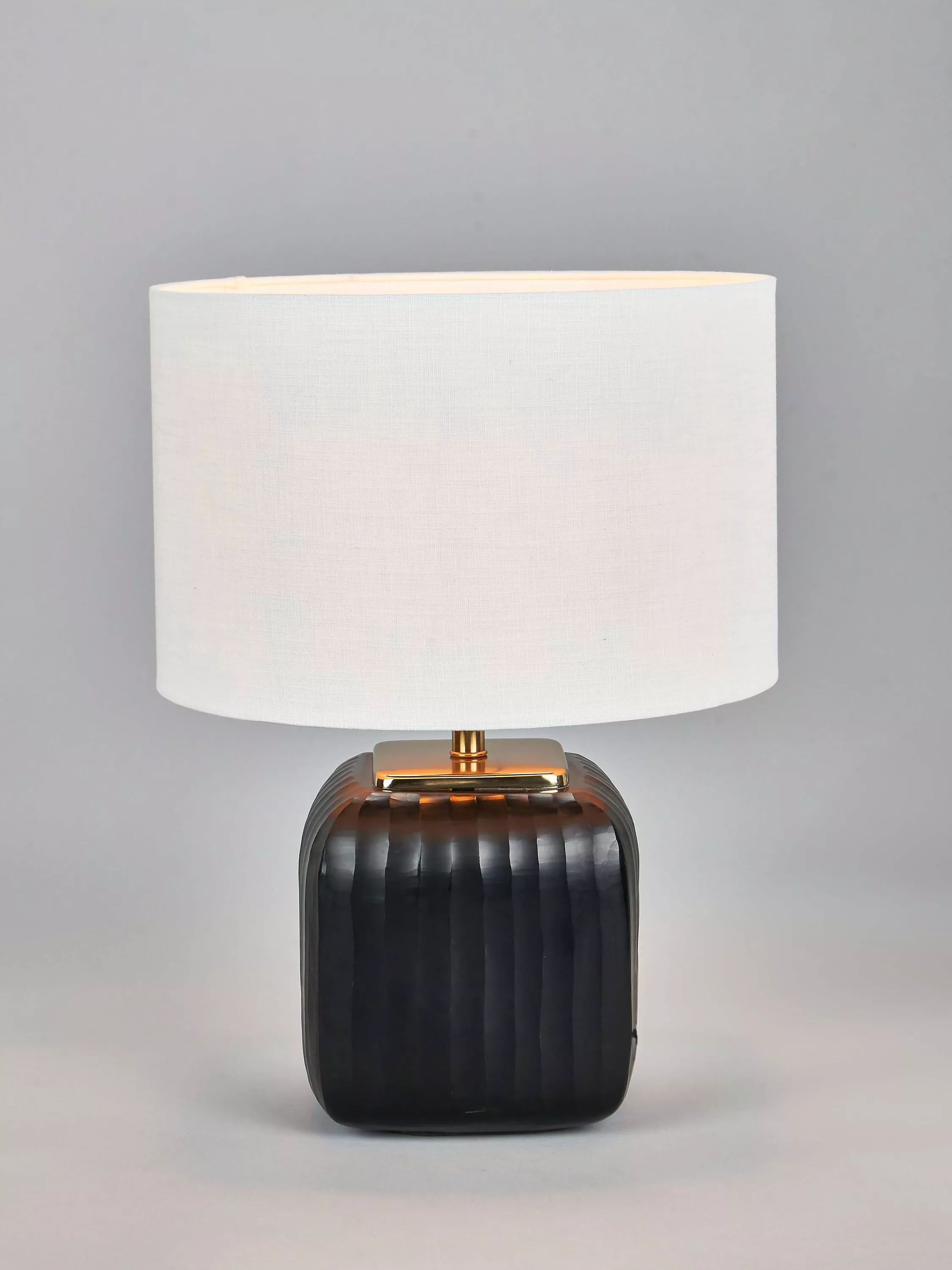 The Anais glass table lamp is a rounded cuboid in shape, hand-crafted in India from heavy-weight, cold-cut glass. This striking lamp is perfectly placed to create drama in your living space, topped with a lined, linen lampshade.