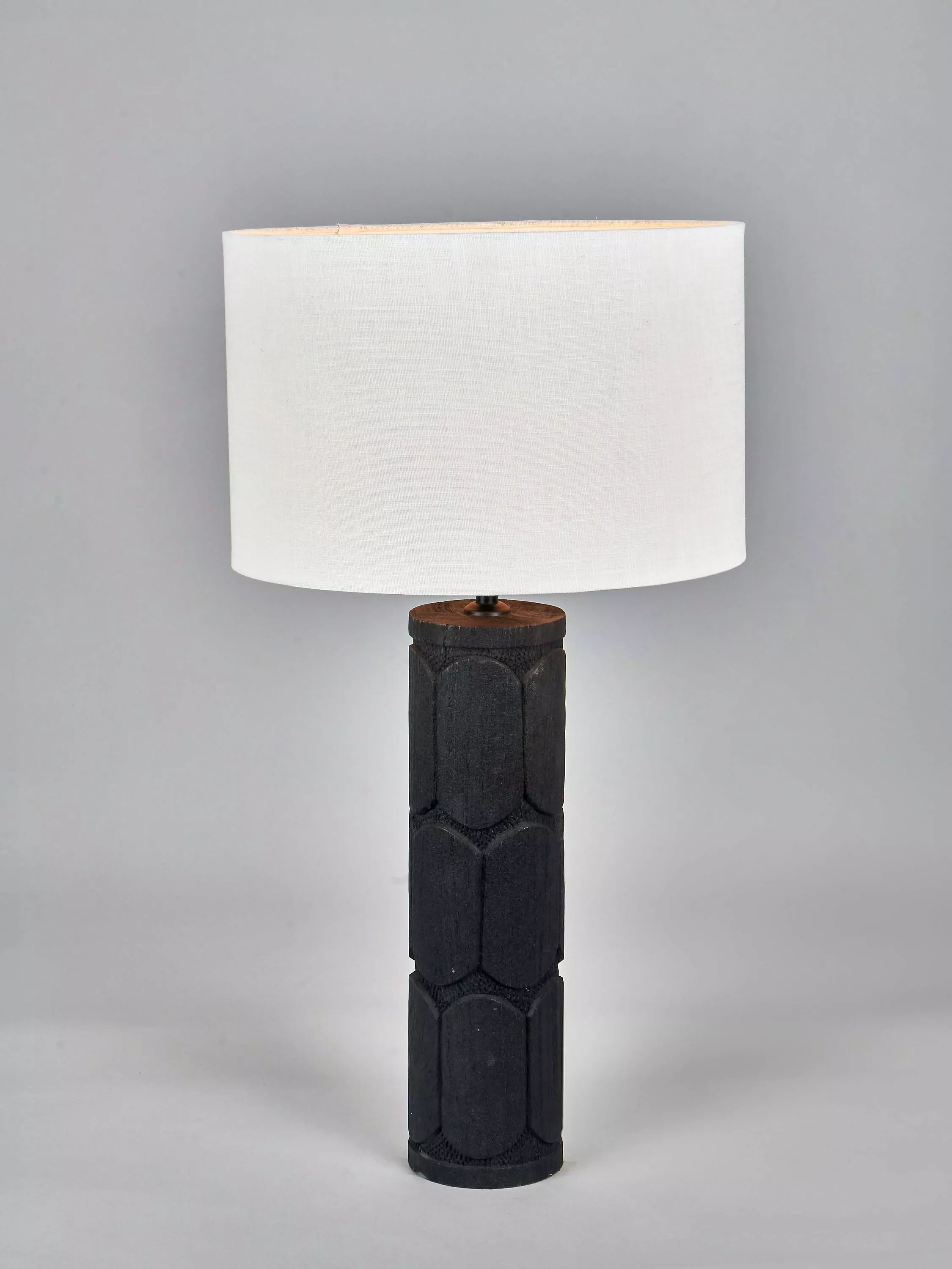 This elegant wooden table lamp is a beautiful and natural addition to any home. It has a decorative embossed design that adds a unique touch to its simple yet sophisticated style. Topped with a lined, open weave lampshade that allows light to filter through.