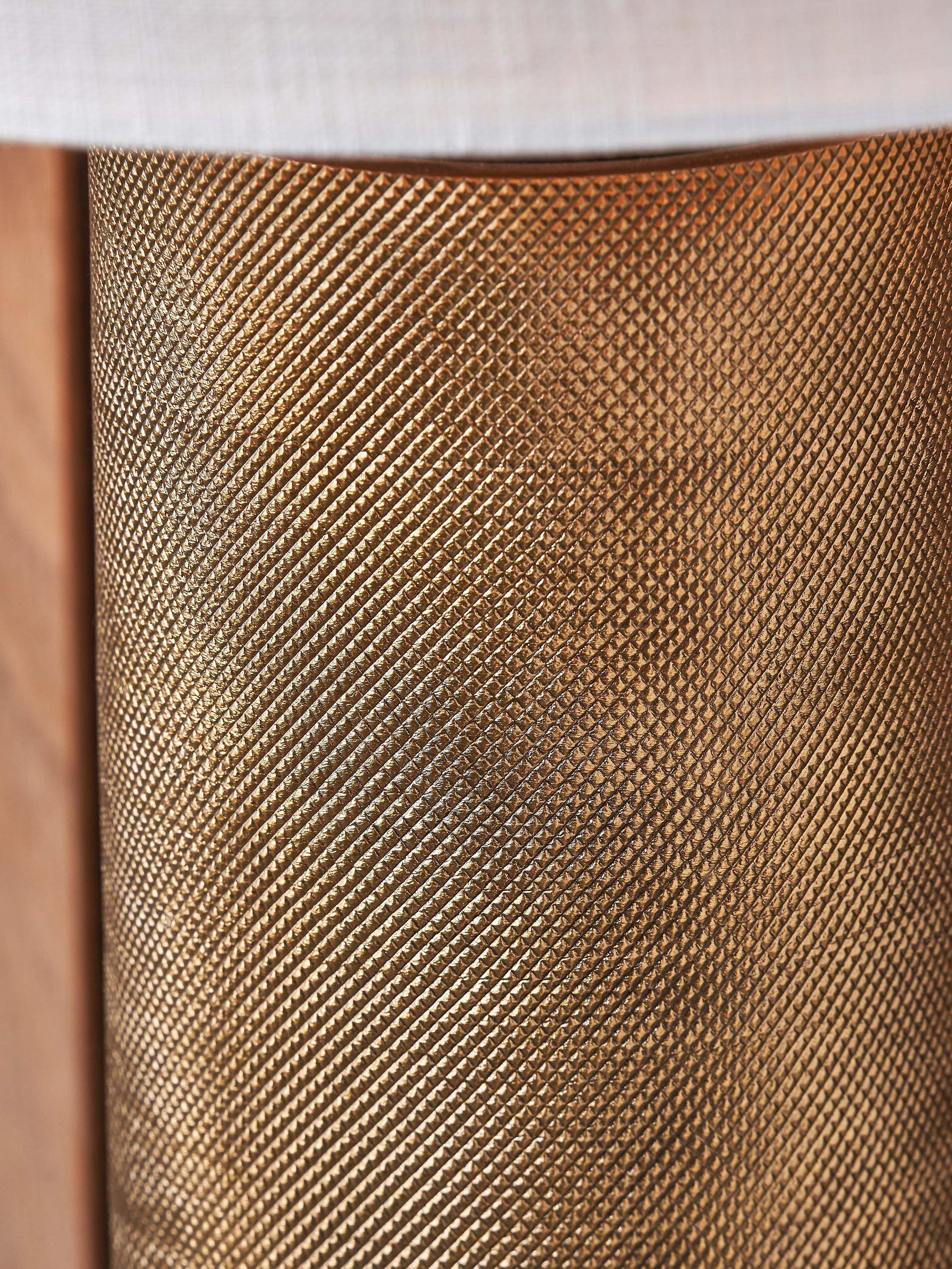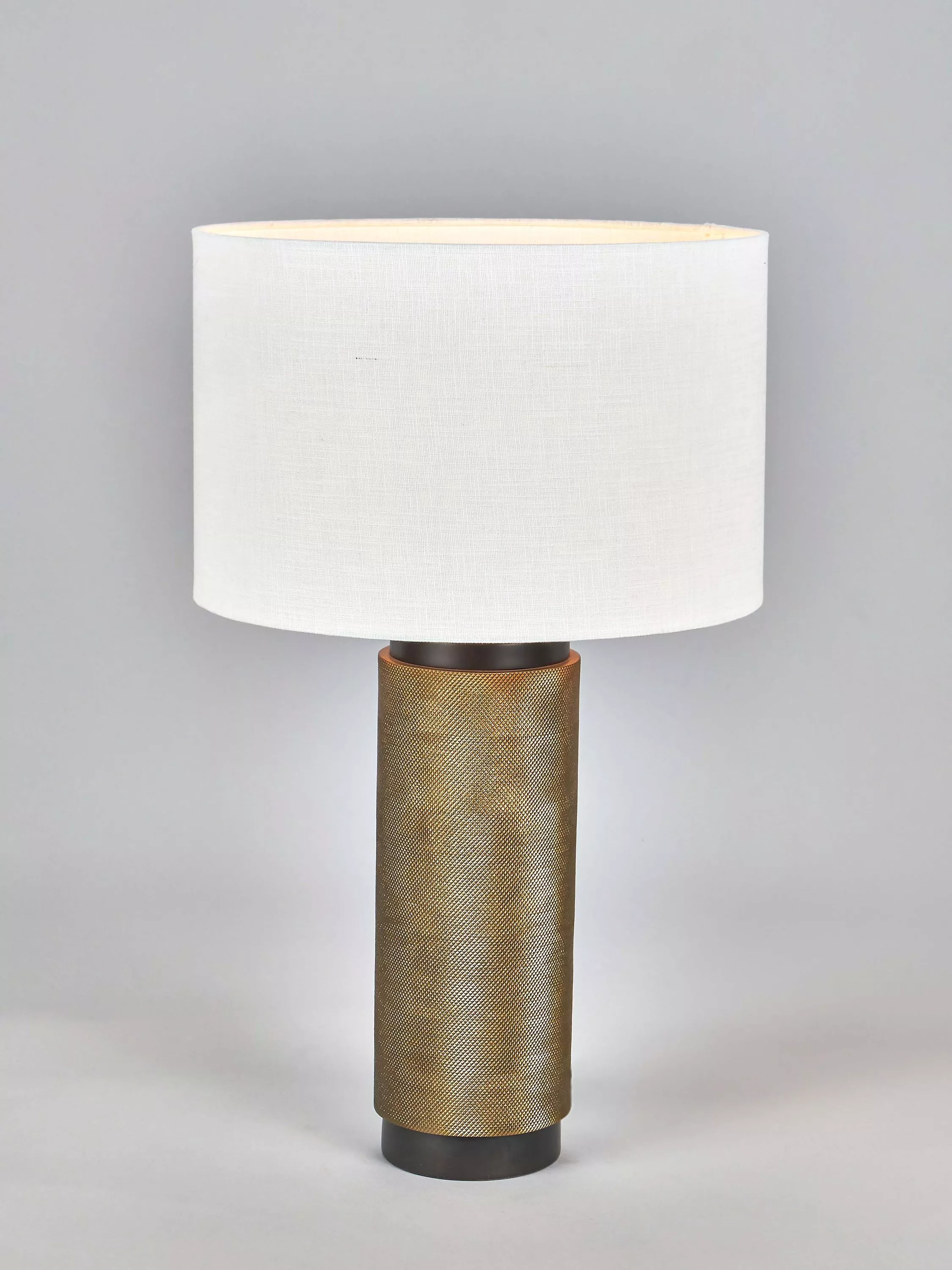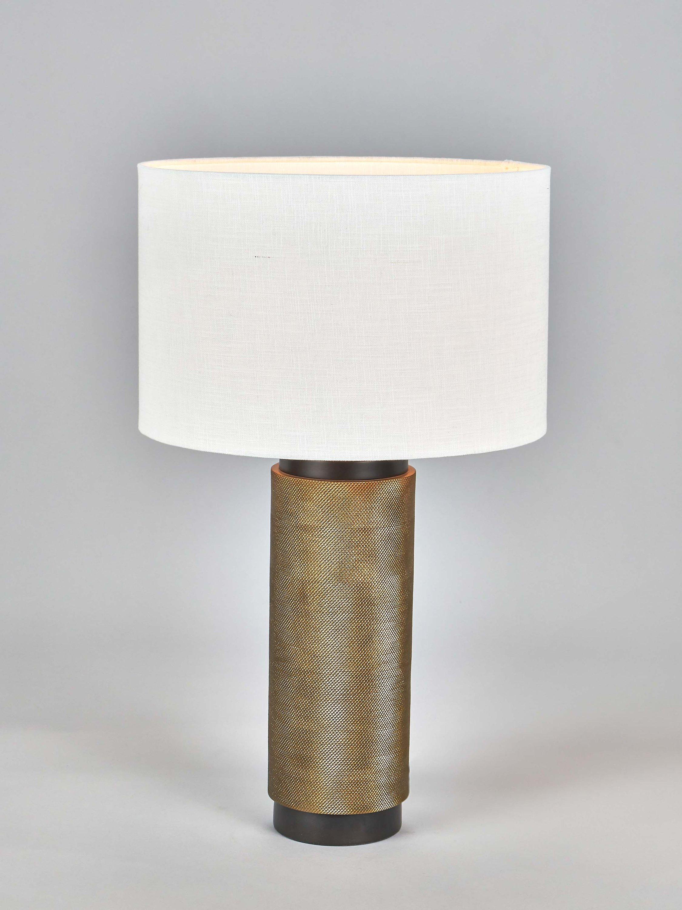 The Aurelio metal table lamp is crafted in India, with a textured pressed mesh metal effect that enhances its tactility and drama, making this table lamp the focal point of your room. Topped with a lined, open weave lampshade that allows light to filter through.