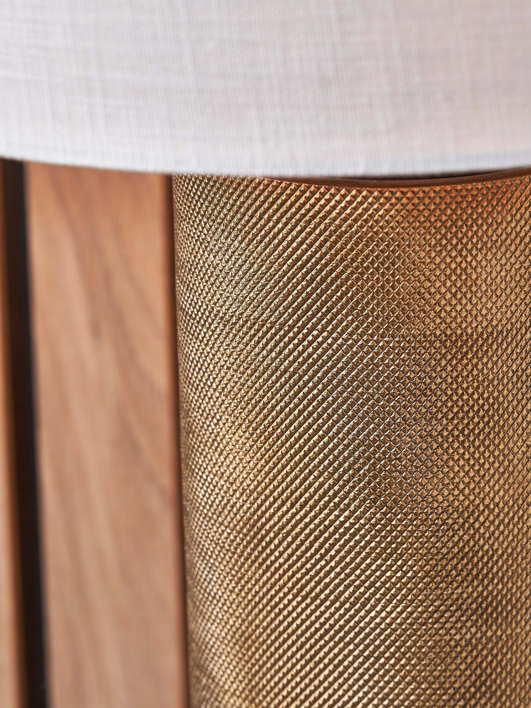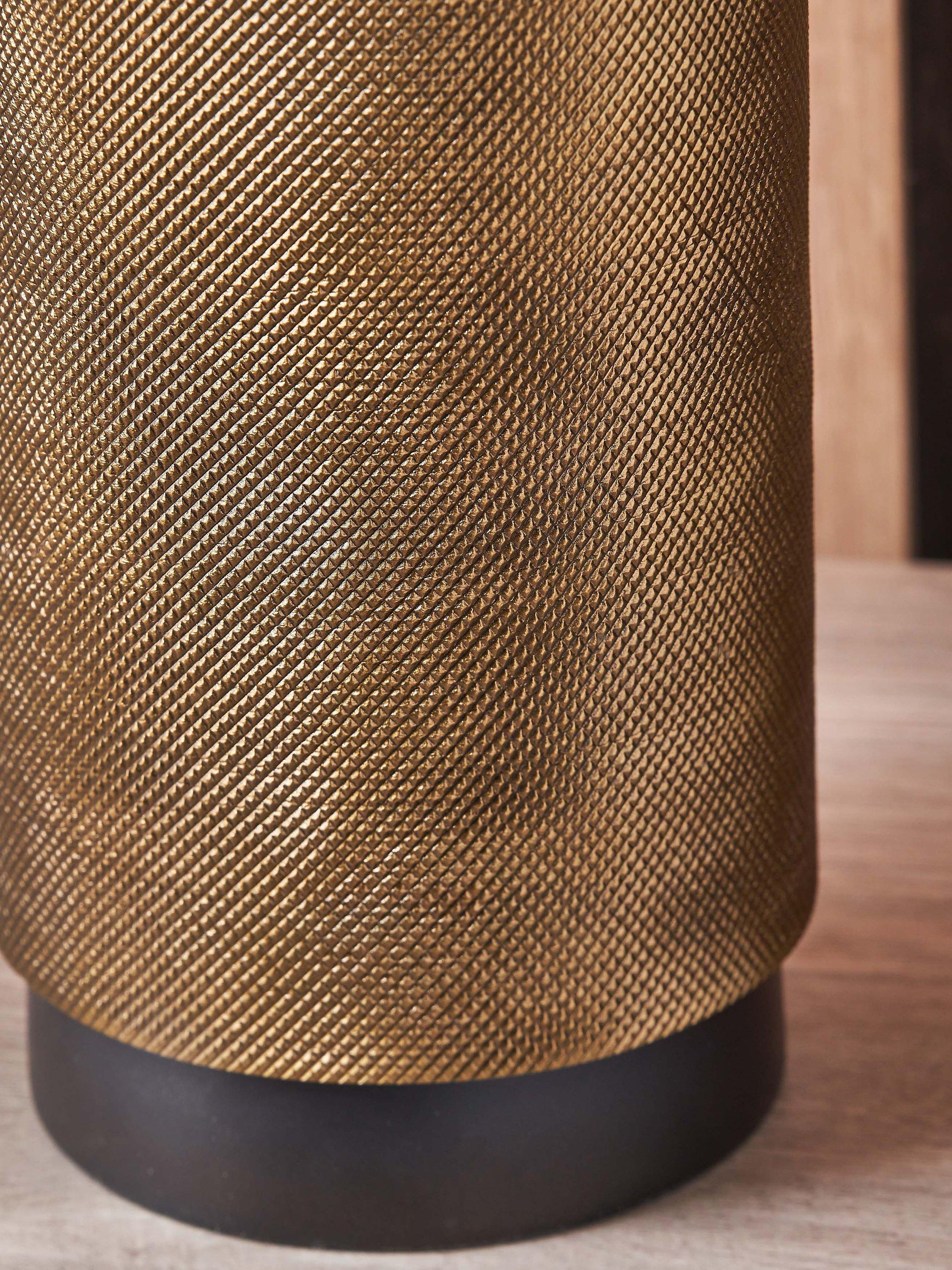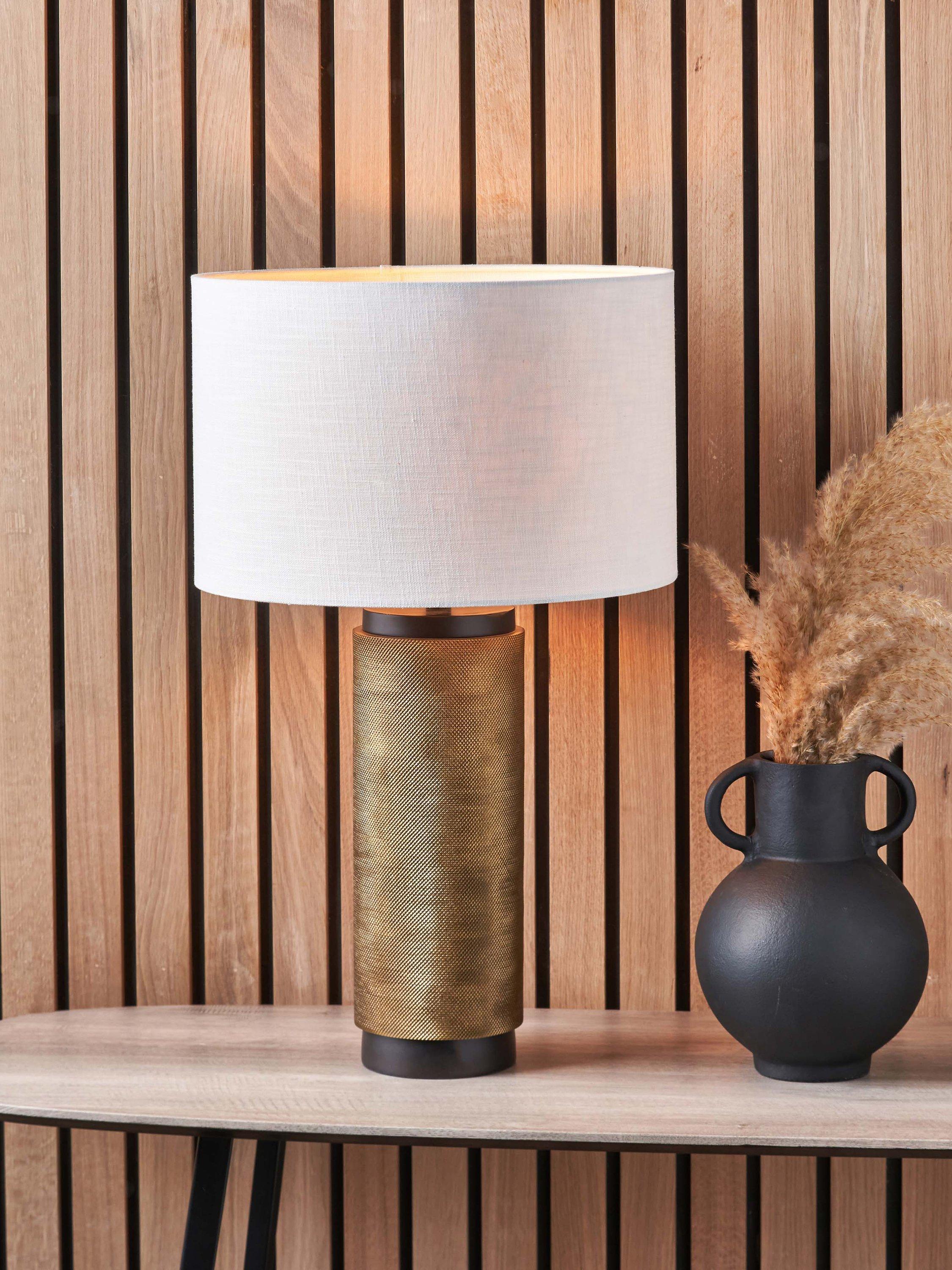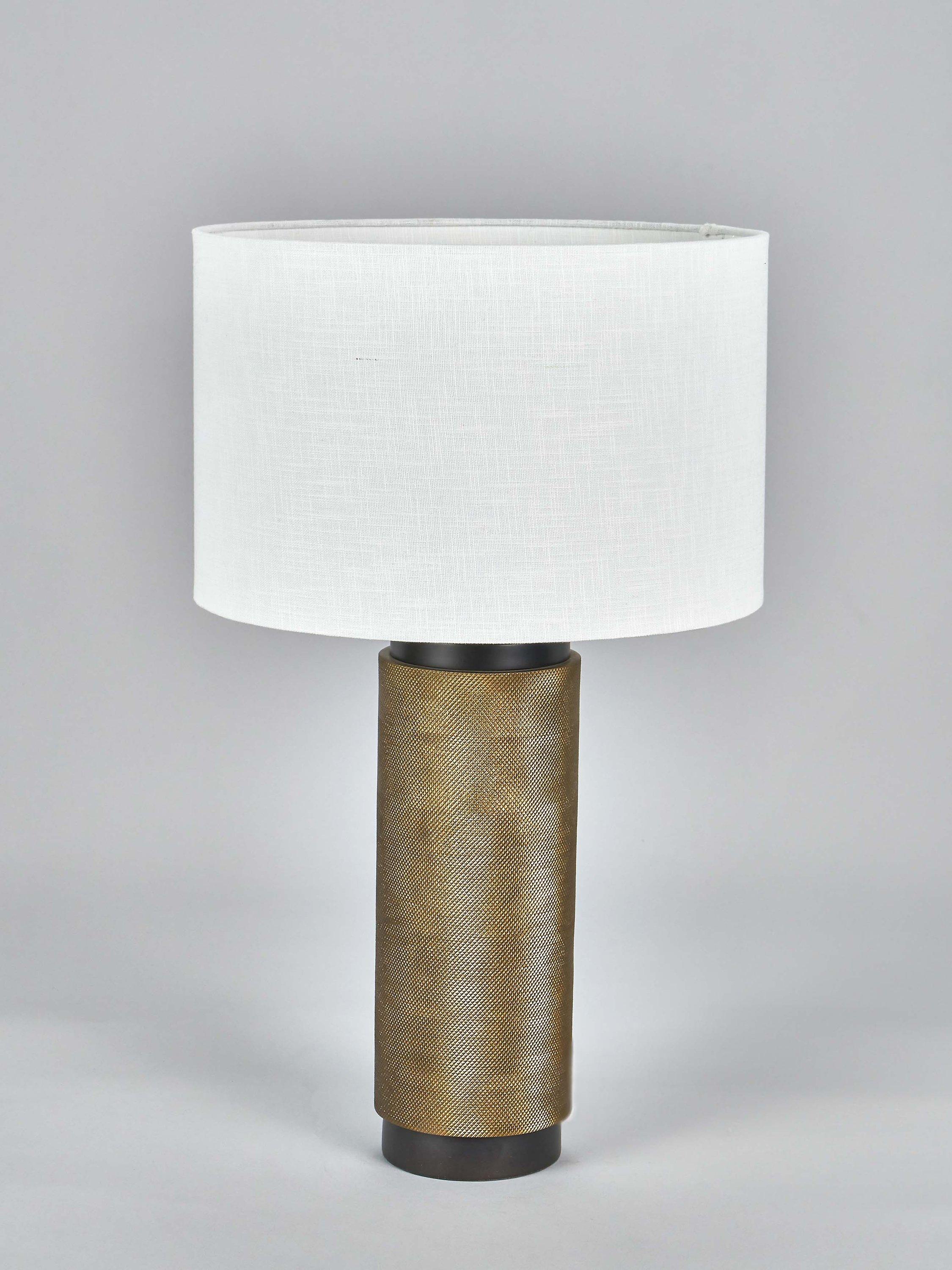 The Aurelio metal table lamp is crafted in India, with a textured pressed mesh metal effect that enhances its tactility and drama, making this table lamp the focal point of your room. Topped with a lined, open weave lampshade that allows light to filter through.