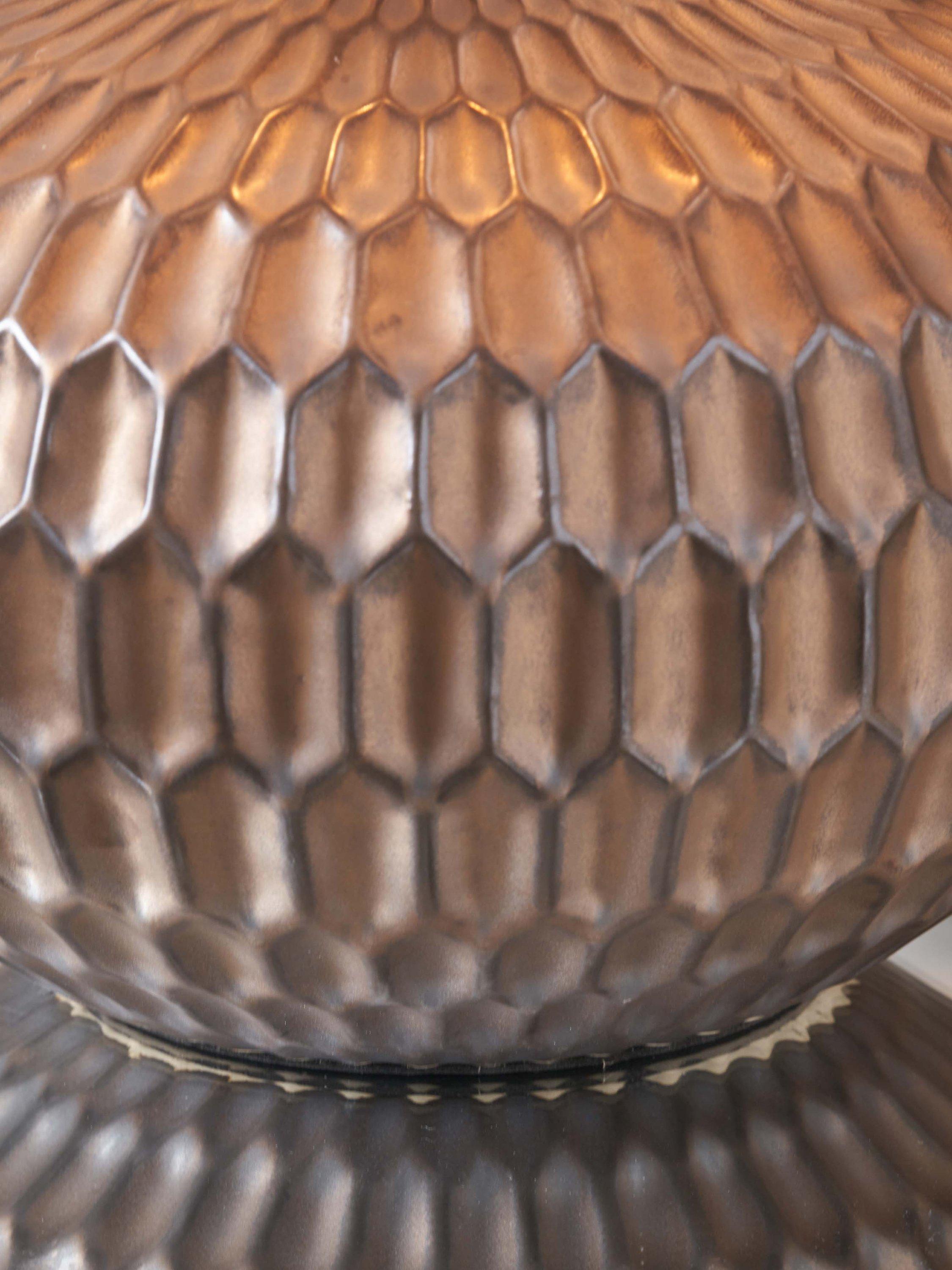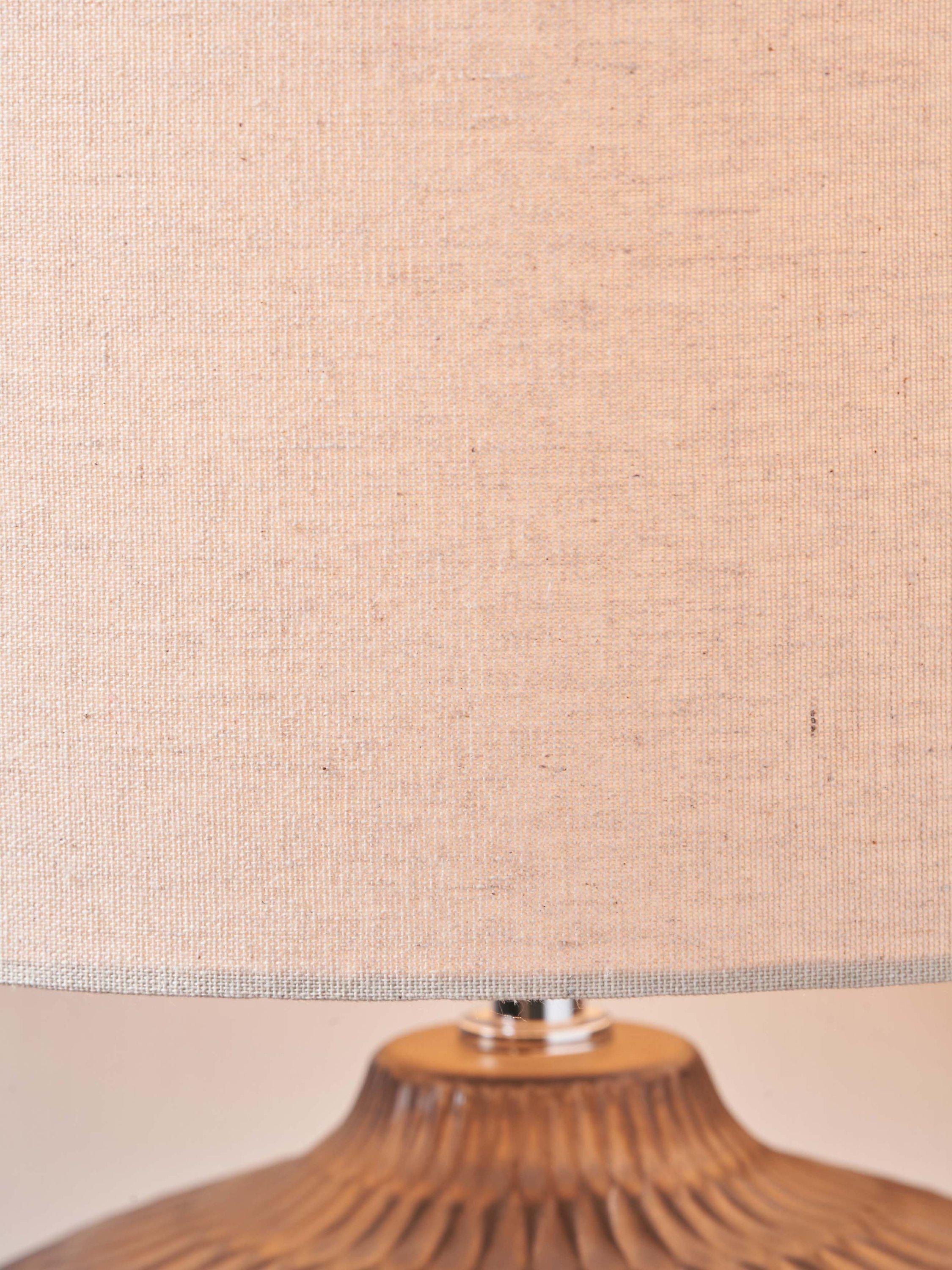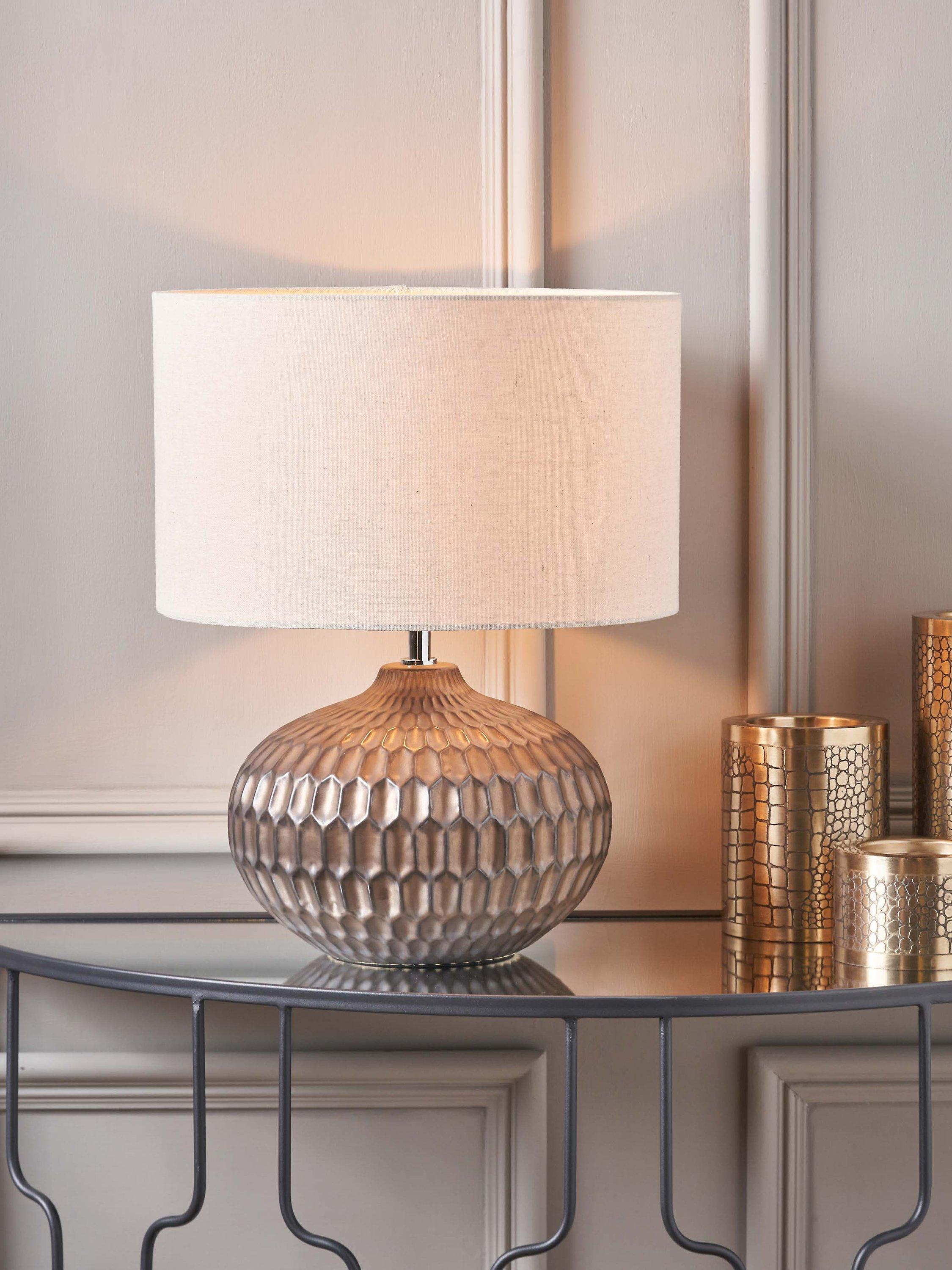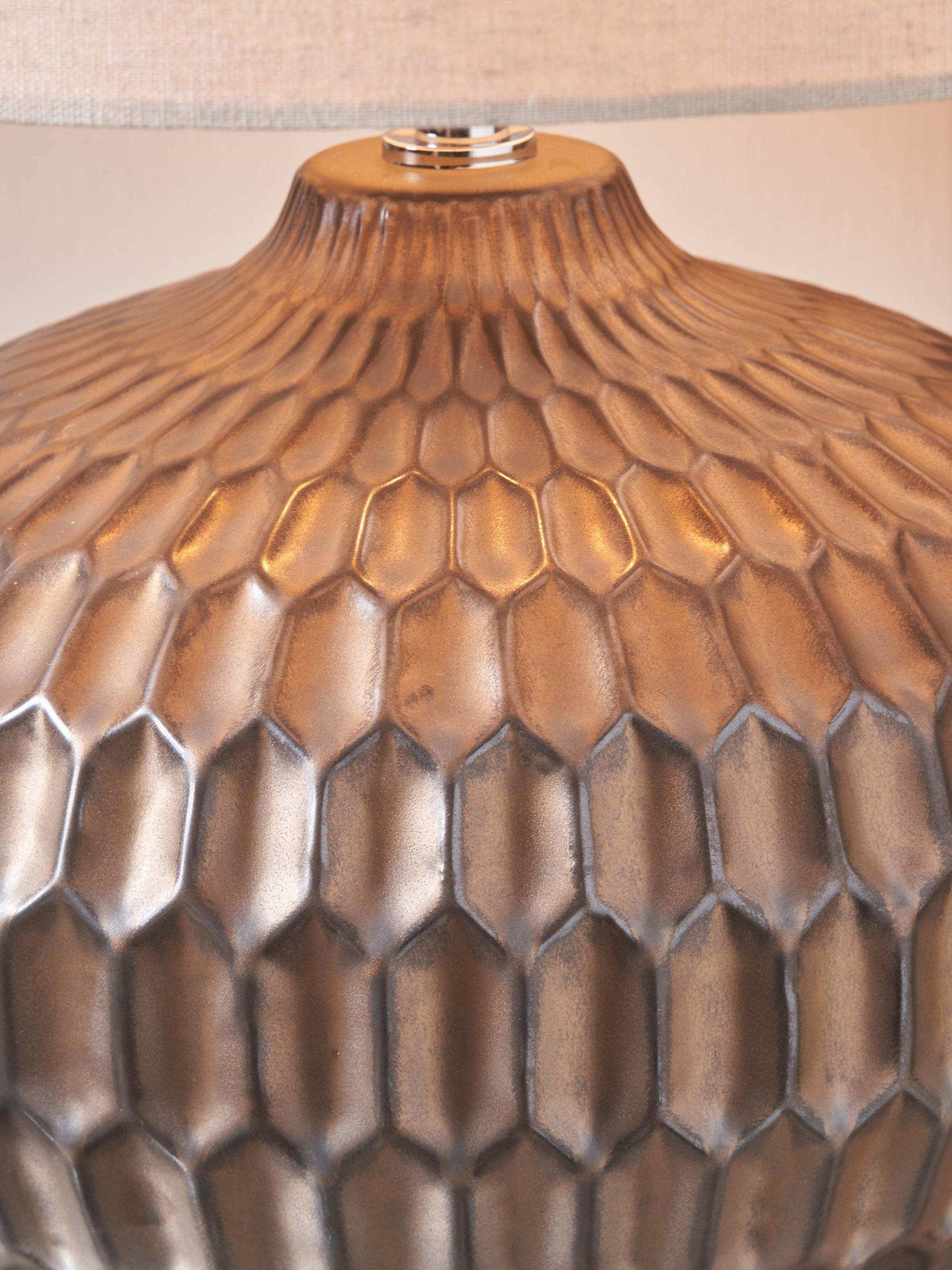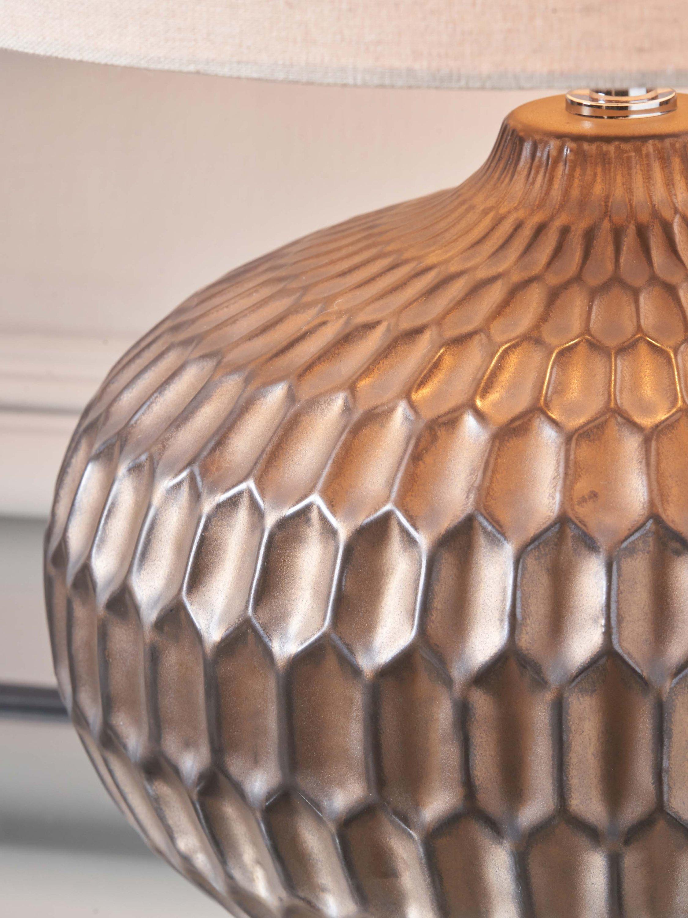 Layered bronze in colour, the stylish Cassius table lamp is actually a moulded ceramic with a clever hand-applied metallic finish. To complement the base a textured linen lampshade, with rolled edges, is included.