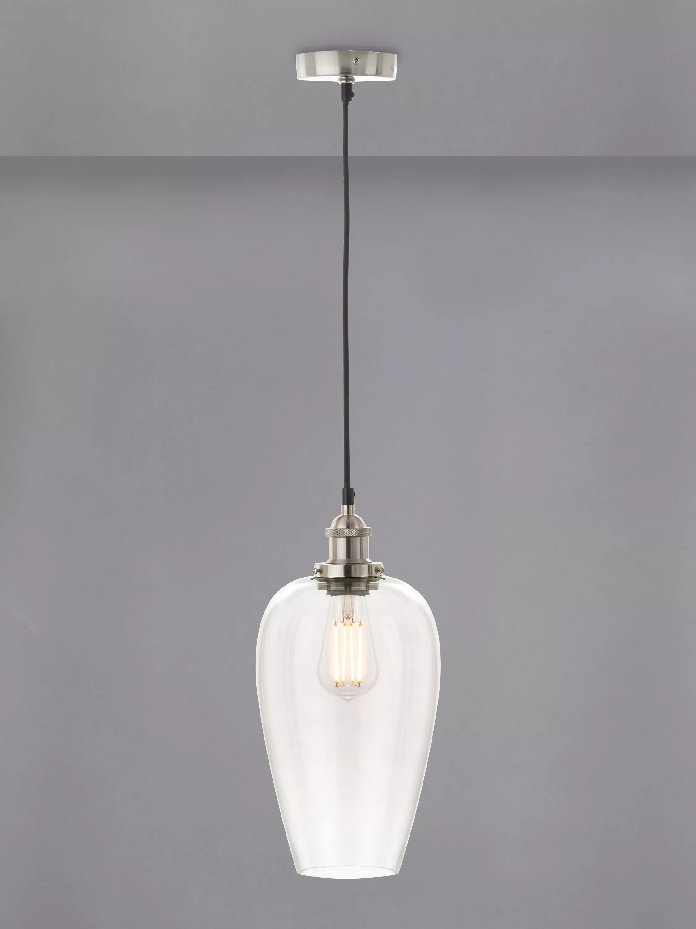 Sophisticated and elegant, the Clio pendant is crafted with a long glass shade, antiqued silver-toned metal and black fabric cable. A timeless design that exudes luxury and elevates any room.