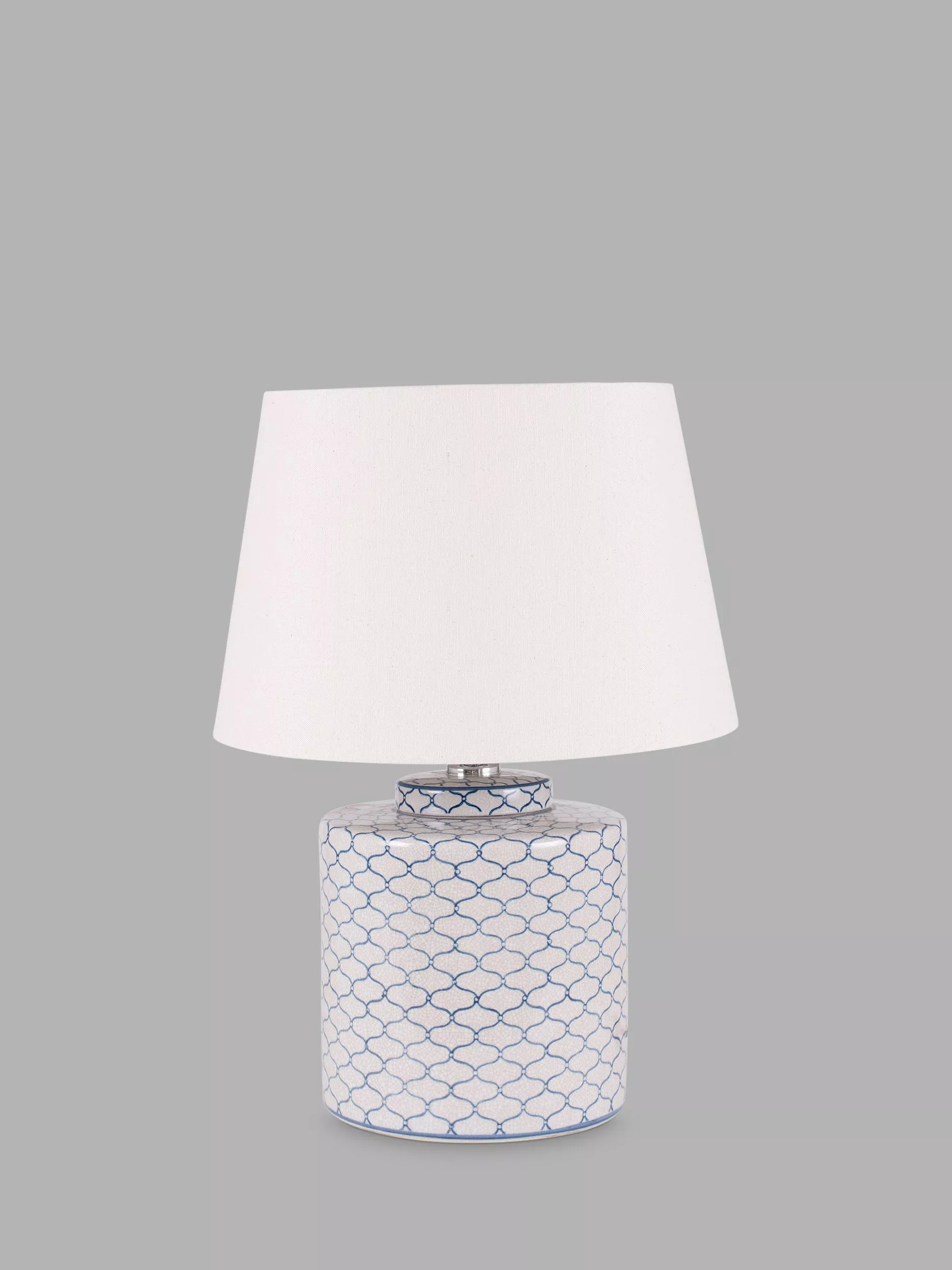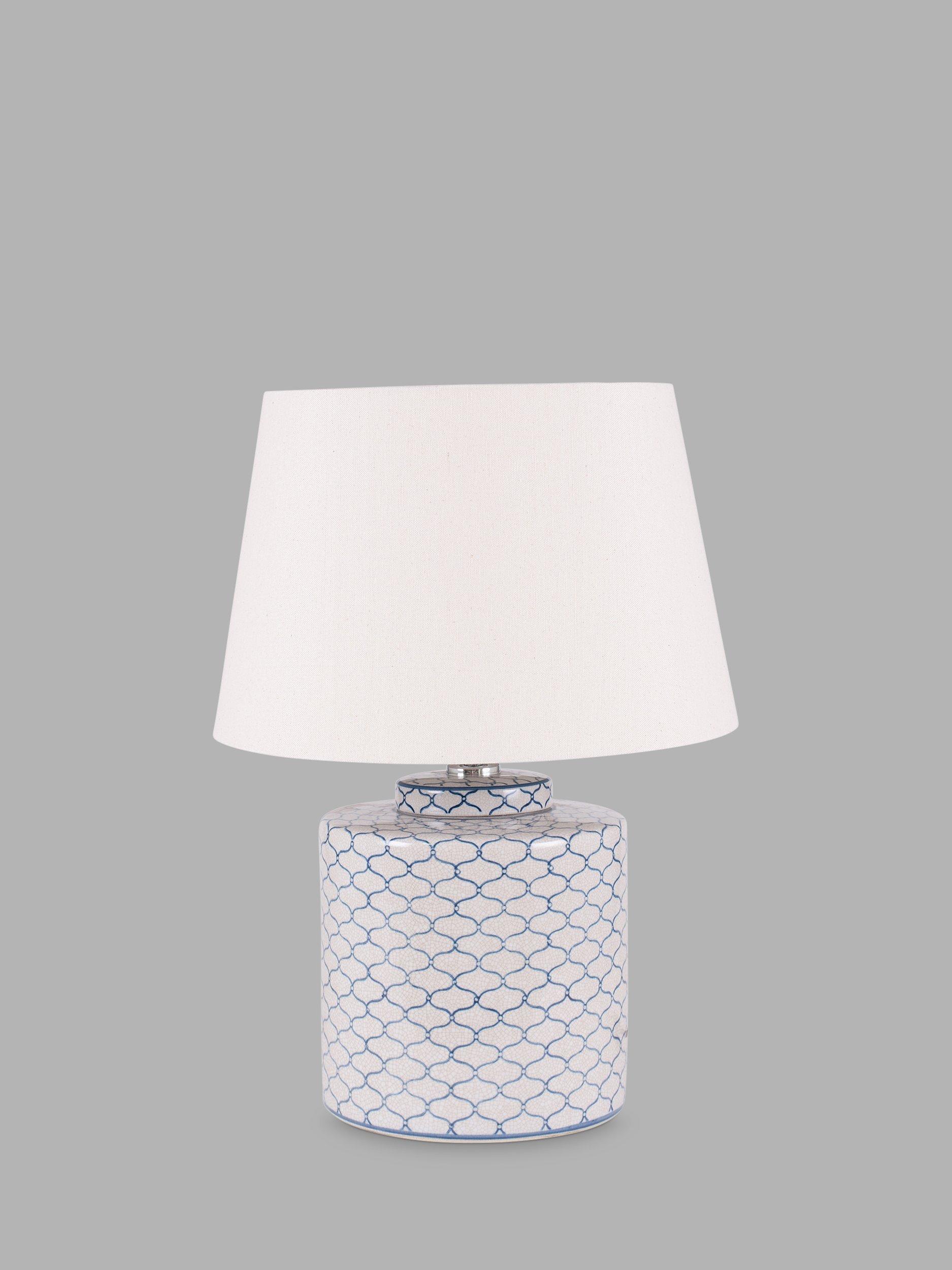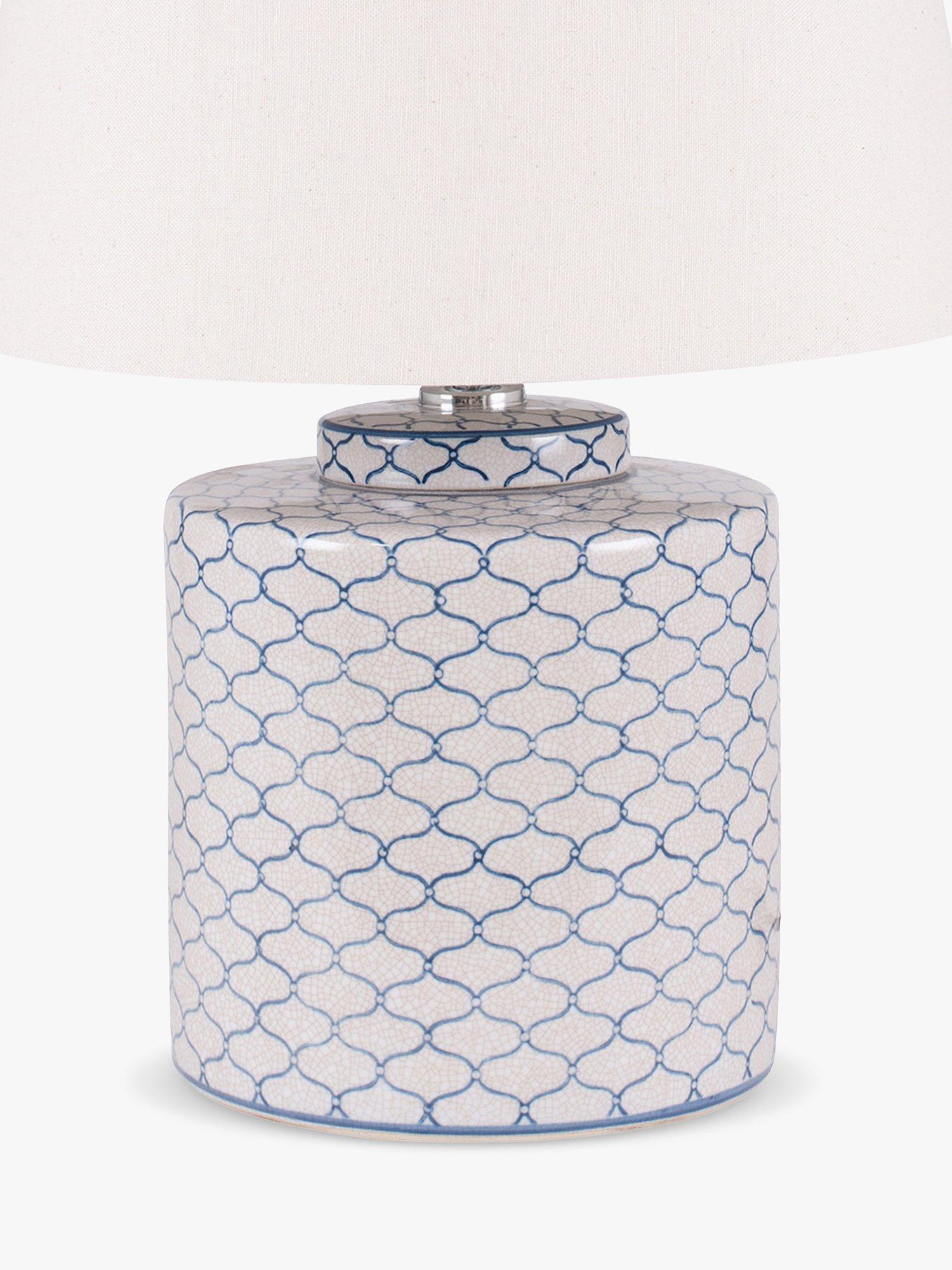 A tea caddy shaped ceramic pot with a geometric blue design, repeated against a light grey background. This lamp comes complete with a tapered cotton shade.