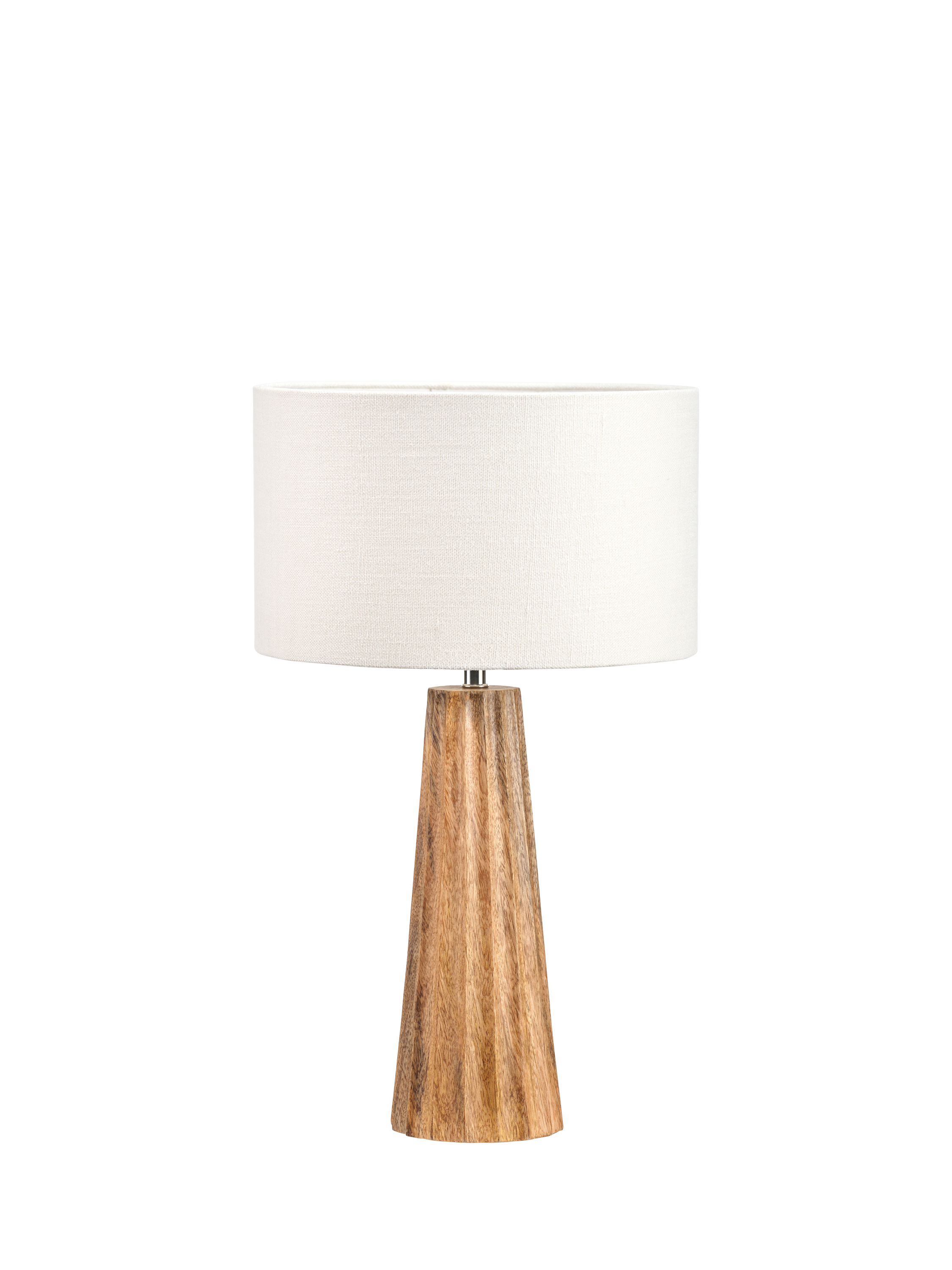 This modern mango wood table lamp features a textured conical design and is paired with a simple yet elegant linen lampshade, which creates contrast. The Draydon table lamp makes use of natural wood grain and has a ridged carving design to add texture. Made in India, this bold contemporary piece will suit a range of interior styles from Luxe Industrial to Boutique Hotel designs.
