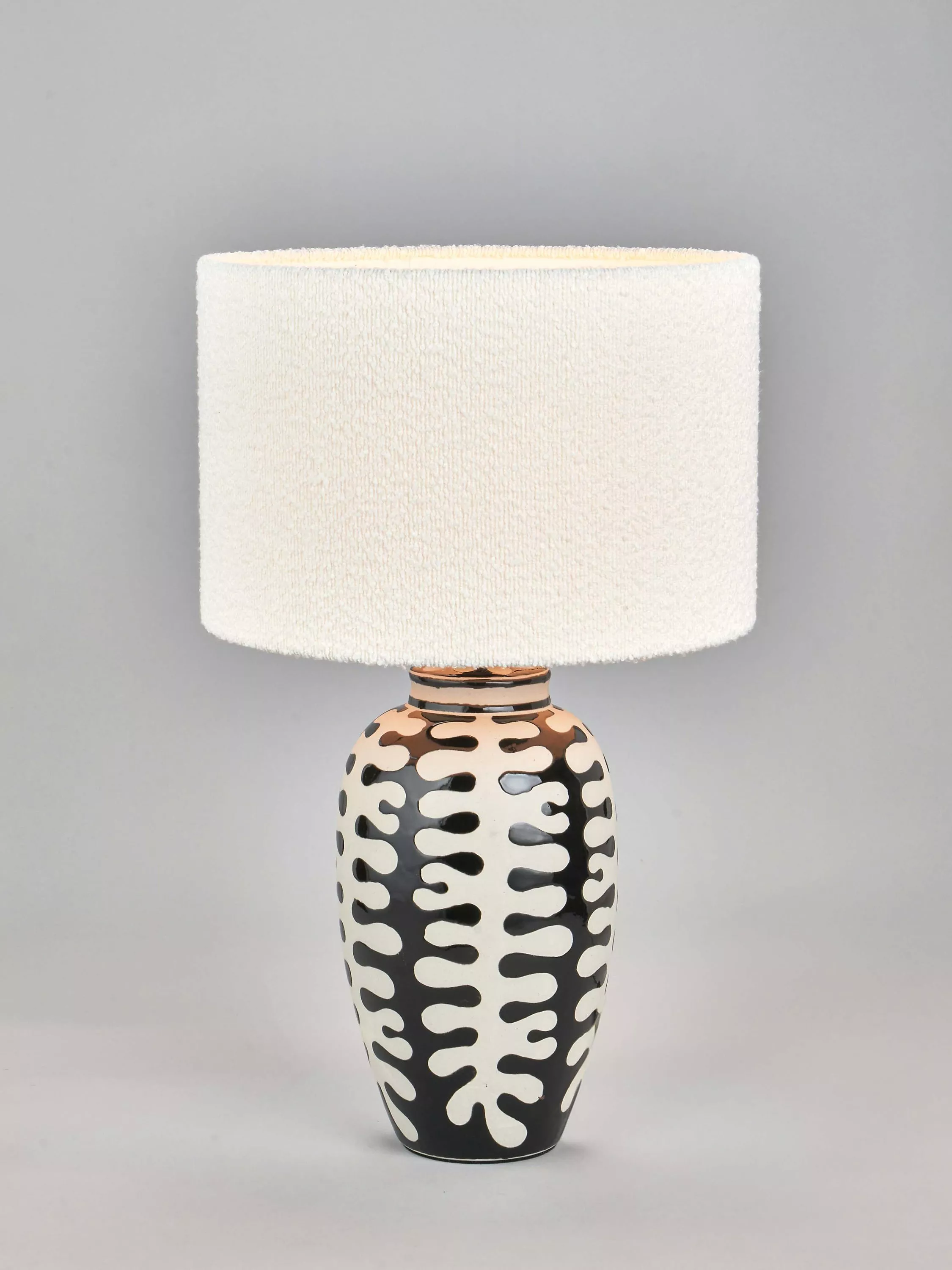 Beautiful and elegantly curved, the Elkorn table lamp has a ceramic base, lovingly hand-finished with a stylish raised coral design, in a contemporary monochrome colour palette. This stunning lamp is sure to add a focal point to your interior with its organically shaped design.