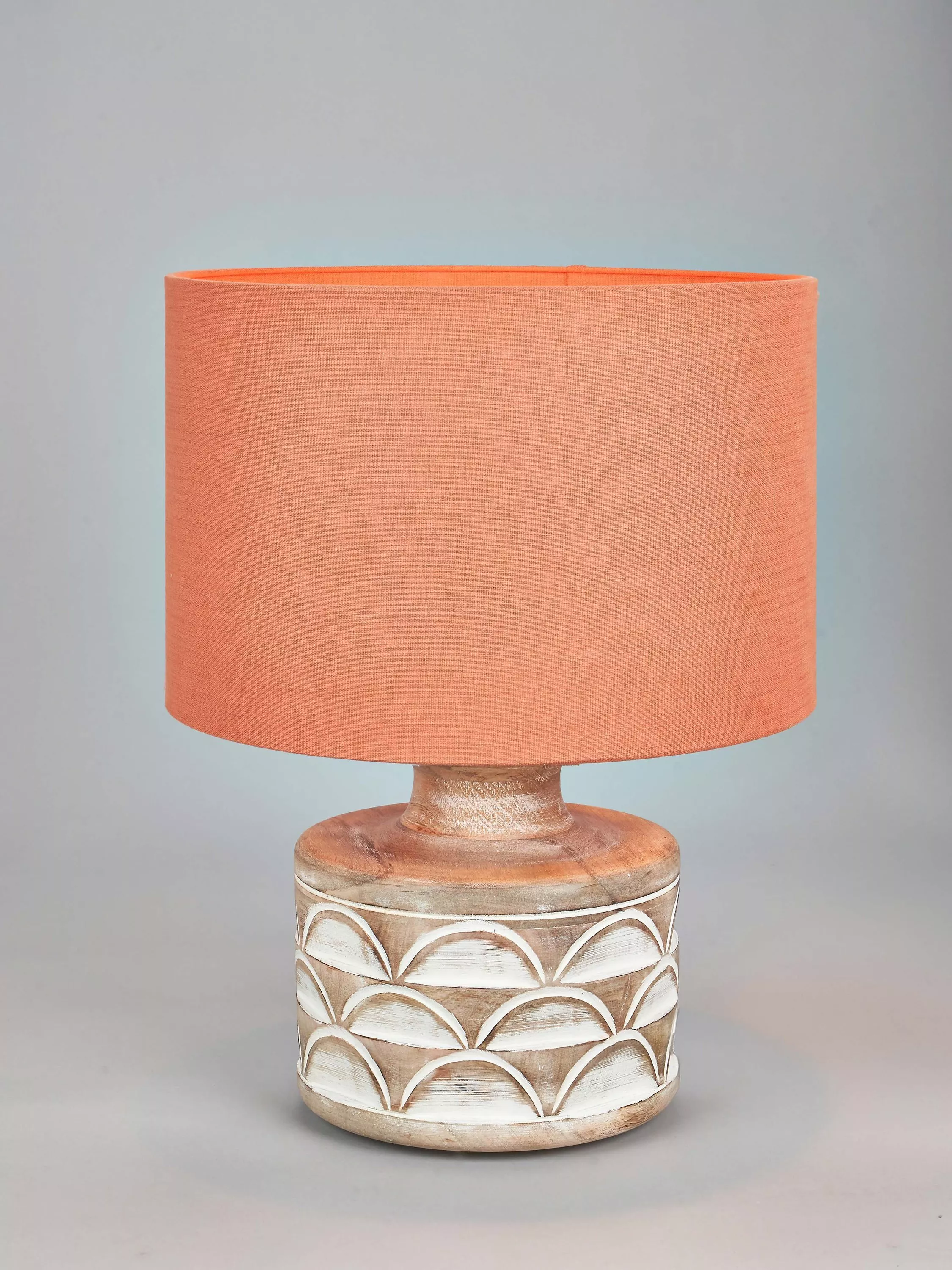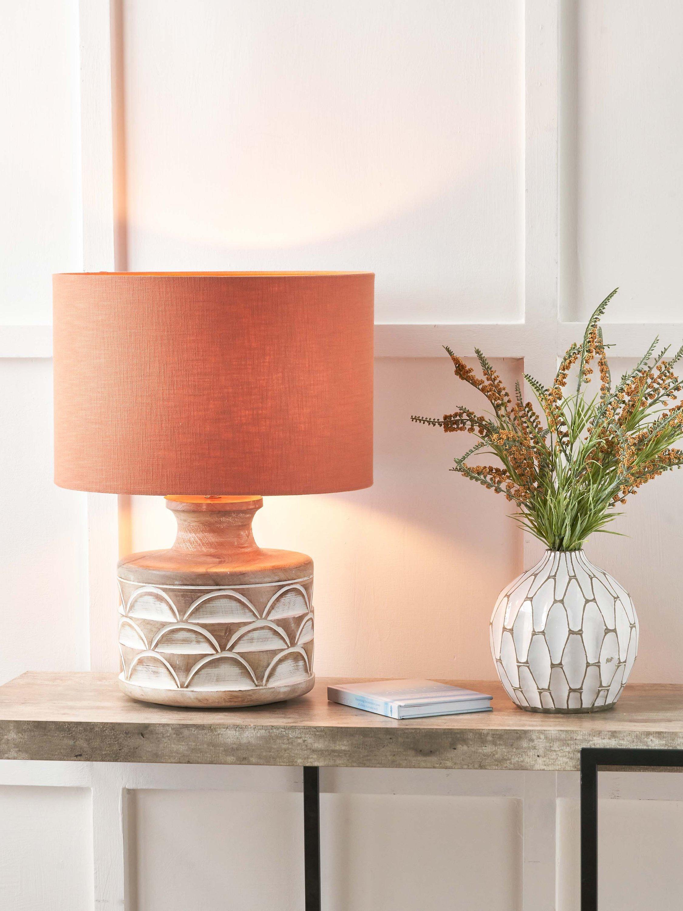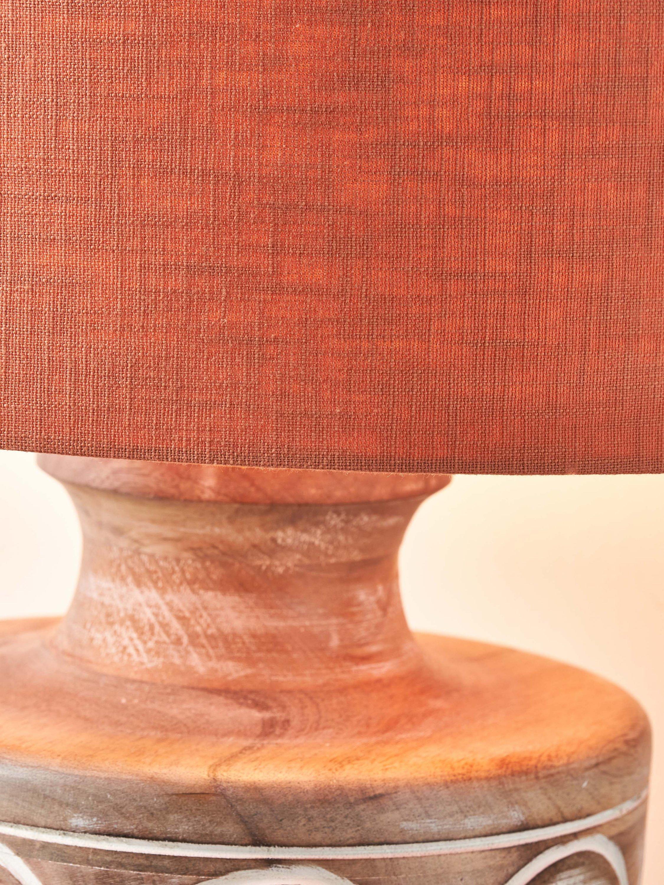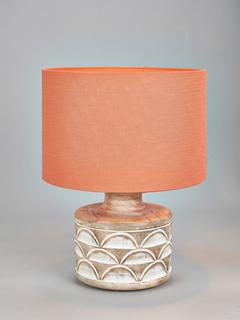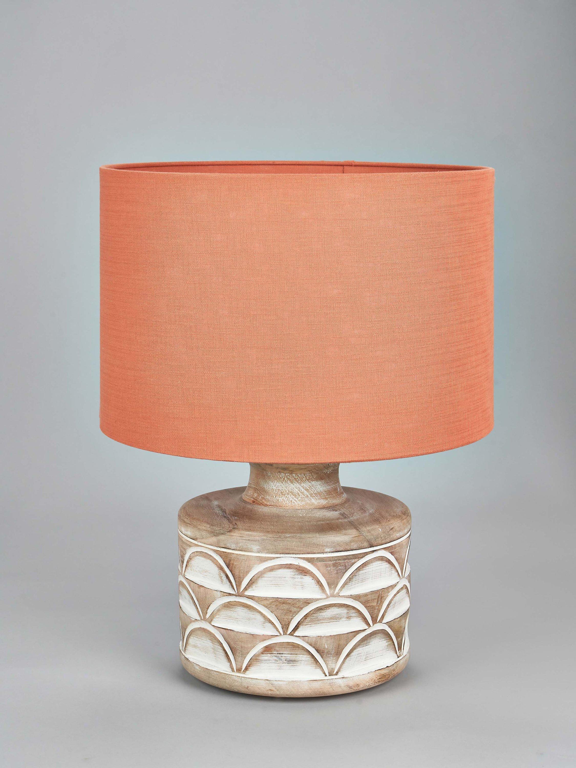 This wooden table lamp is a beautiful and natural addition to any home. It has a decorative embossed design that adds a unique touch to its simple yet sophisticated style. Topped with a lined, open weave lampshade that allows light to filter through.