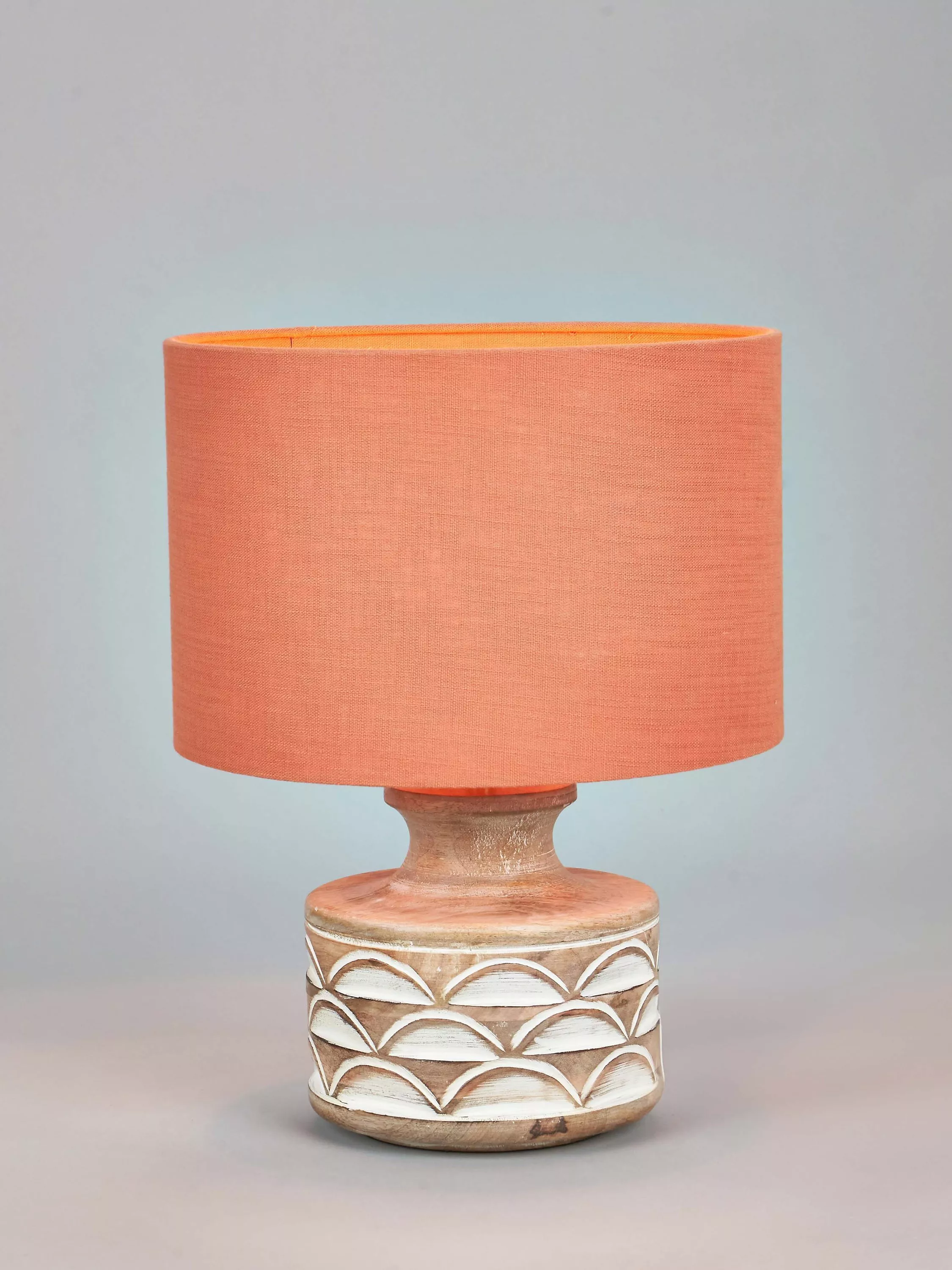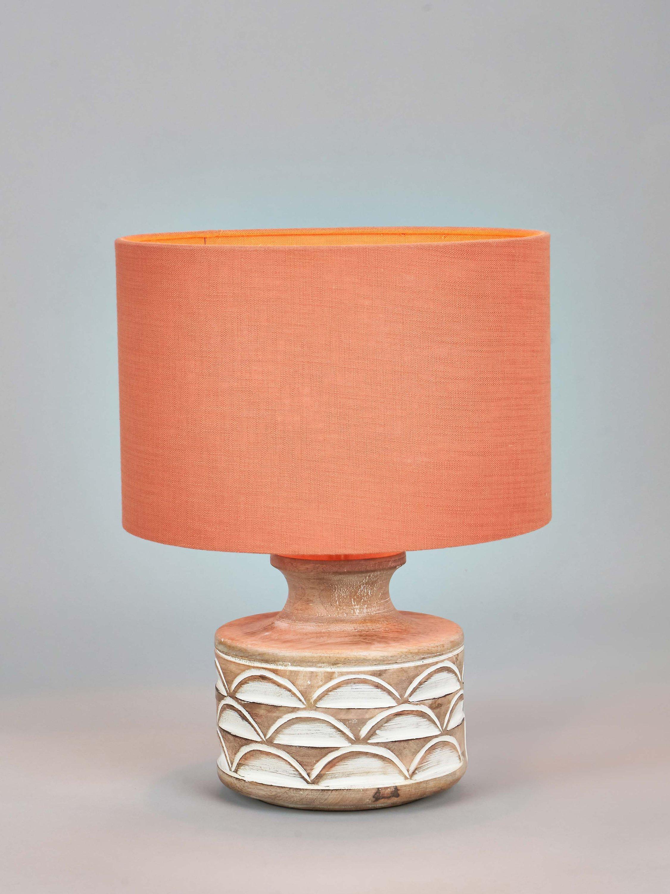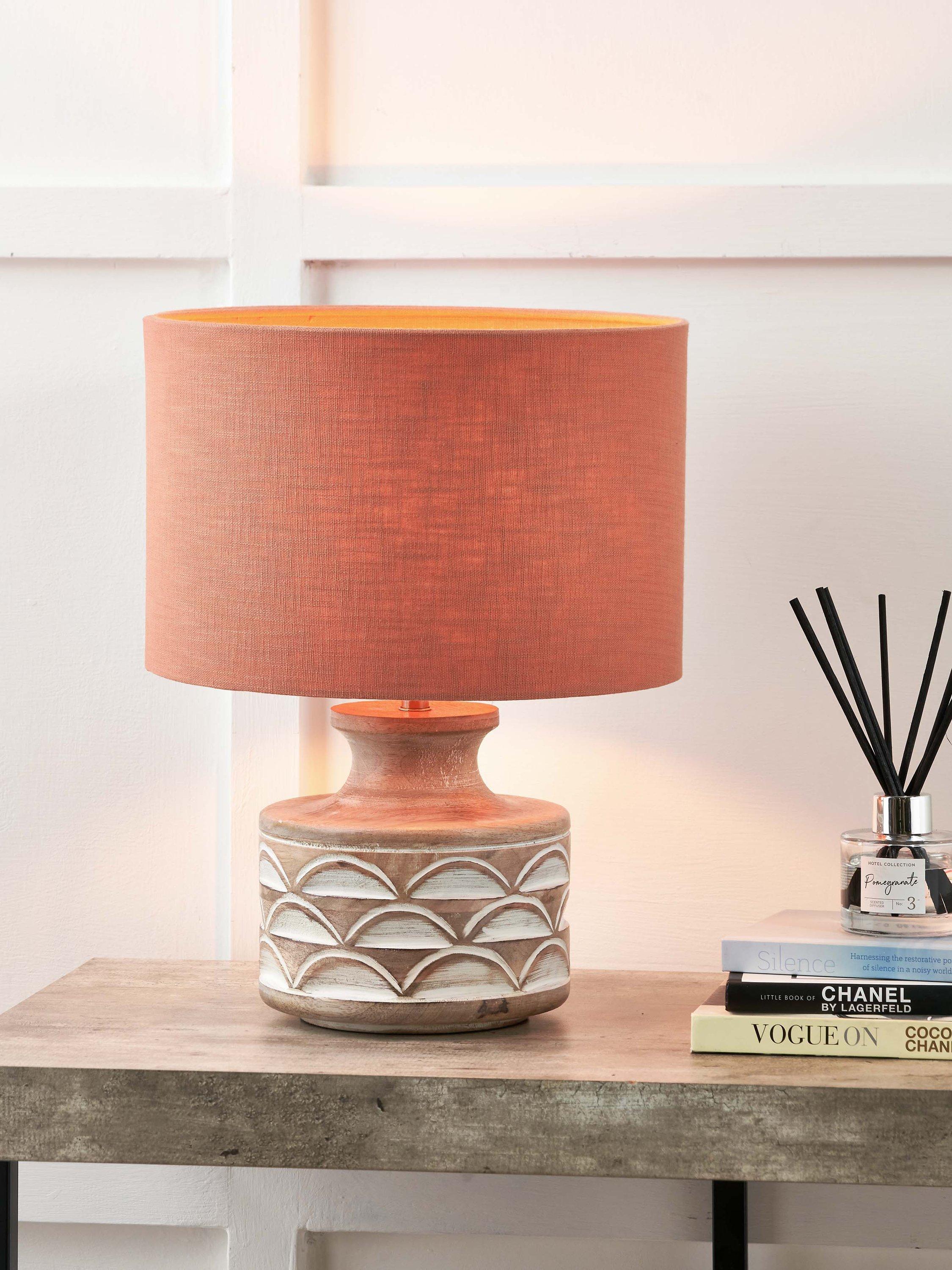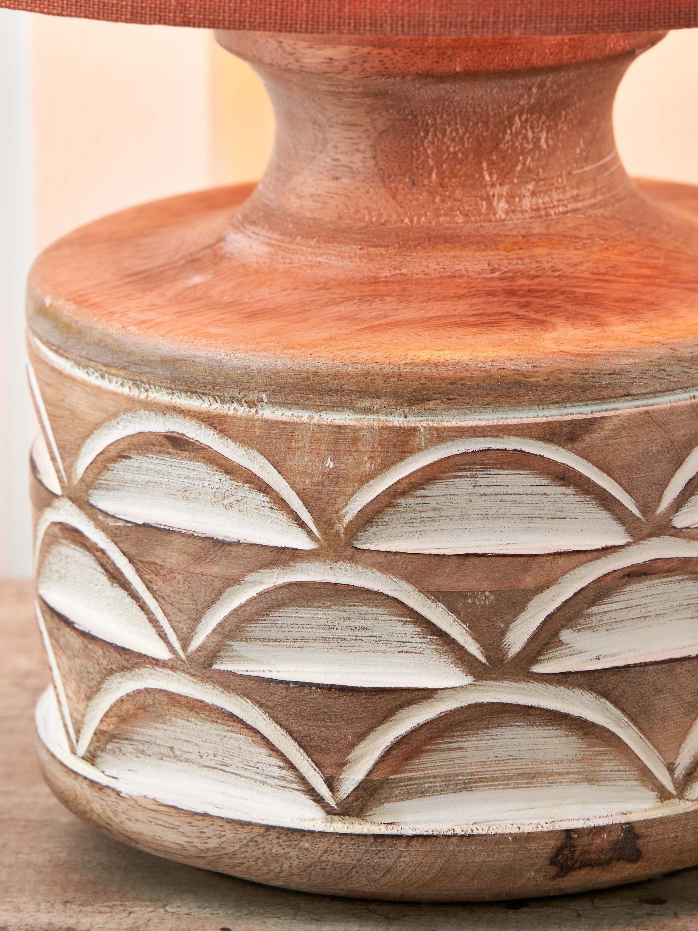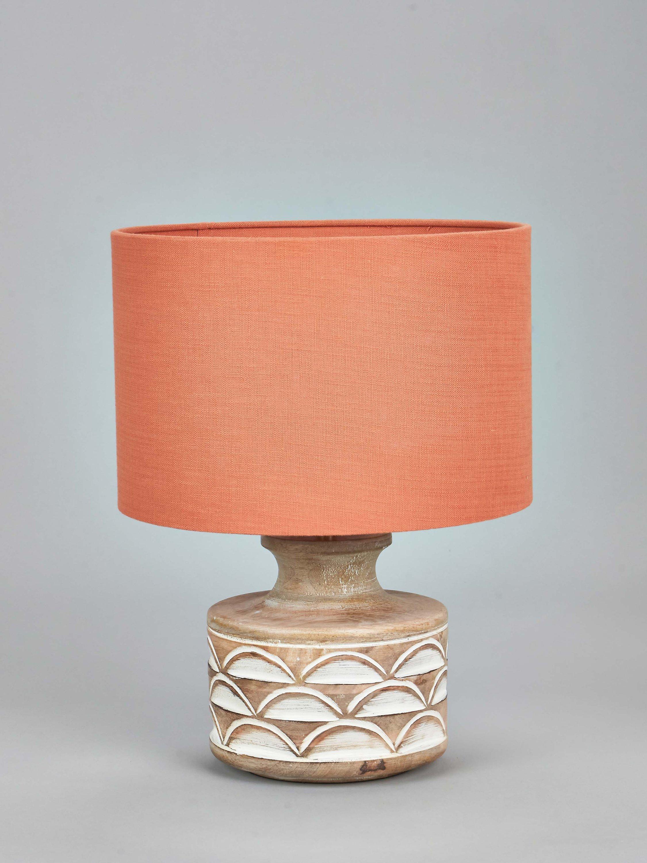 This wooden table lamp is a beautiful and natural addition to any home. It has a decorative embossed design that adds a unique touch to its simple yet sophisticated style. Topped with a lined, open weave lampshade that allows light to filter through.