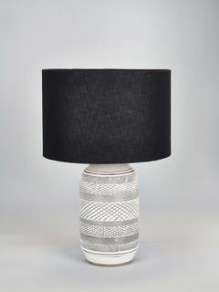 With a patterned surface created by skilled artisans in the Philippines, this stunning Kira stoneware table lamp will introduce a welcome tactility into your room. Topped with a lined, open weave lampshade that allows light to filter through.