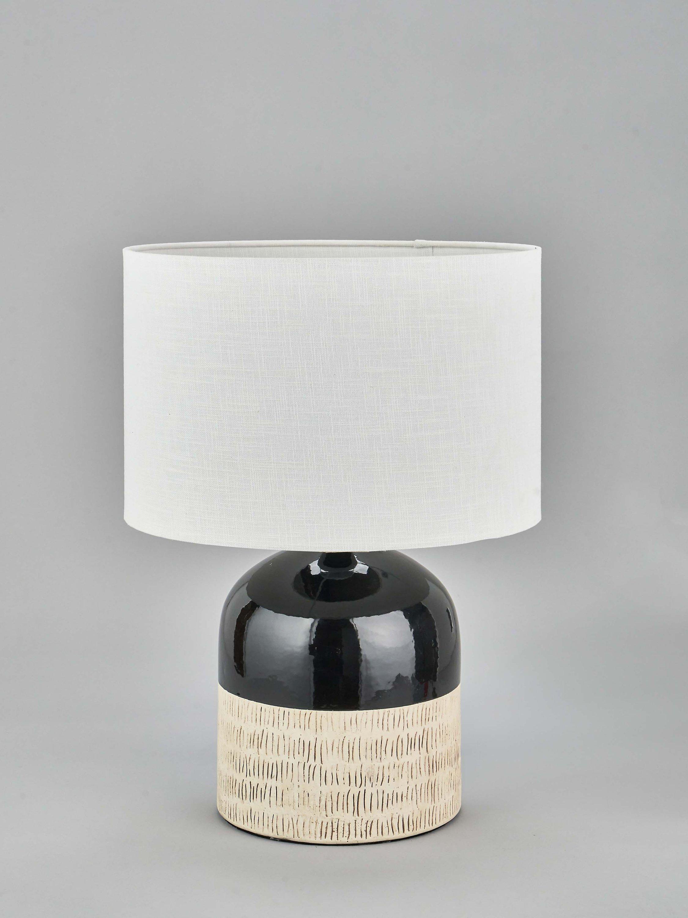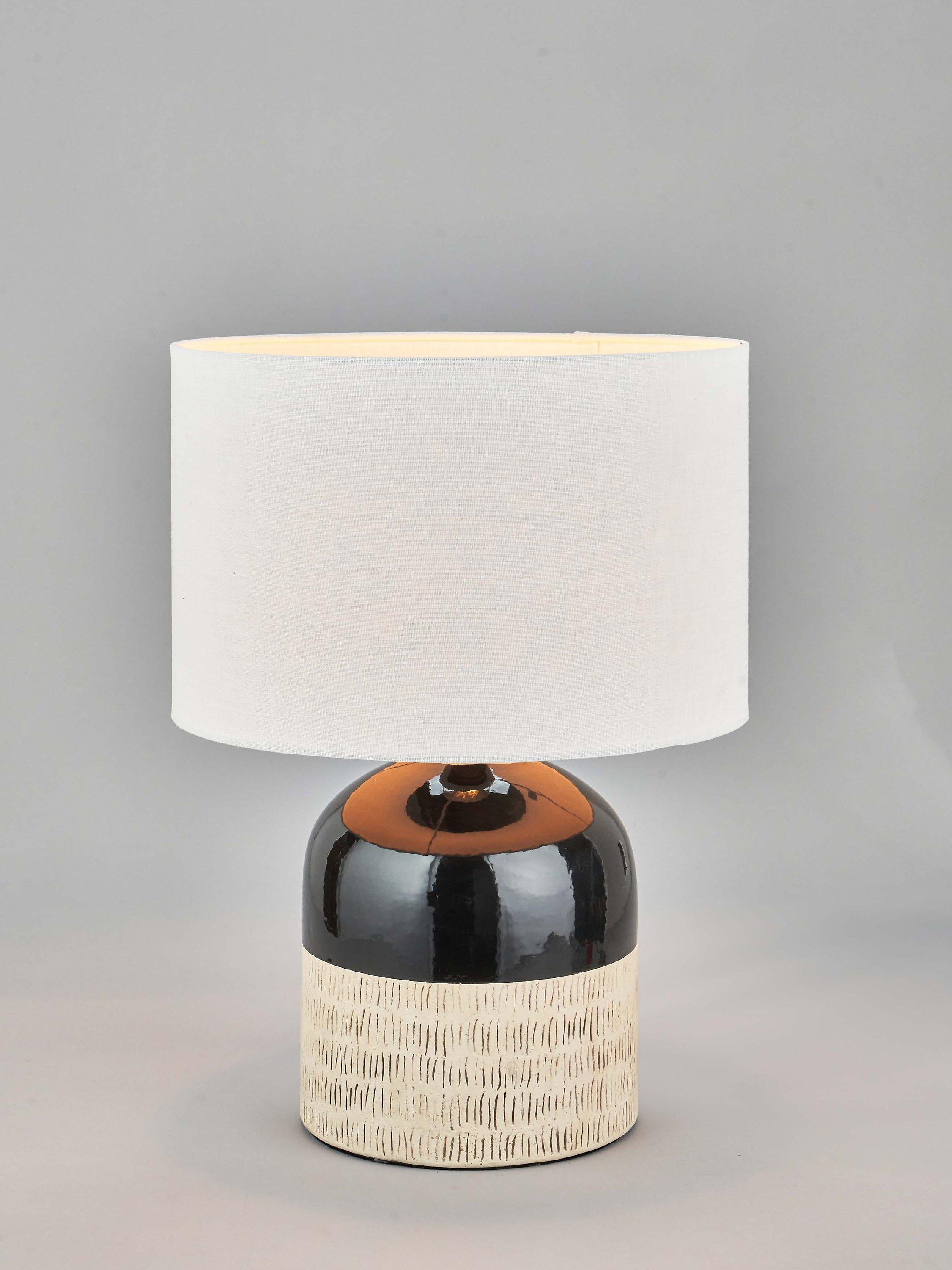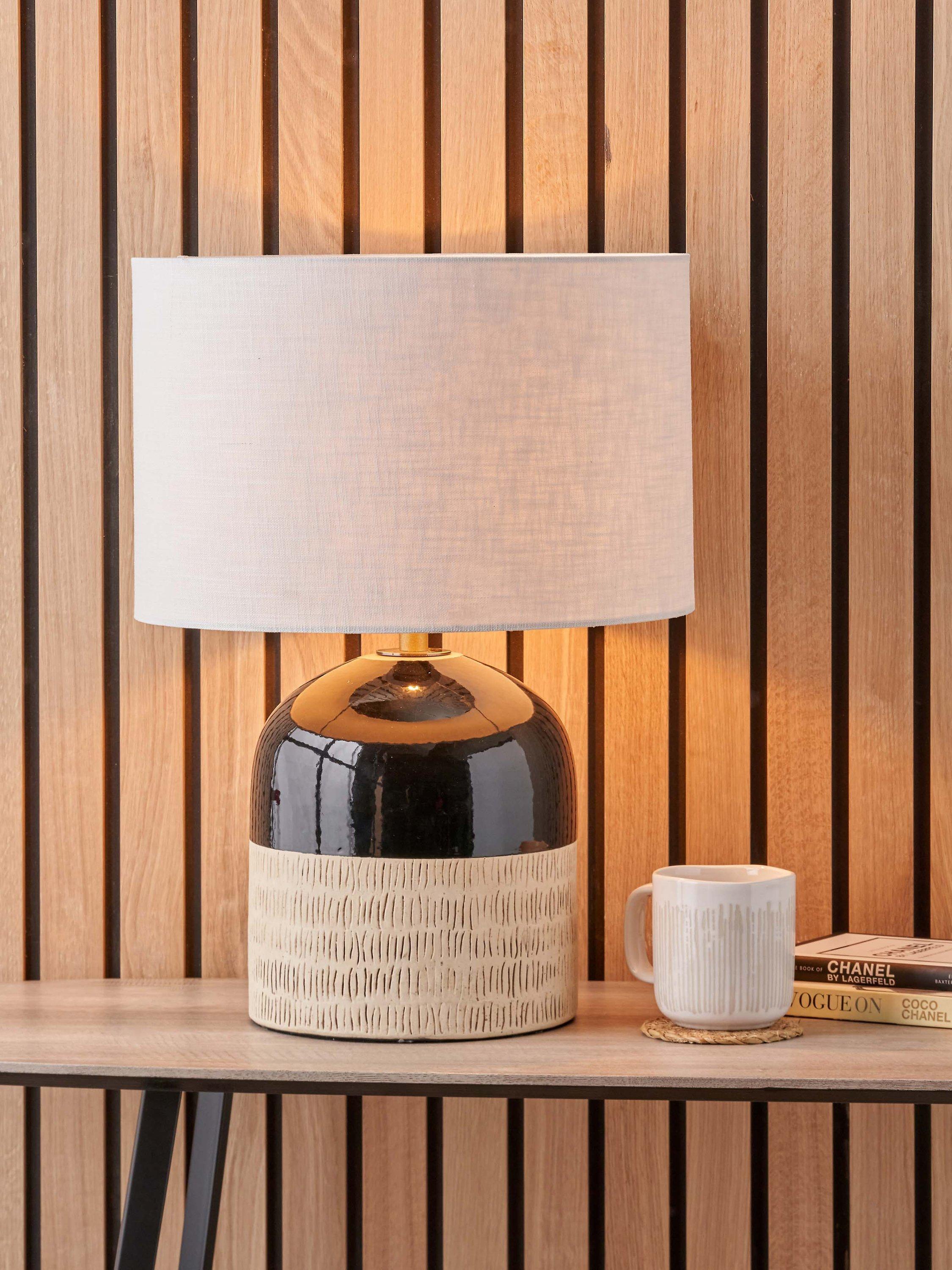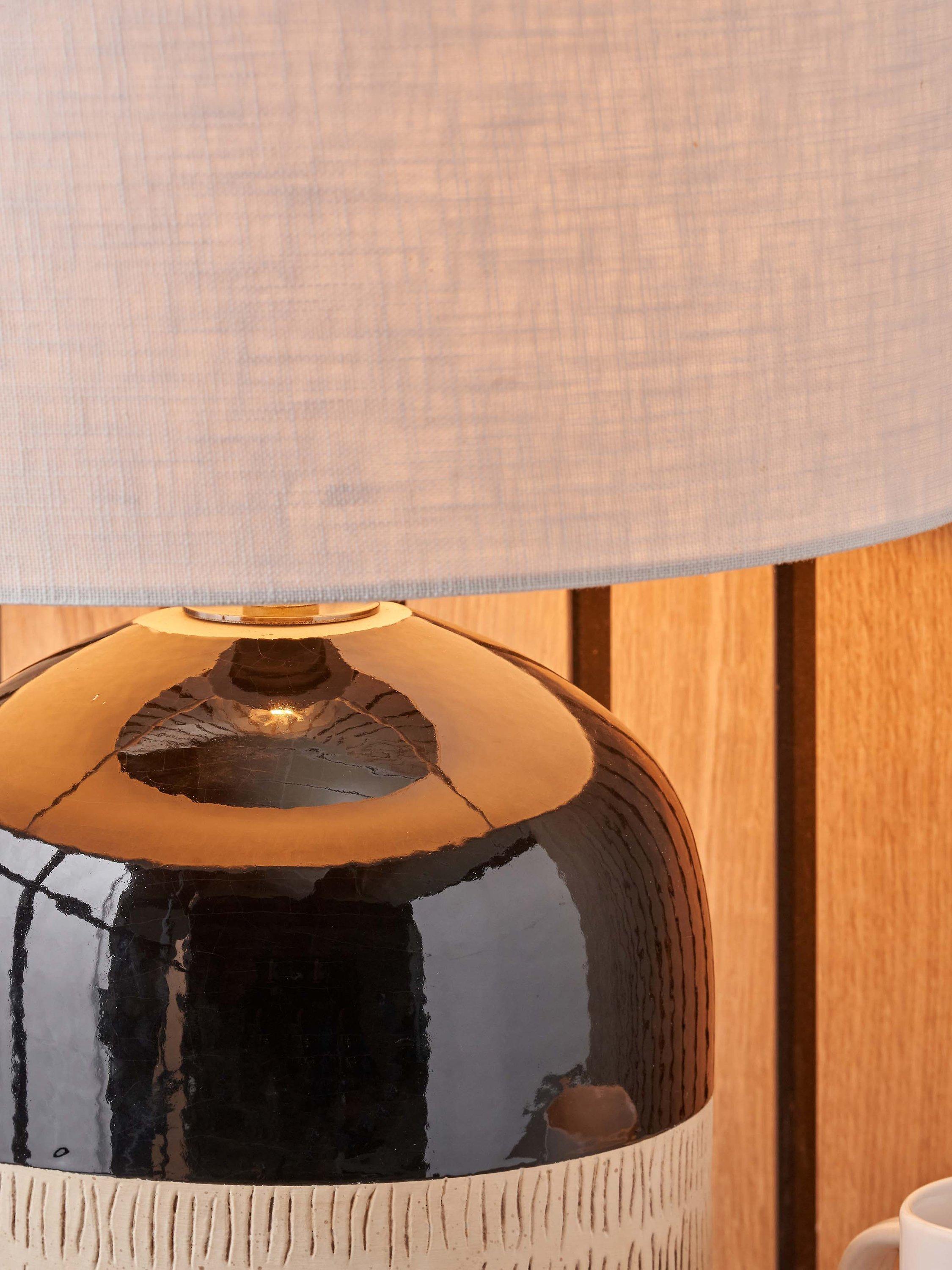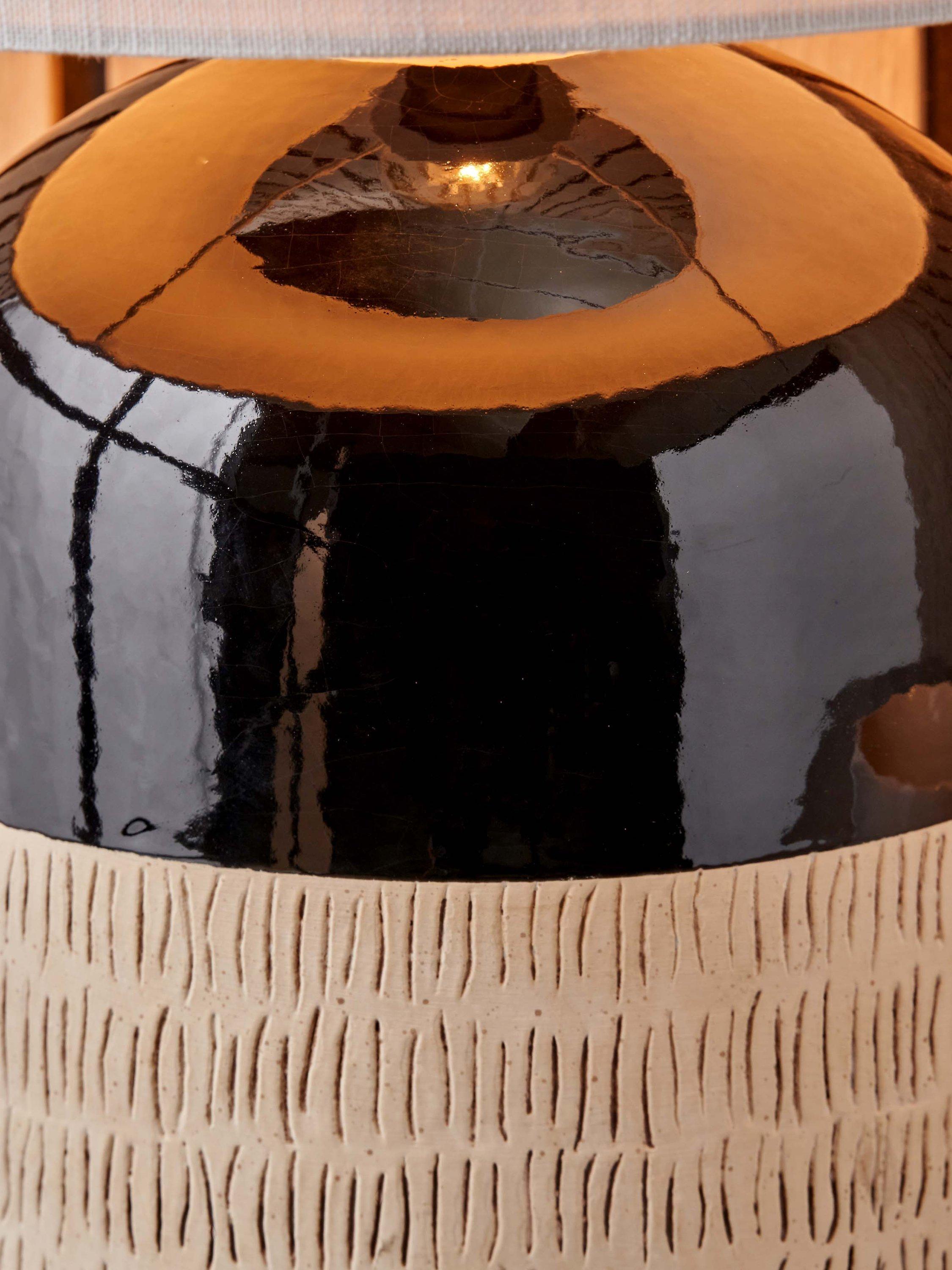 The scandi-inspired Lotta stoneware table lamp combines a hand applied textured natural finish with a contrasting gloss glaze. Made in the Philippines and topped with a lined, open weave lampshade that allows light to filter through.