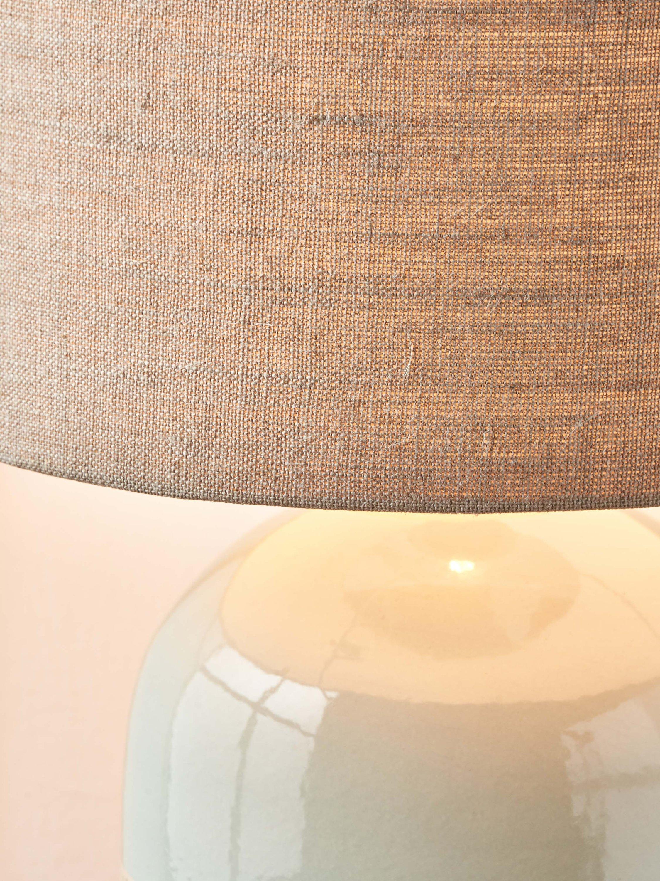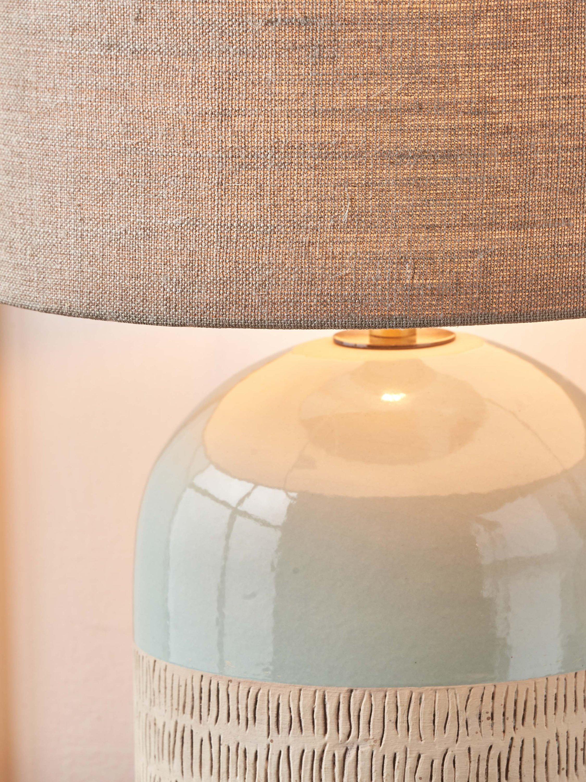 The scandi-inspired Lotta stoneware table lamp combines a hand applied textured natural finish with a contrasting gloss glaze. Made in the Philippines and topped with a lined, open weave lampshade that allows light to filter through.