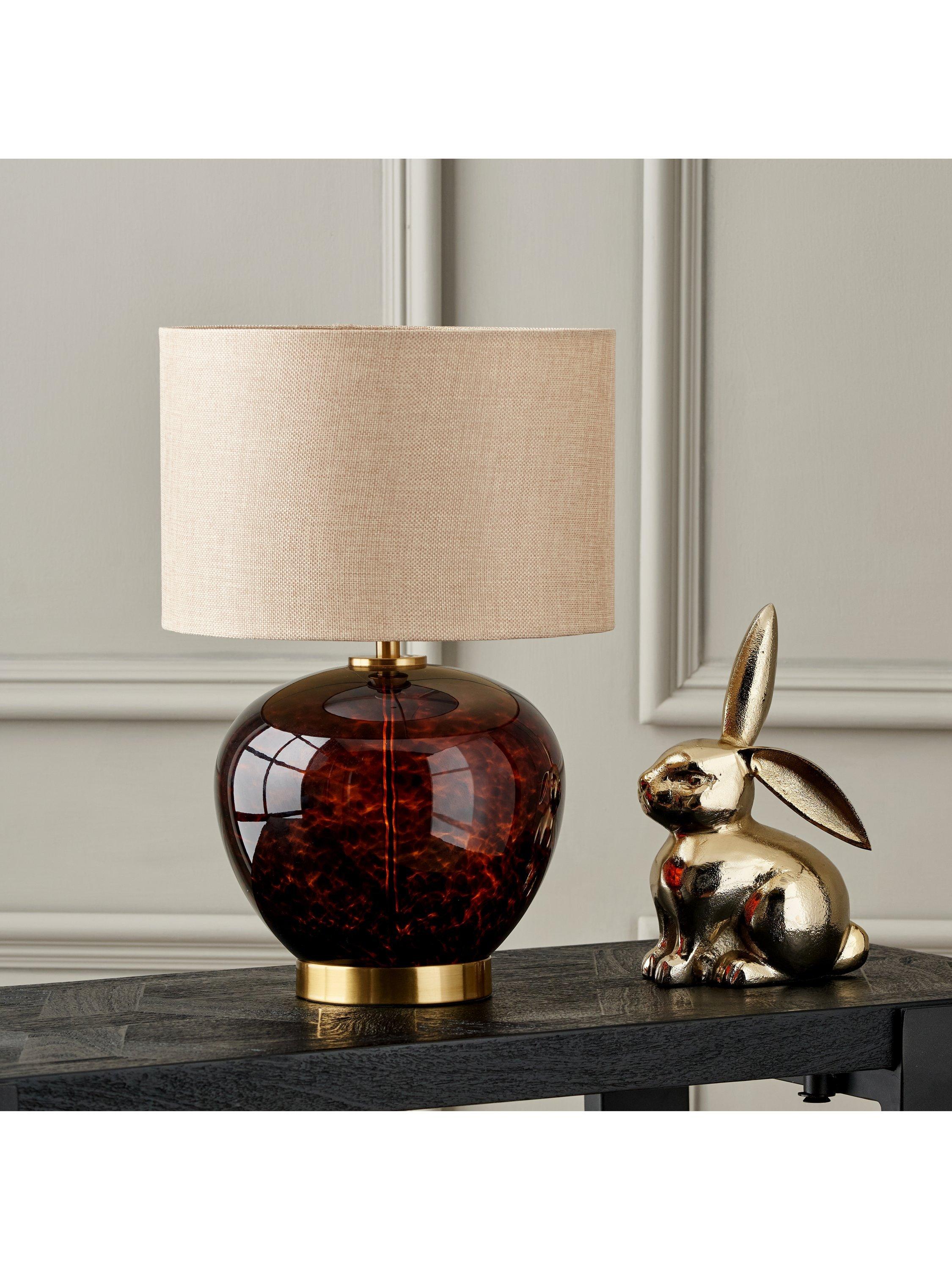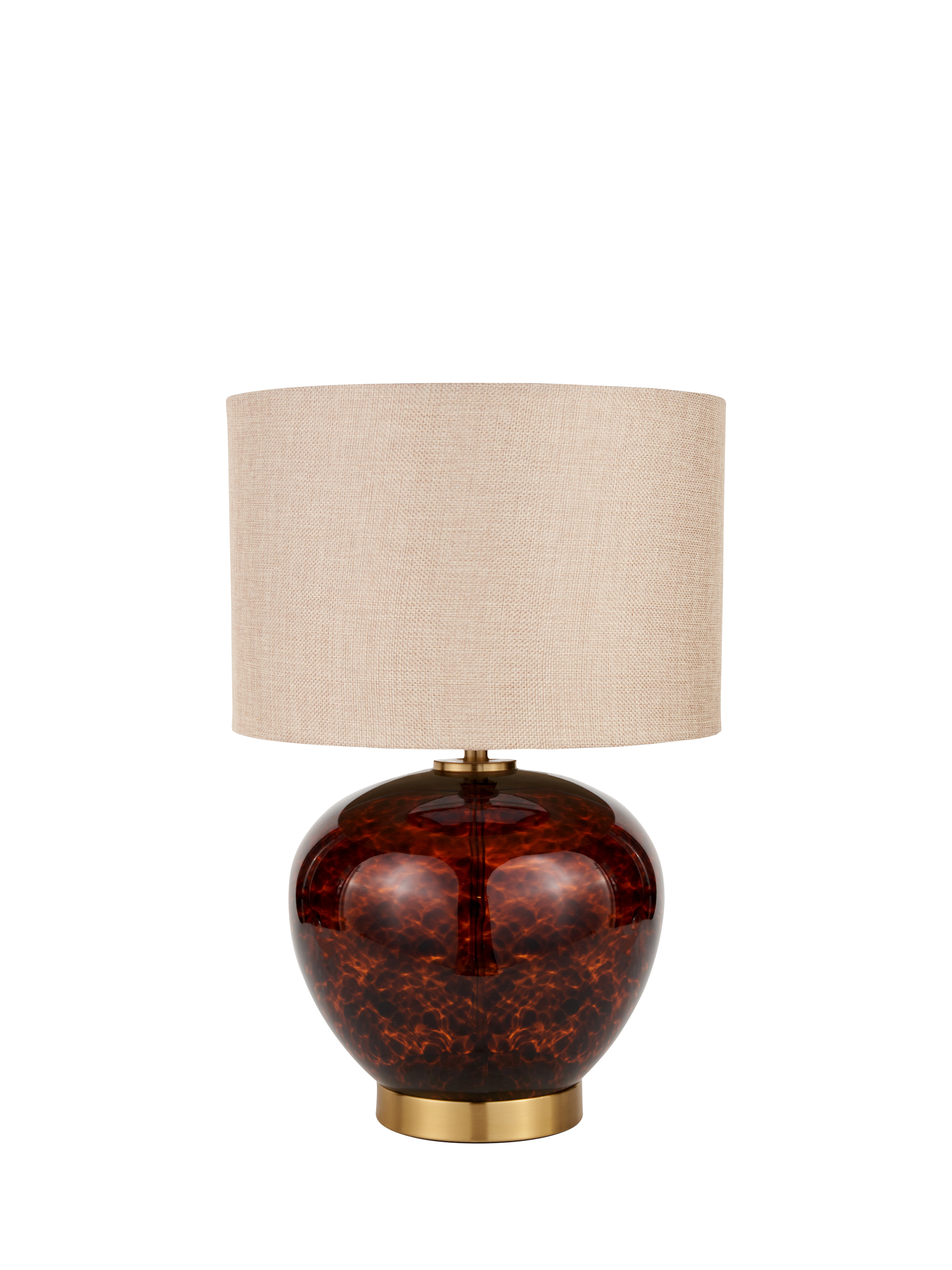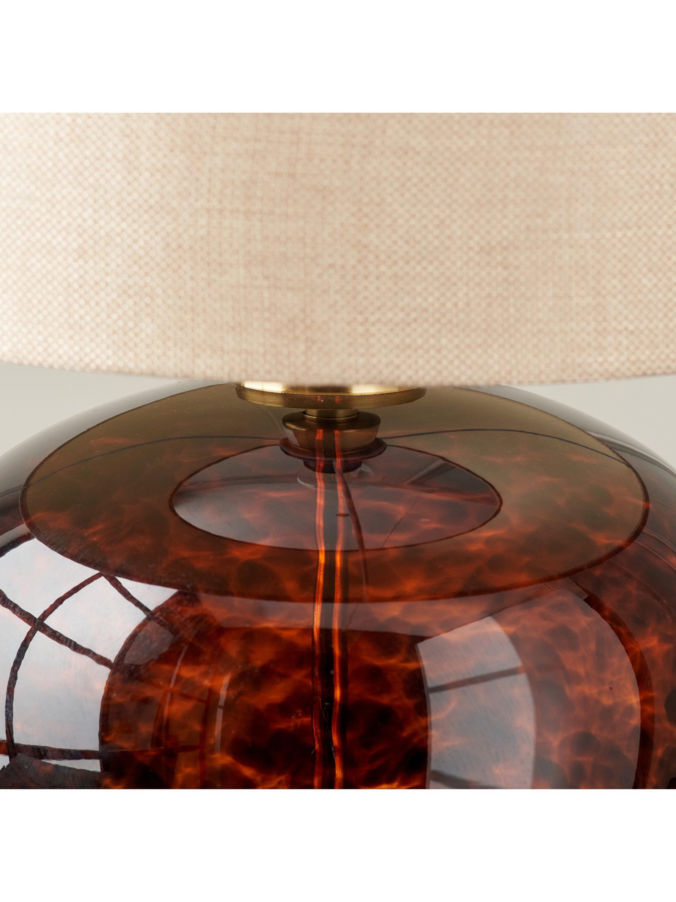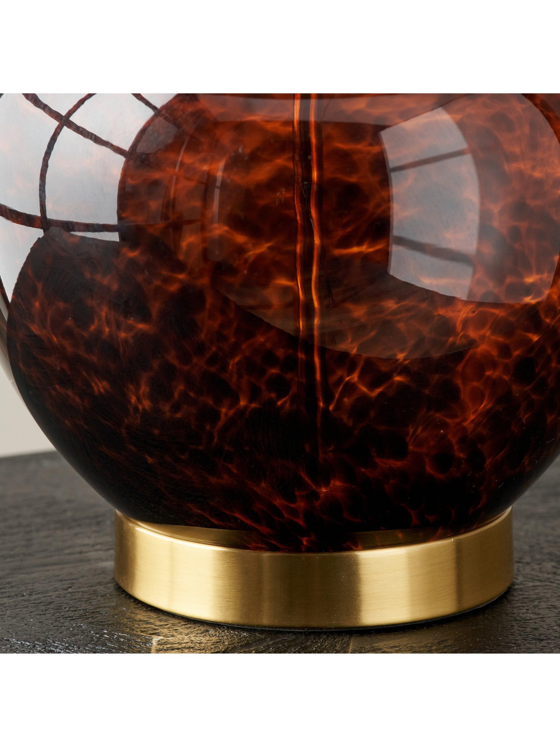 This striking glass table lamp is sure to make a statement with its on-trend tortoiseshell design, accentuated perfectly on its brushed finished base. The incredibly stylish, beautifully curved lamp base is adorned with a textured, self-lined cylinder shade.