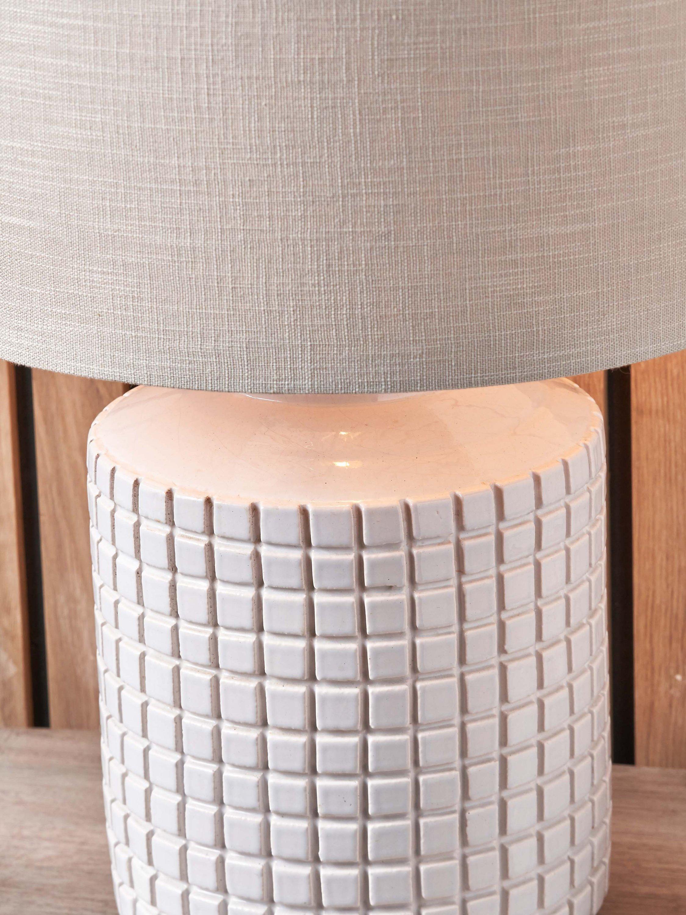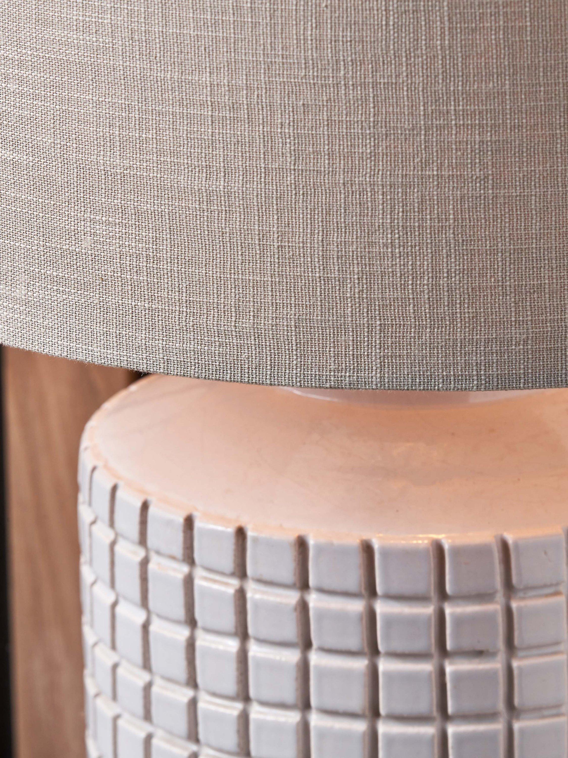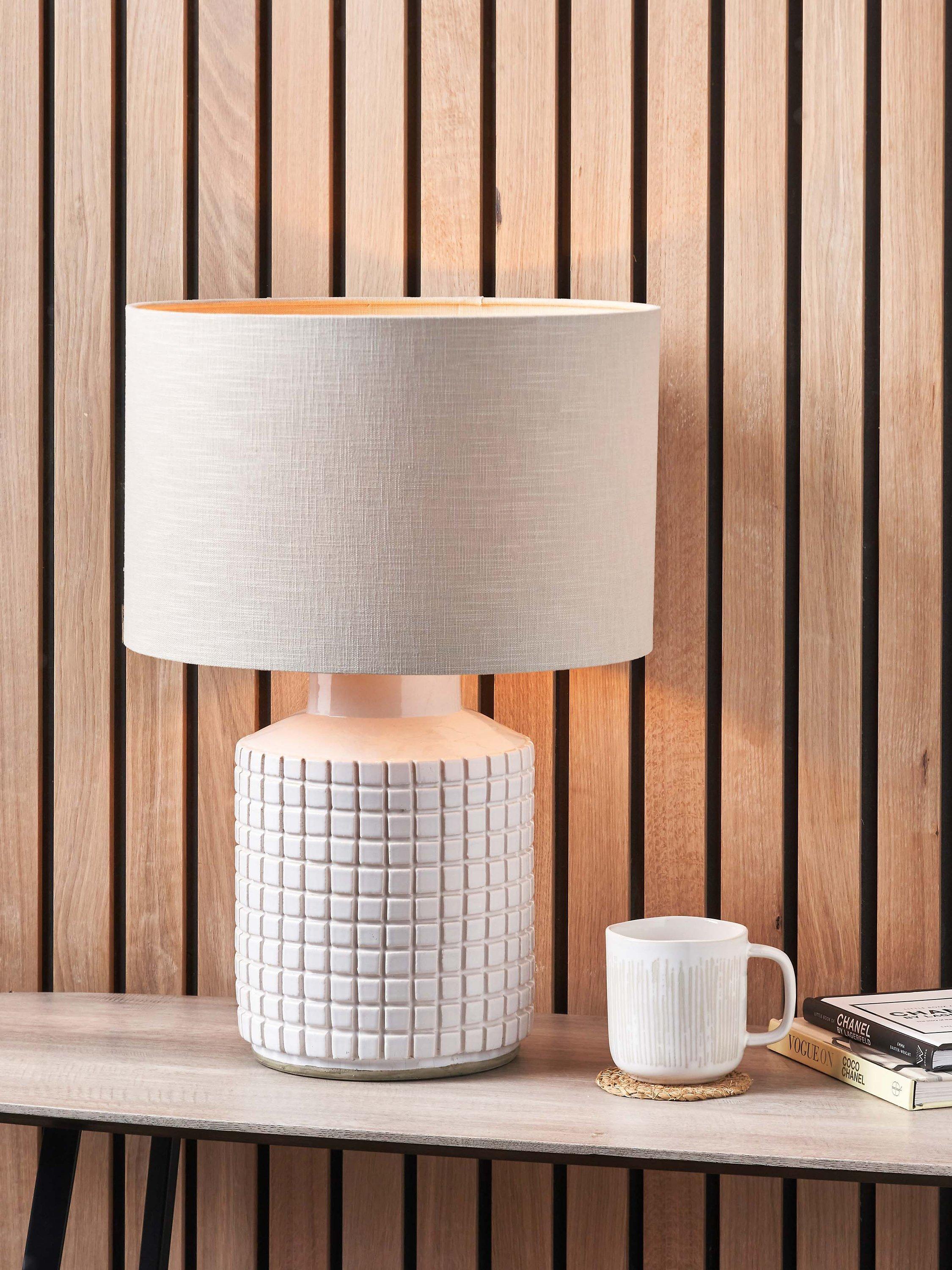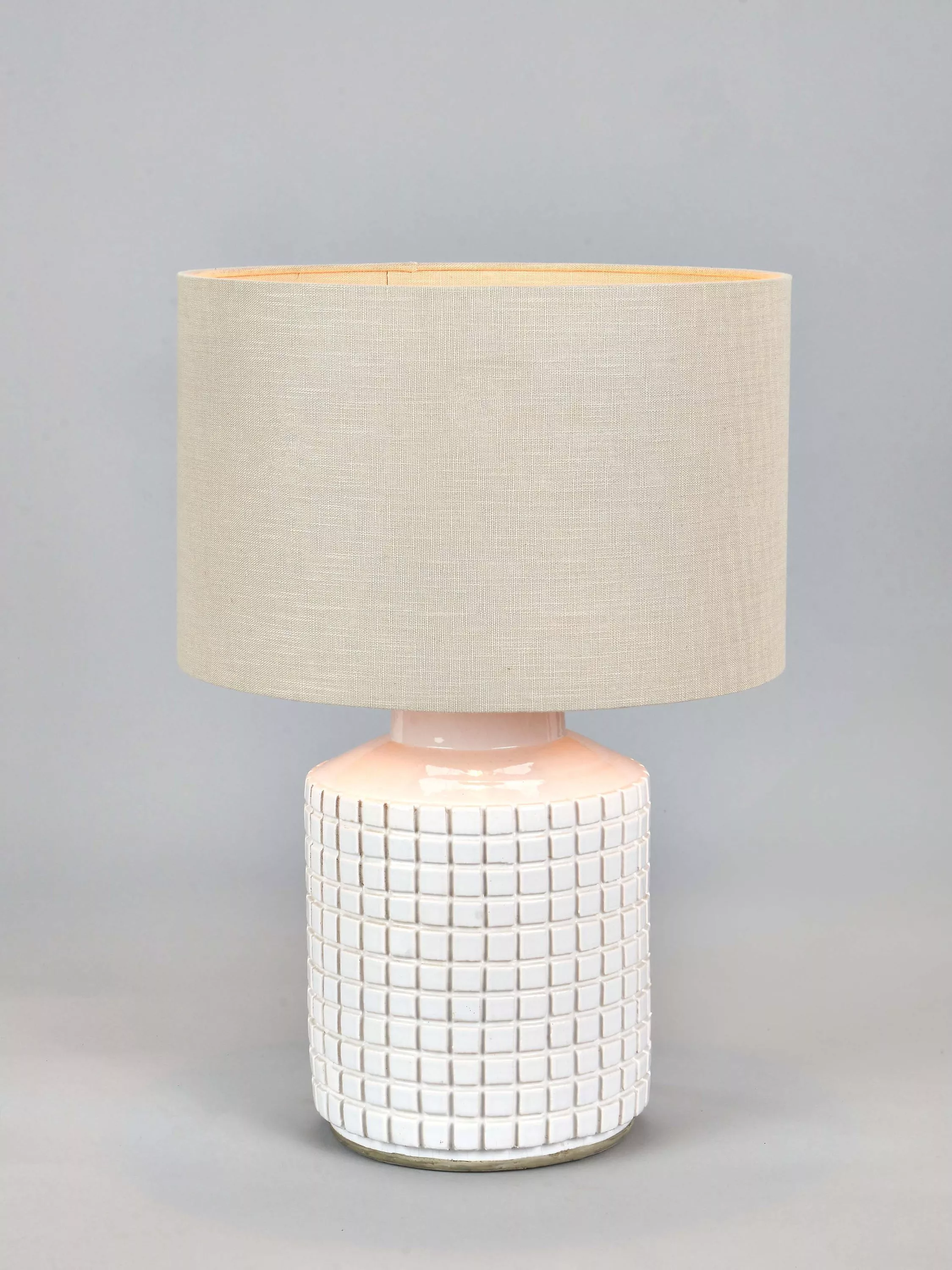The Malone stoneware table lamp showcases a contemporary geometric square texture, hand-finished in the Philippines. Made from stoneware and finished in a textured, semi-matte gloss. Complemented by a modern, open weave lampshade that allows light to filter through.
